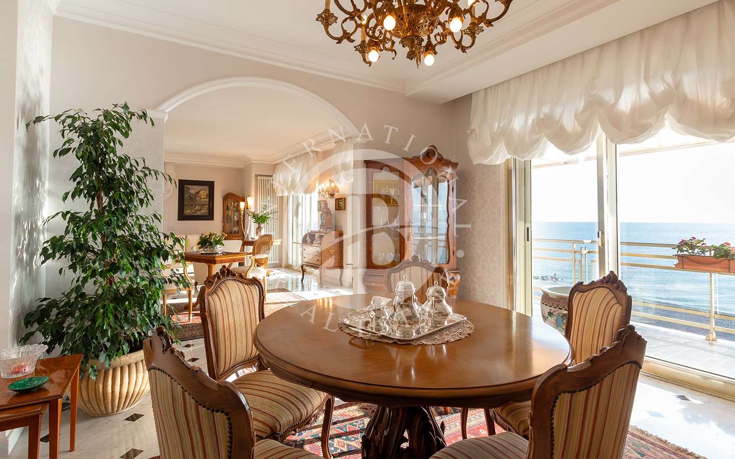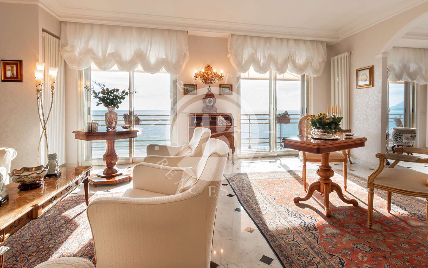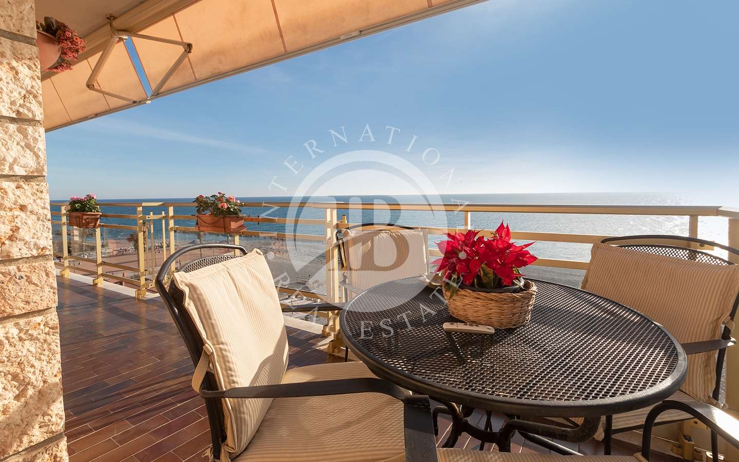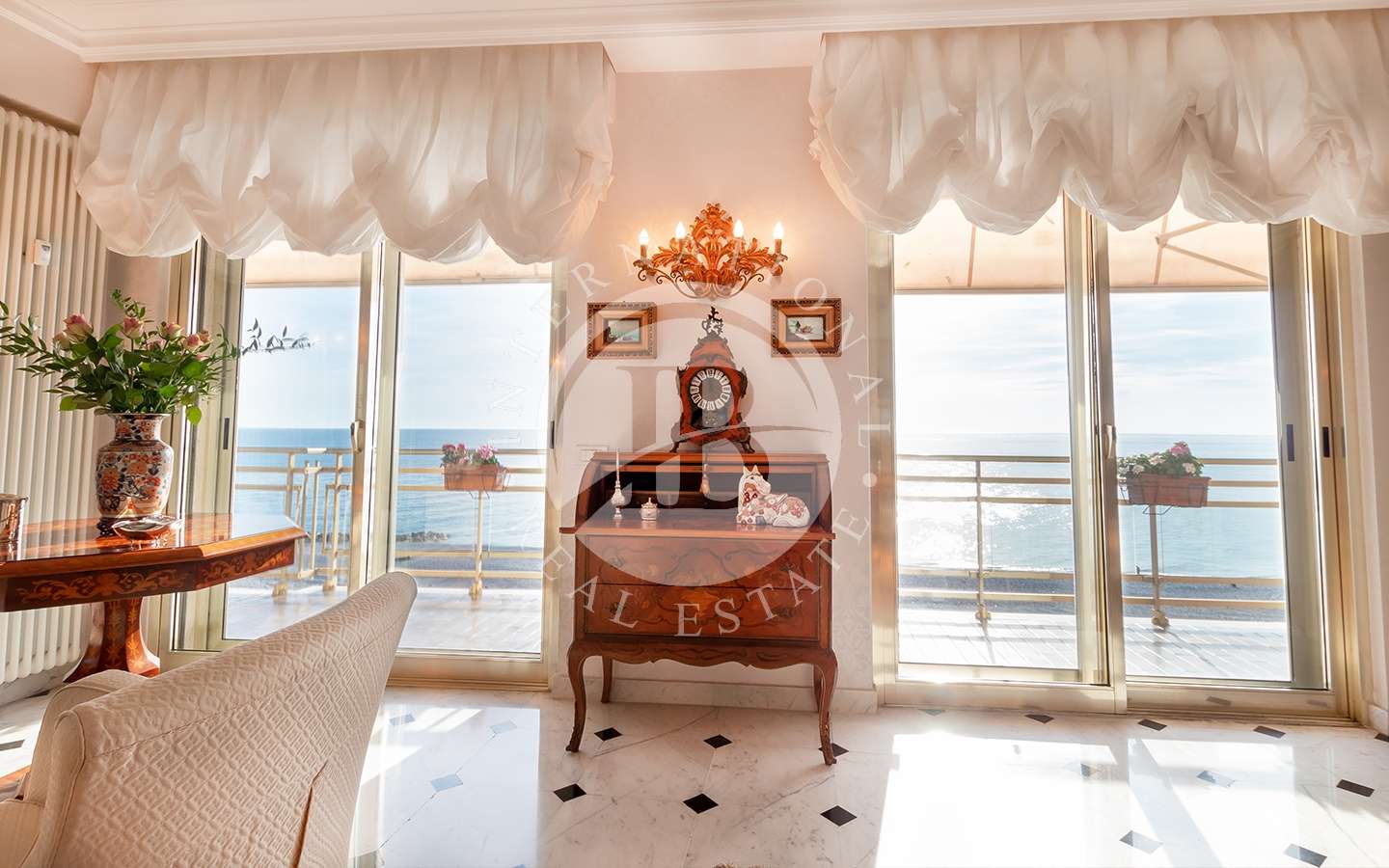 Sulla prima linea di costa, affacciato sul mare, si trova un esclusivo attico di circa 210 mq con un ampio terrazzo, offrendo una vista panoramica sul mare, la Costa Azzurra e il Principato di Monaco. L'immobile, situato al sesto piano di un condominio servito da ascensore, si compone di: un ingresso luminoso, un ampio salone con splendide vetrate panoramiche aggettanti sul mare, un accogliente soggiorno con camino e accesso al terrazzo, una cucina completamente attrezzata con accesso al terrazzo, la sala da pranzo con vista mare, due…