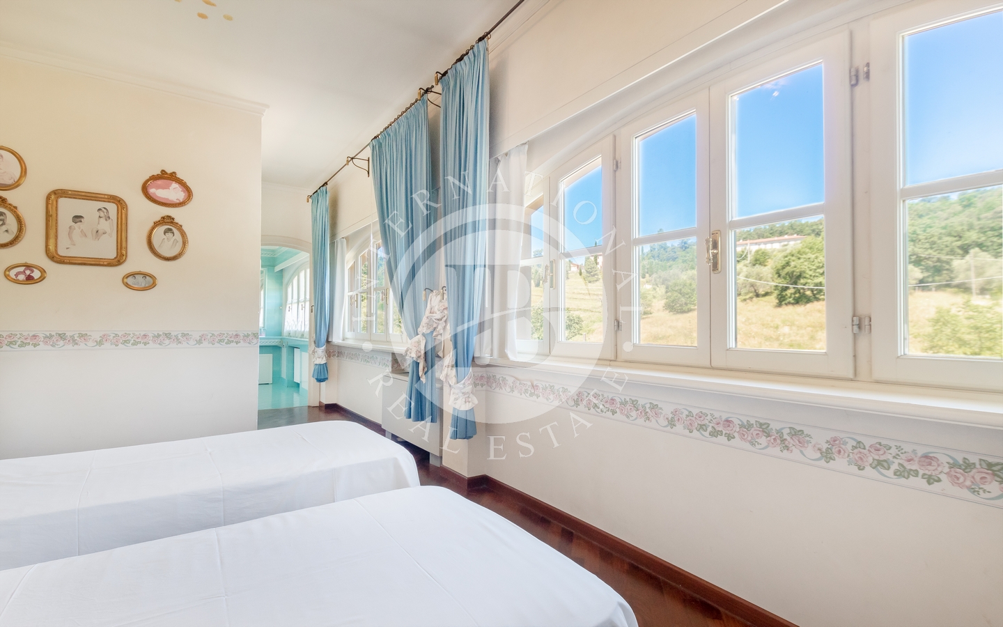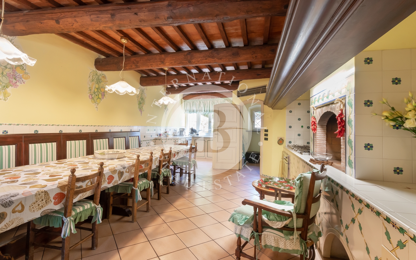 Una scala conduce ad un'altra zona notte al piano superiore, composta da due camere da letto con bagno en-suite. Il piano sottostante ospita una spaziosa cucina completamente attrezzata, con un grande tavolo e un camino, e accesso diretto a una zona pranzo esterna. Inoltre, troviamo un bagno, un disimpegno e tre camere da letto, di cui una di servizio con bagno en-suite, e un'ampia sala versatile da utilizzare a seconda delle preferenze.