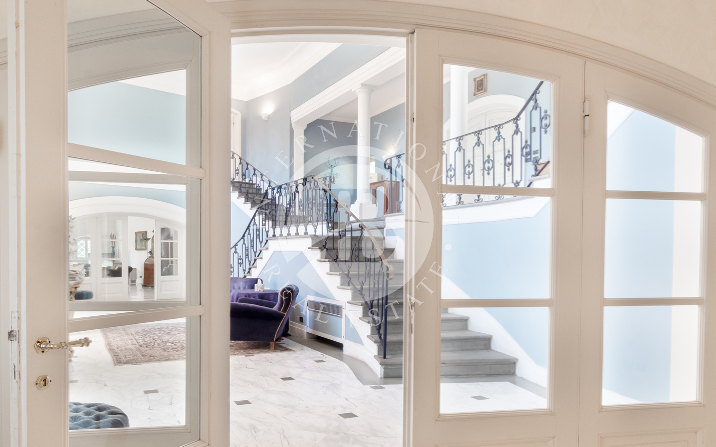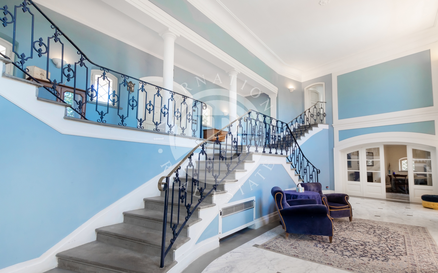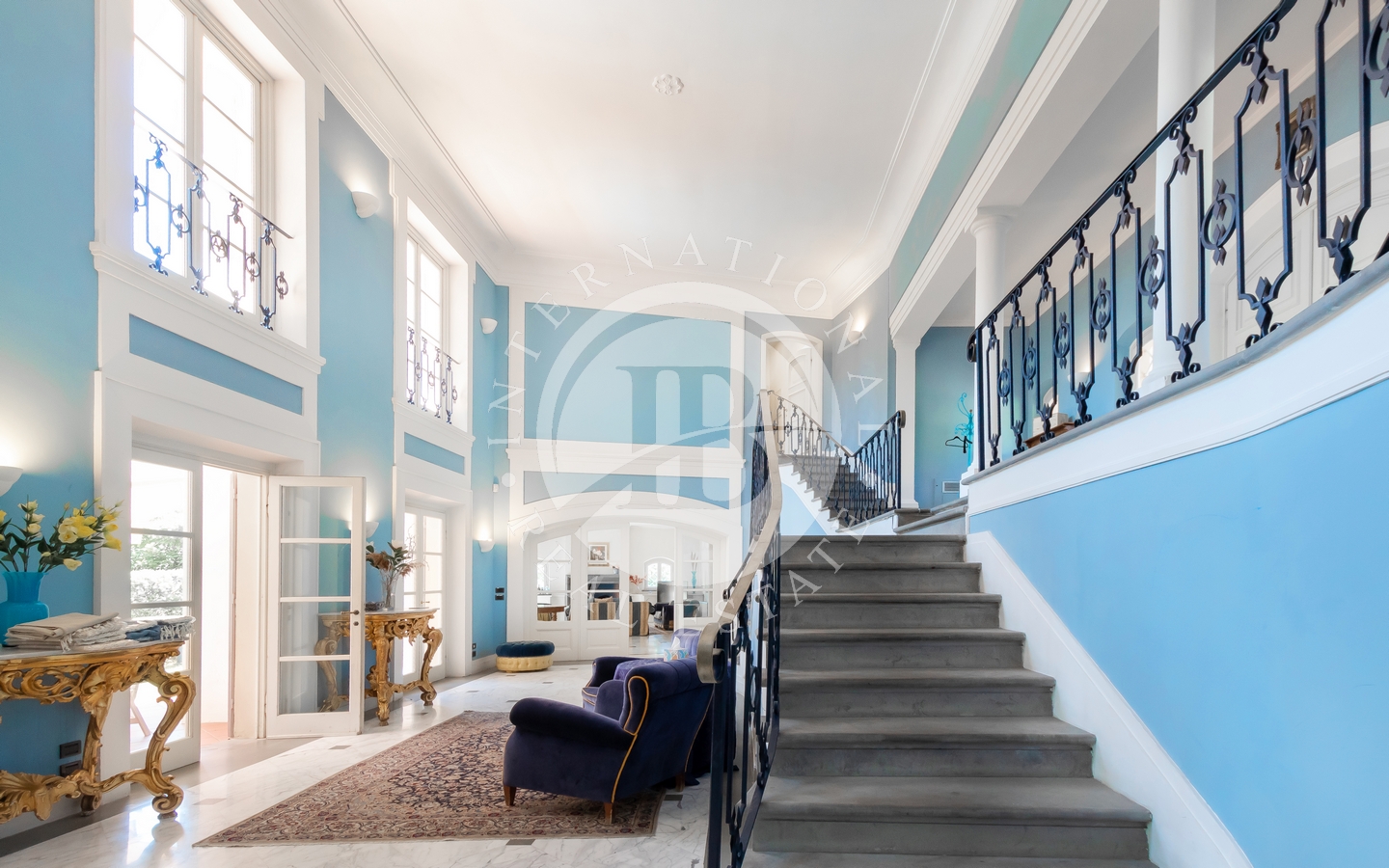 L'ingresso principale avviene attraverso un ampio salone di rappresentanza, sormontato da una maestosa scalinata doppia. Il salone centrale, ampio e luminoso, si affaccia direttamente sulla piscina, mentre ai lati si trovano due spaziose stanze: una adibita a sala da pranzo con camino e l'altra a soggiorno, anch'essa con camino.