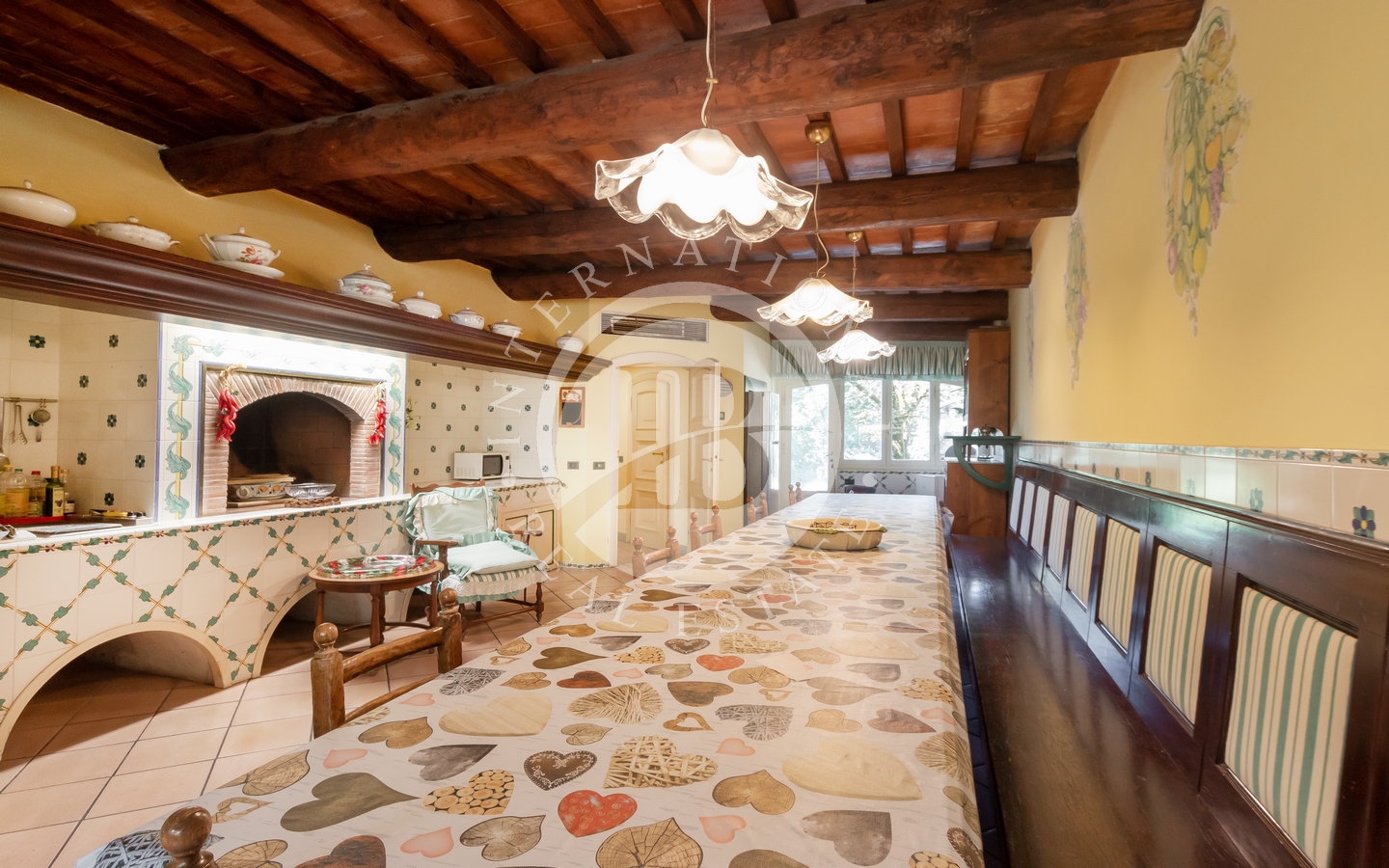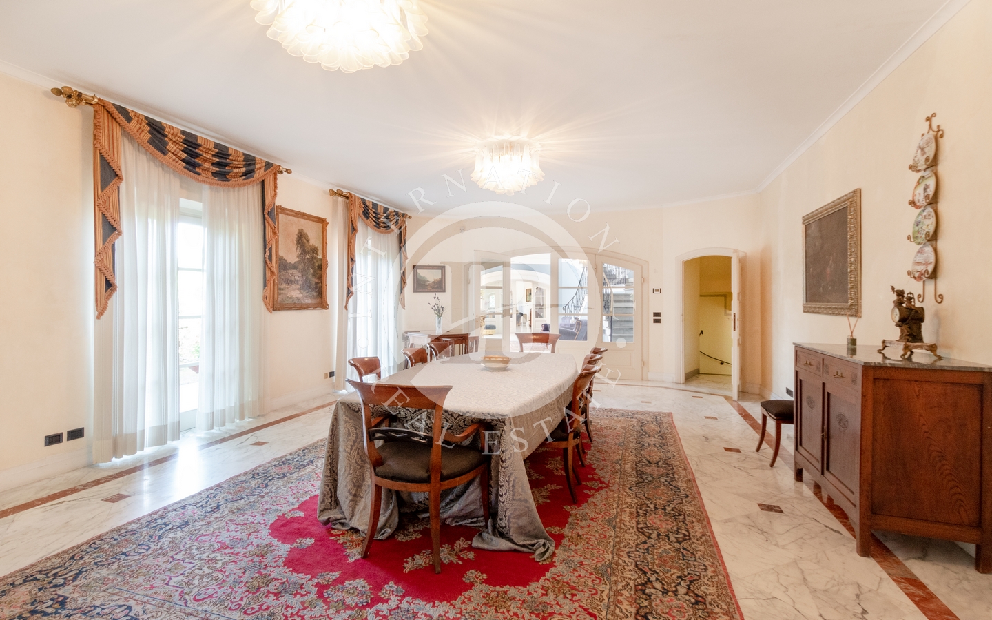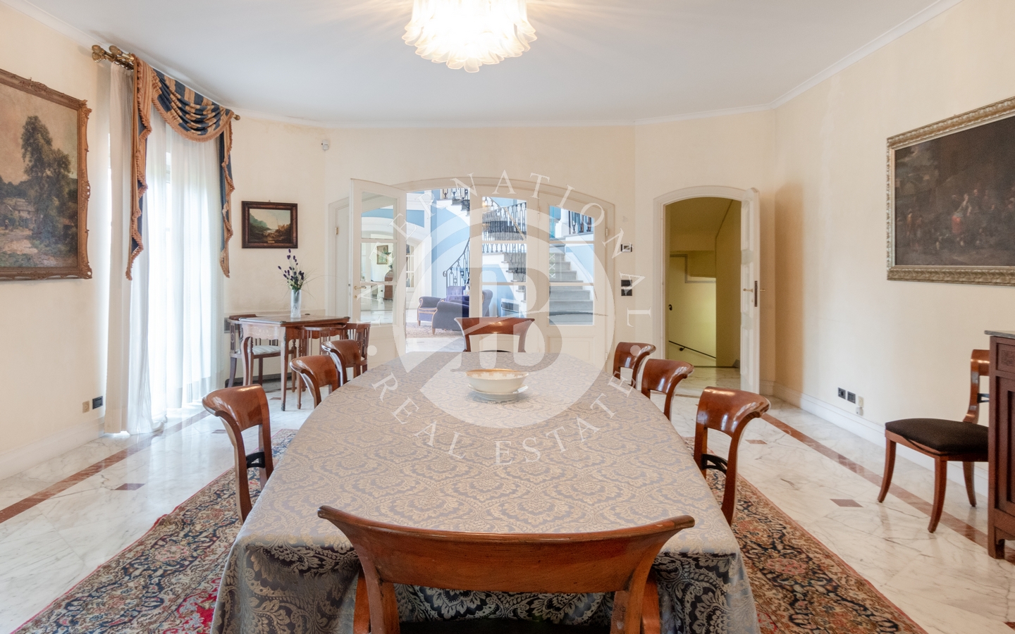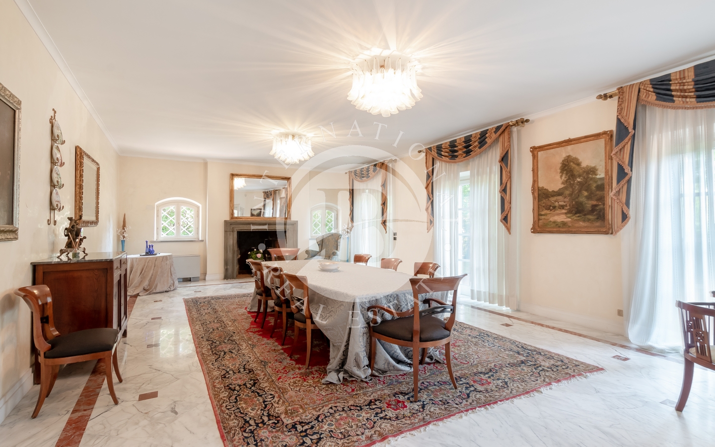L'ingresso principale avviene attraverso un ampio salone di rappresentanza, sormontato da una maestosa scalinata doppia. Il salone centrale, ampio e luminoso, si affaccia direttamente sulla piscina, mentre ai lati si trovano due spaziose stanze: una adibita a sala da pranzo con camino e l'altra a soggiorno, anch'essa con camino.