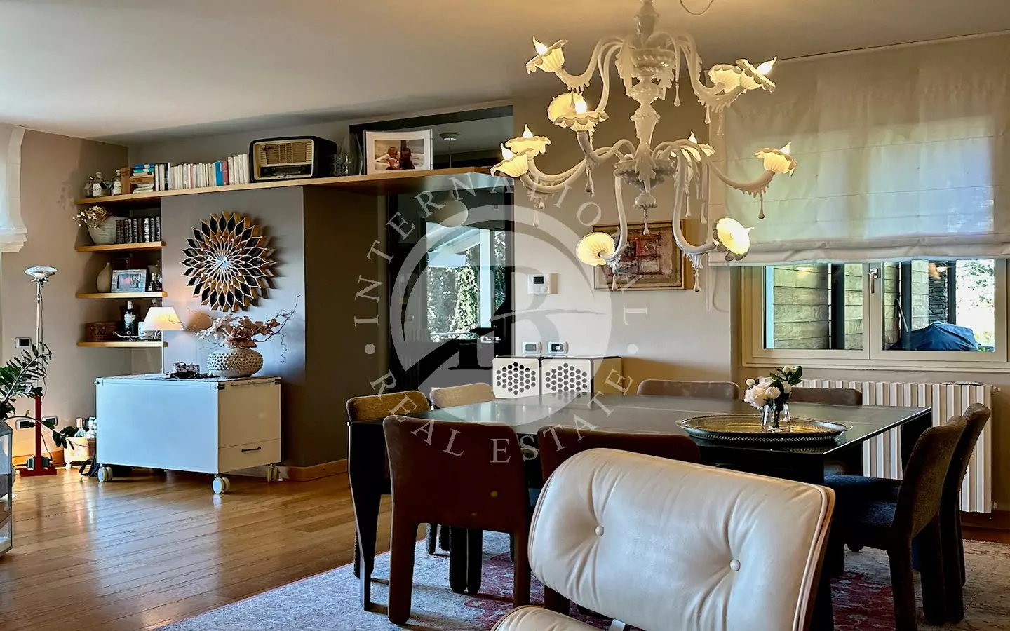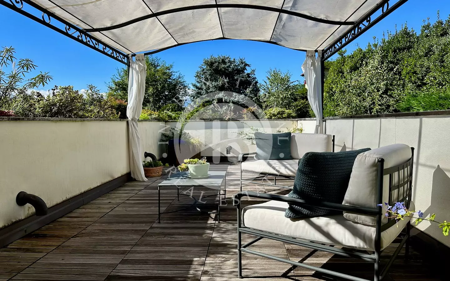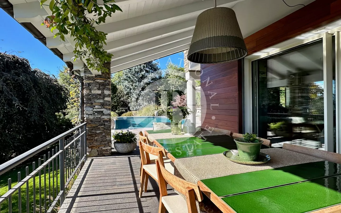 Il giardino curato si estende per circa 1.100 mq, arricchito da una piscina di recente costruzione con acqua salata color verde smeraldo e bordo in doghe, perfetto per prendere il sole in assoluto relax. La zona esterna è completata da arredi Unopiù con ombrelloni e poltrone di design.
