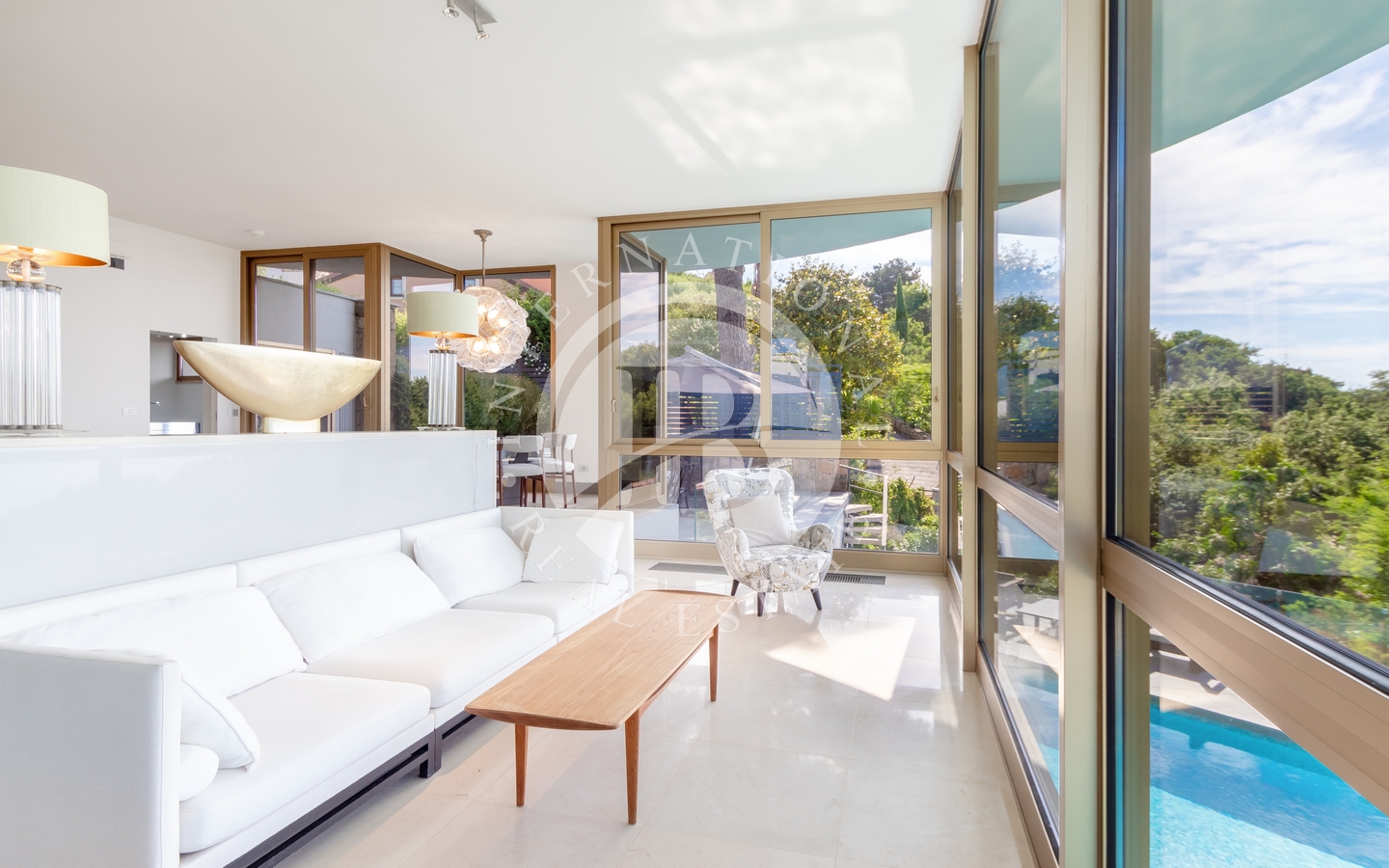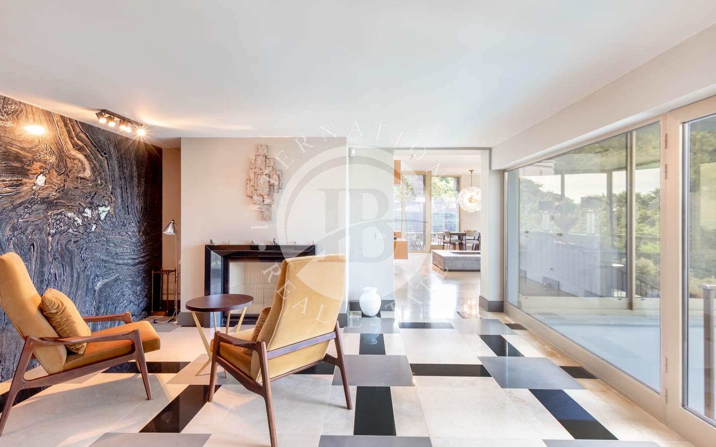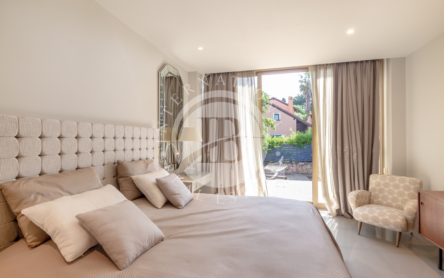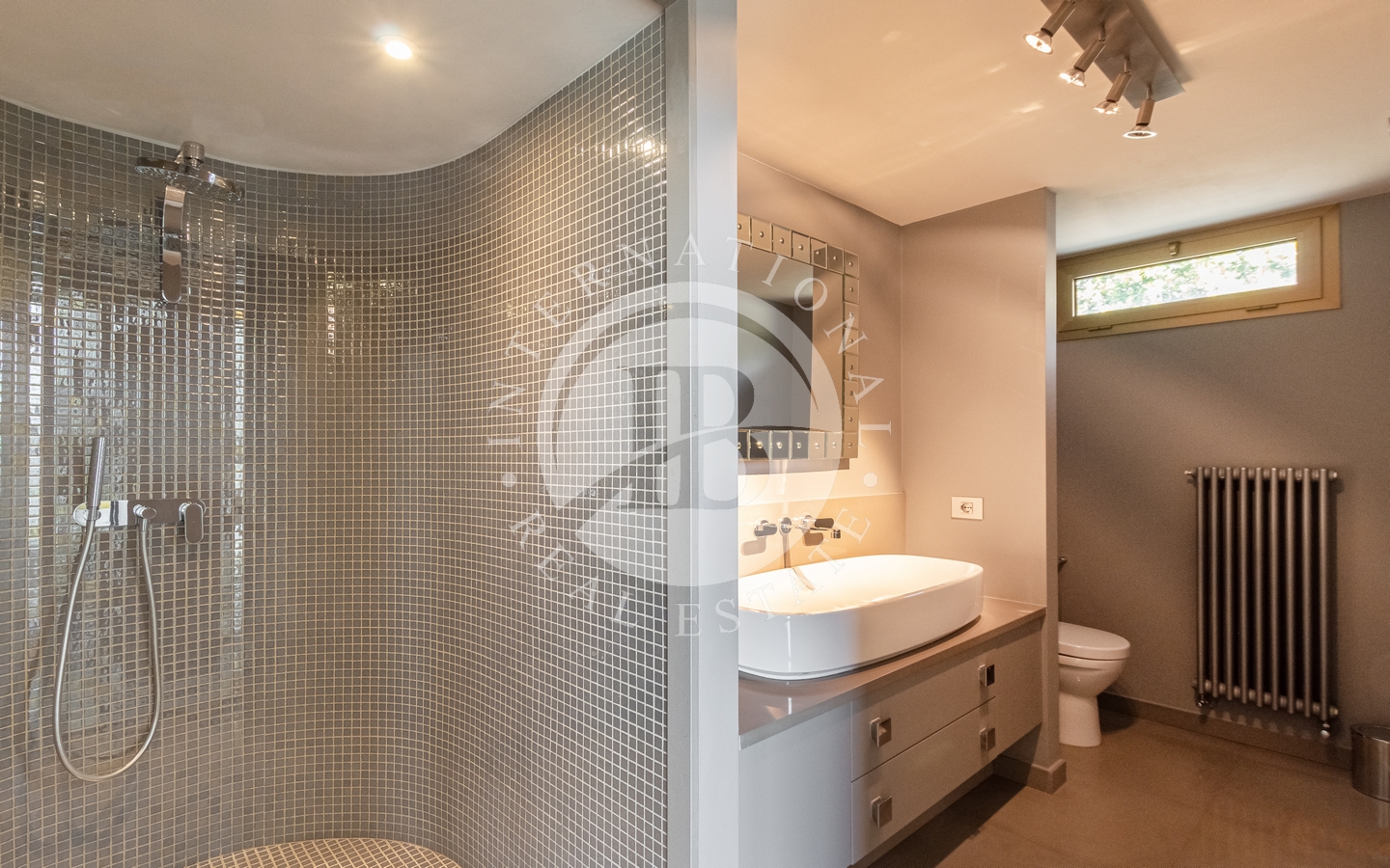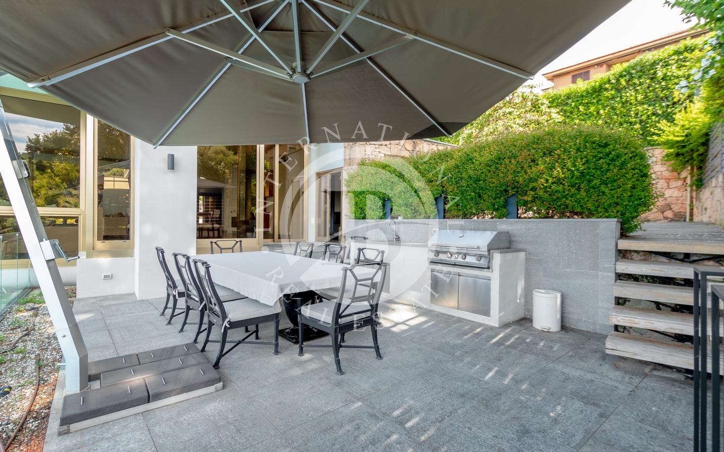 La villa dispone di un appartamento indipendente al pianterreno con ingresso privato, cucina, servizi e camera da letto. Gli interni, firmati dalla designer Larissa Romanova, sono caratterizzati da arredi su misura e materiali di altissima qualità, creando ambienti esclusivi e di grande fascino.