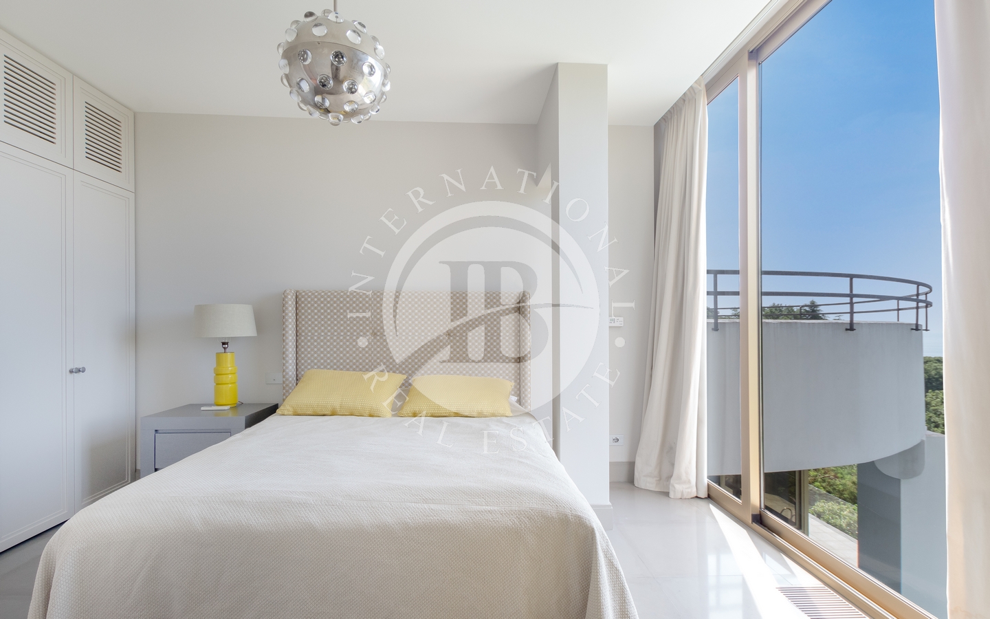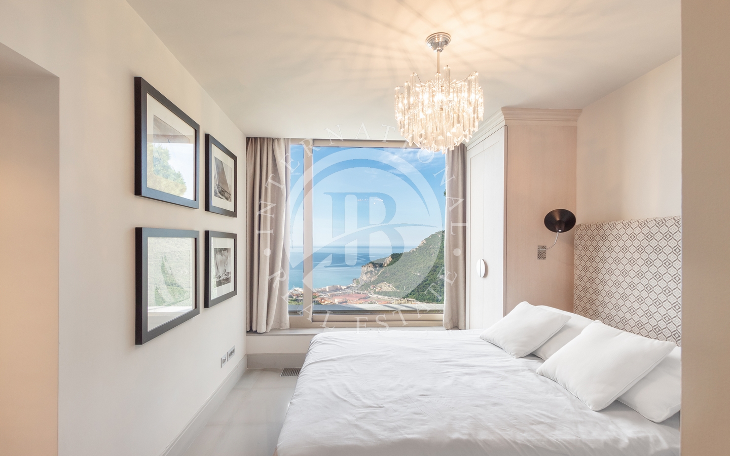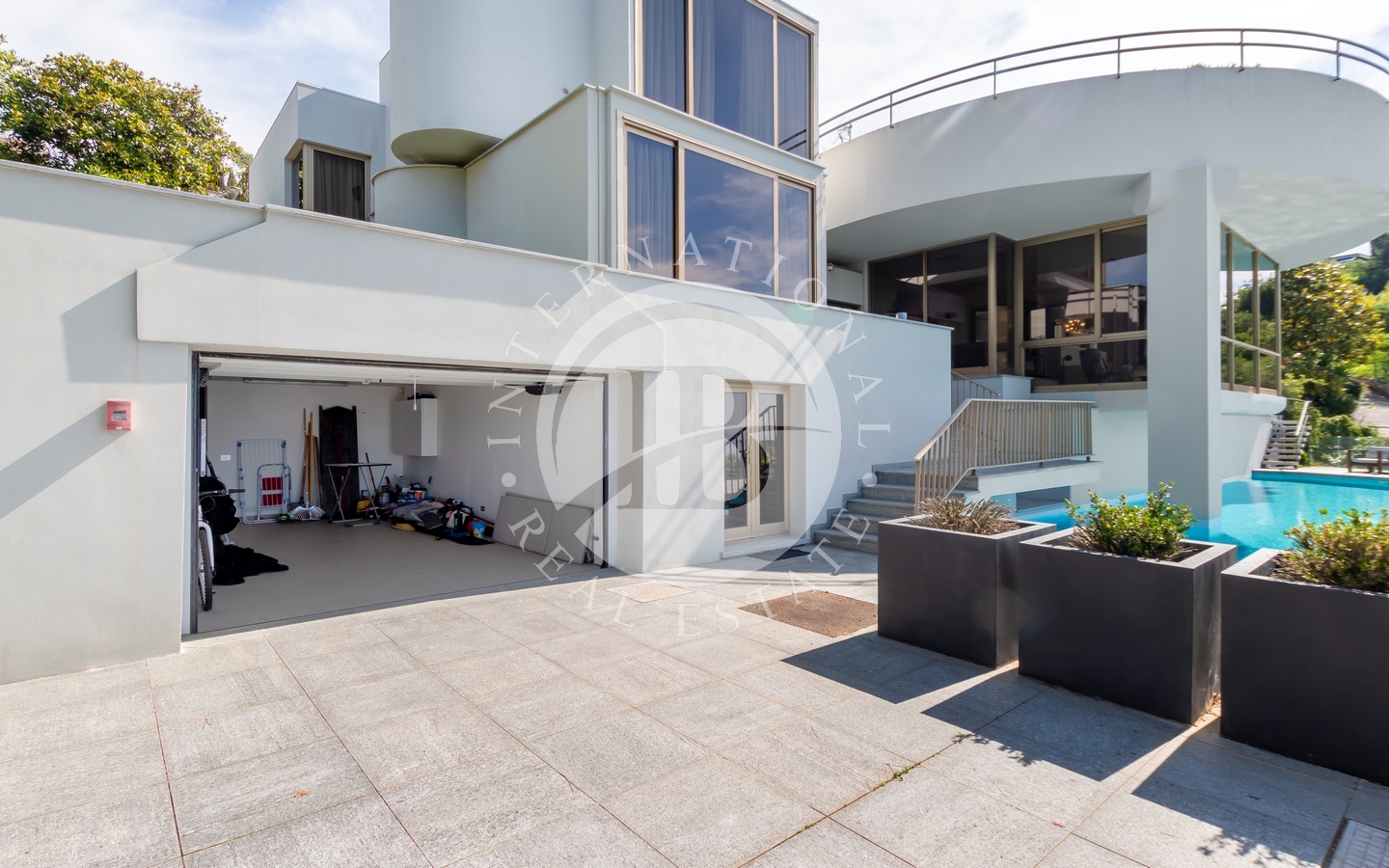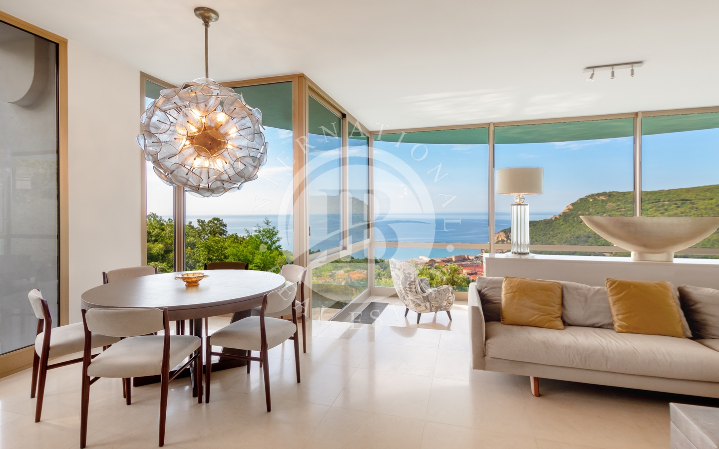 All’interno, la villa si sviluppa su tre livelli per una superficie complessiva di 400 mq, con cinque camere da letto e quattro bagni. Ogni camera si ispira a un tema marino, come le perle, i coralli o la sabbia, e regala un ambiente elegante e raffinato. Le grandi vetrate, presenti in quasi ogni stanza, seguono la luce del sole e incorniciano splendide viste sul Mar Ligure, sulla piscina e sul rigoglioso giardino.