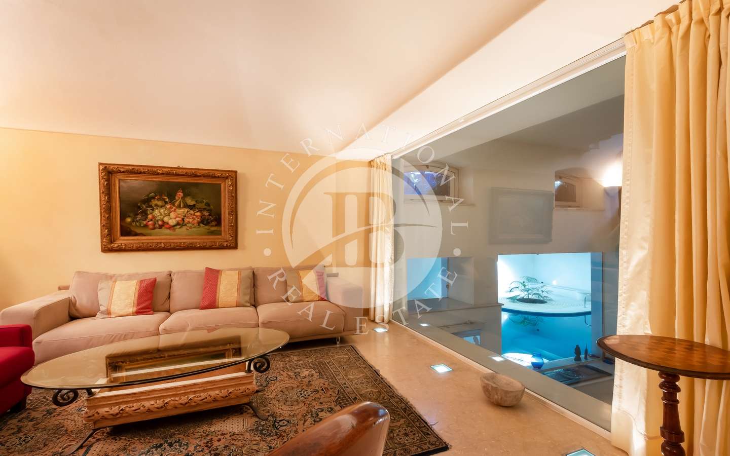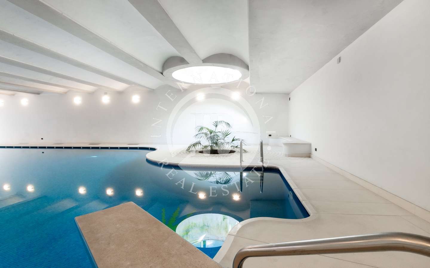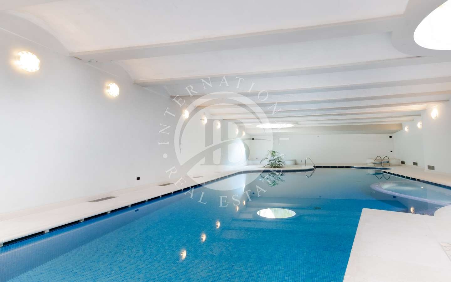, abbracciato da rigogliosi arbusti e alte palme, conferisce alla proprietà un'aura di esclusività e tranquillità. La piscina coperta, la sauna e il bagno turco offrono momenti di puro relax, mentre il parcheggio sotterraneo accoglie fino a dieci automobili con discrezione e comodità.