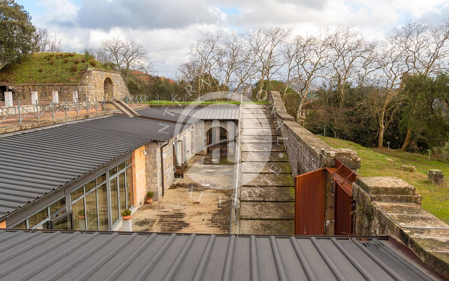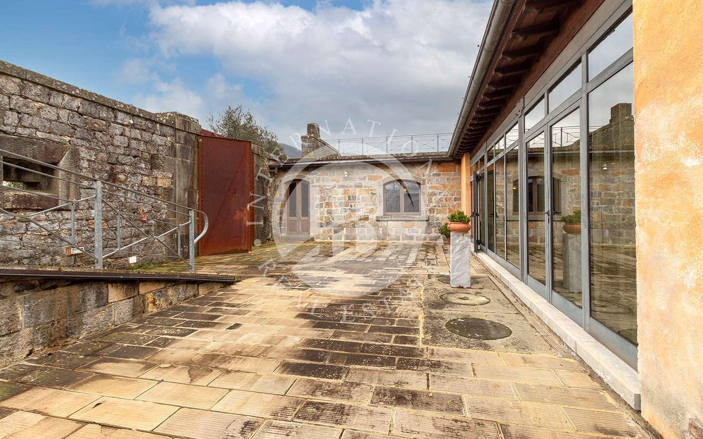 zati diametralmente opposti; Il portone di ingresso (originale) è in ferro e dà accesso al cortile su cui si affacciano tutti i locali del piano terra. Una larga gradinata conduce al piano rialzato.