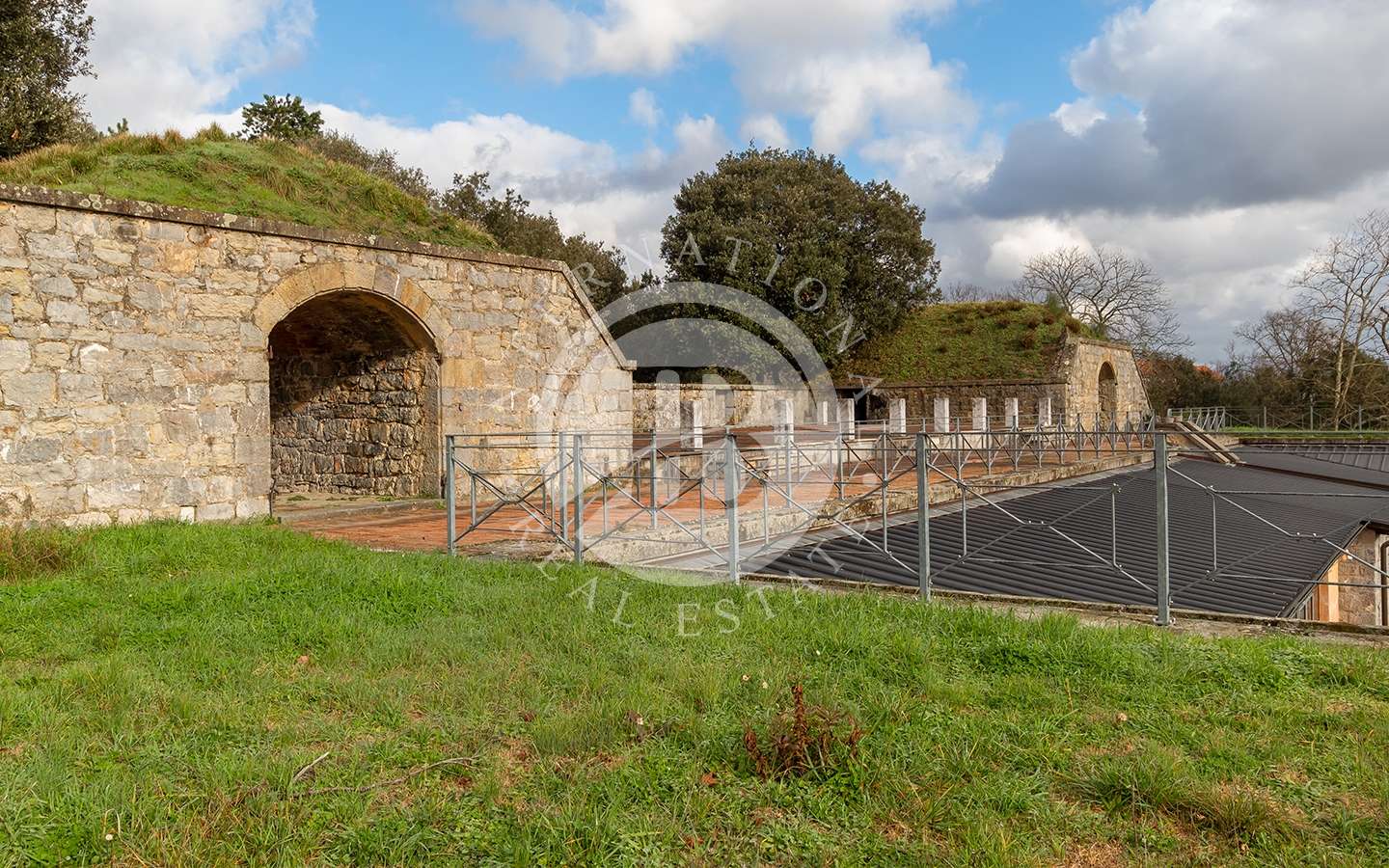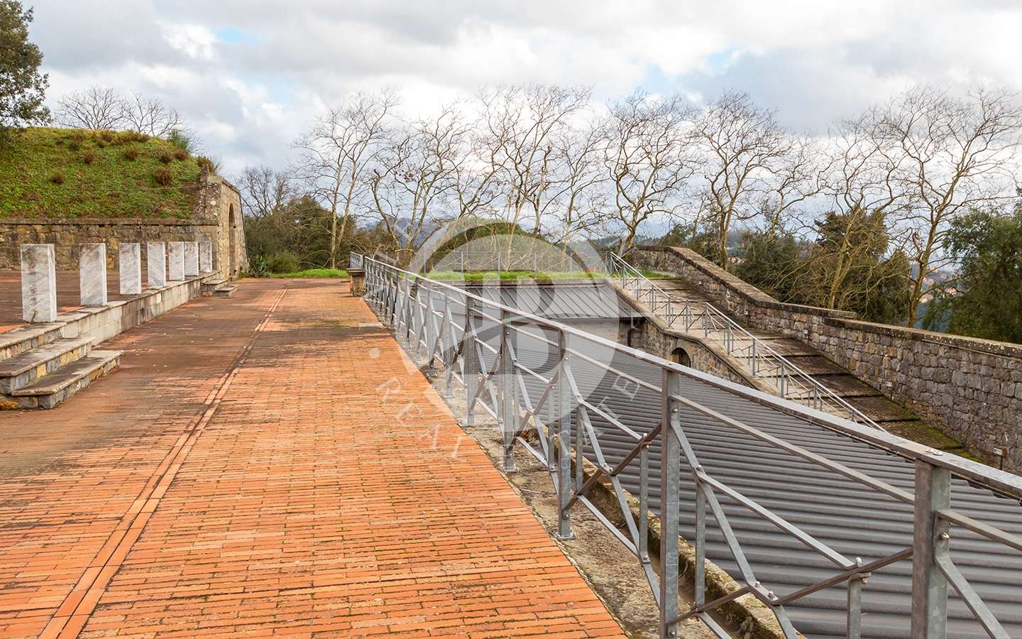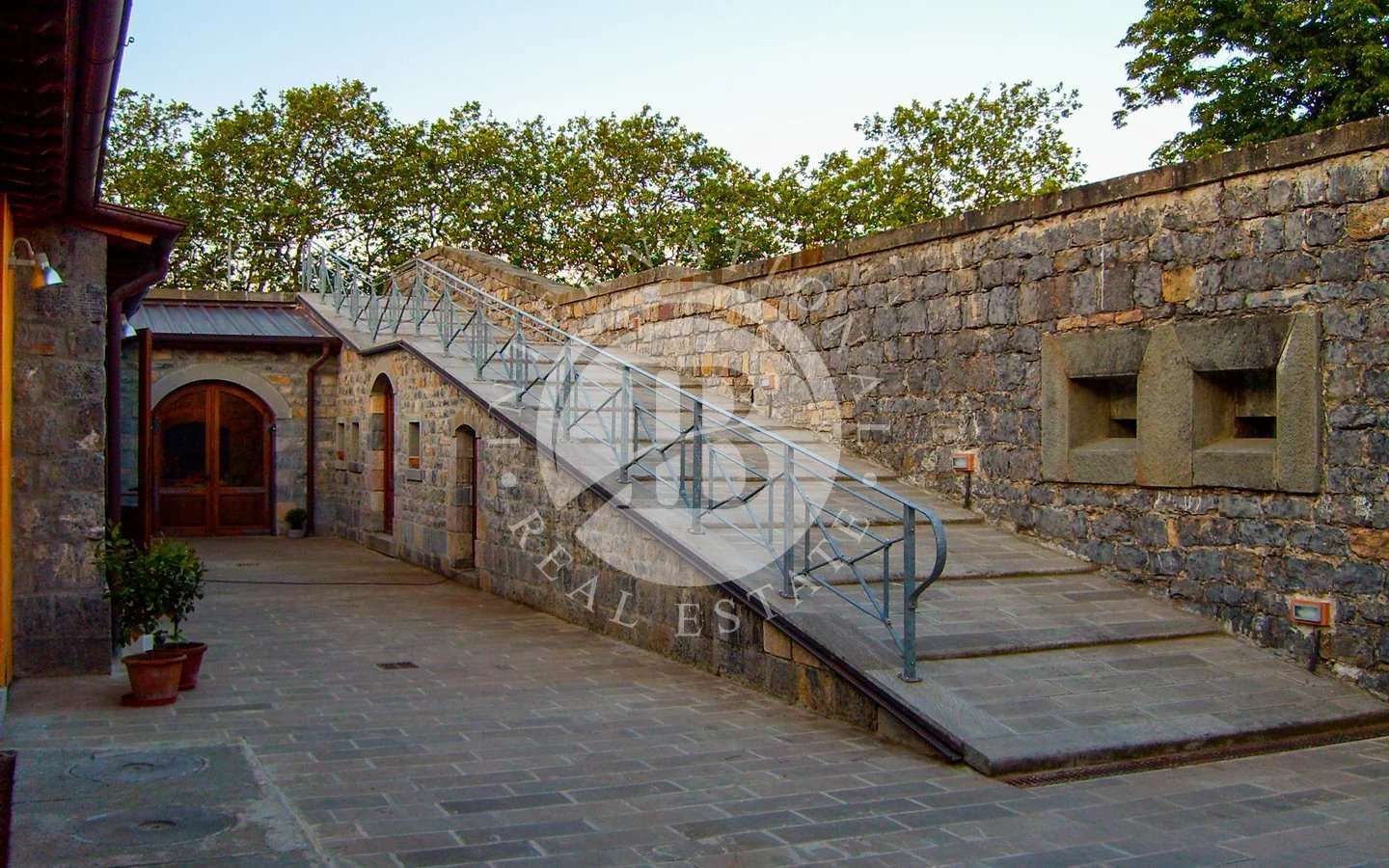 A seguire, l’accesso al piano rialzato di c.a 80 mq è dato da una gradinata percorribile anche con automezzi di servizio.