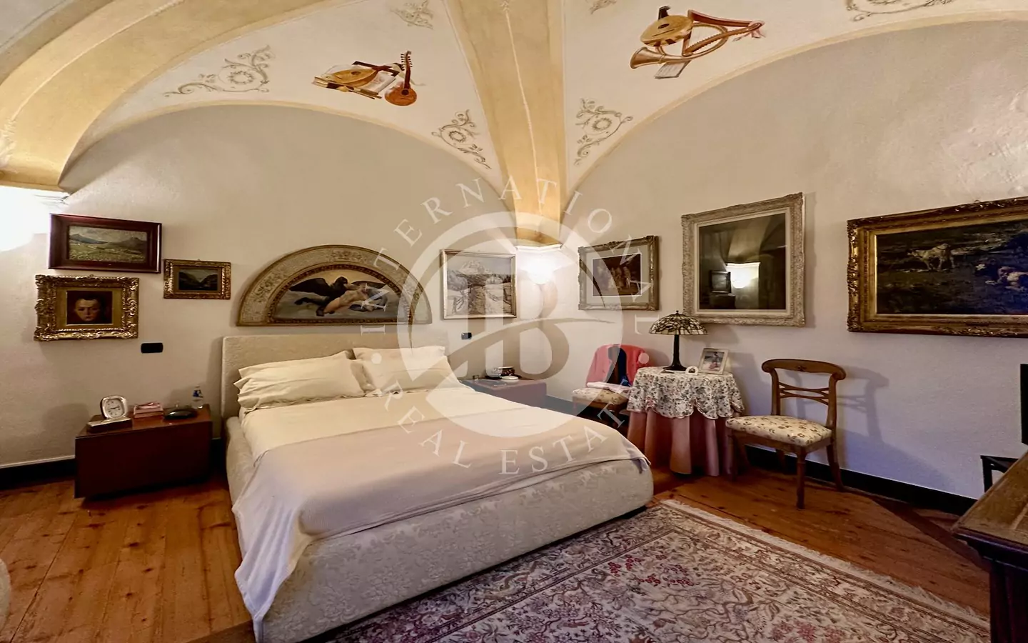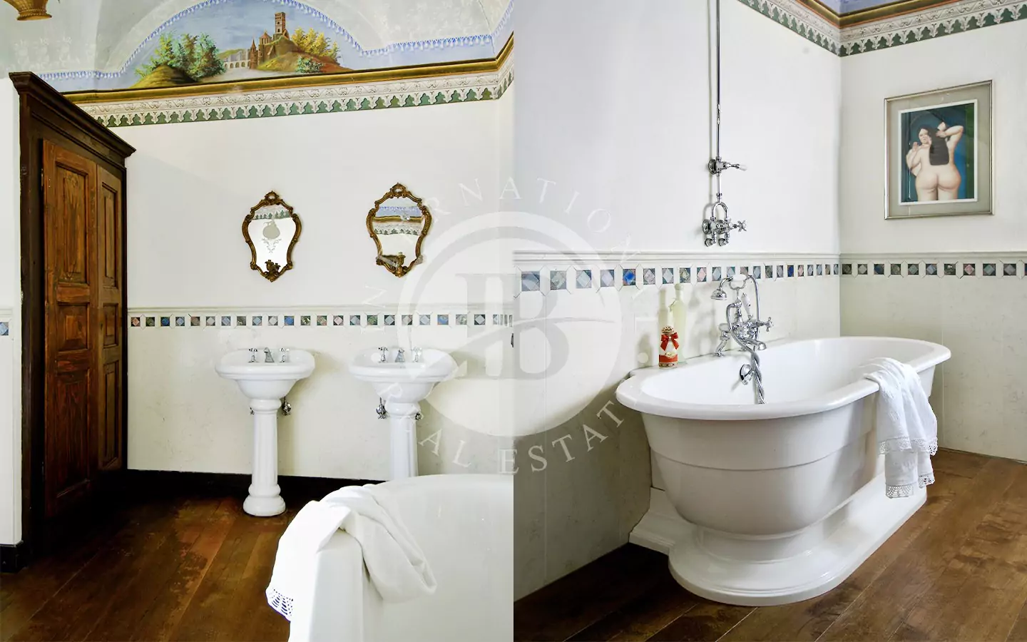 Primo Piano: salone affrescato con camino in marmo decorato, spazioso guardaroba, elegante bagno con ceramiche Devon & Devon e soffitto dipinto, e una luminosa camera padronale con volta affrescata, accessibile attraverso un raro portale scolpito d’epoca medievale.