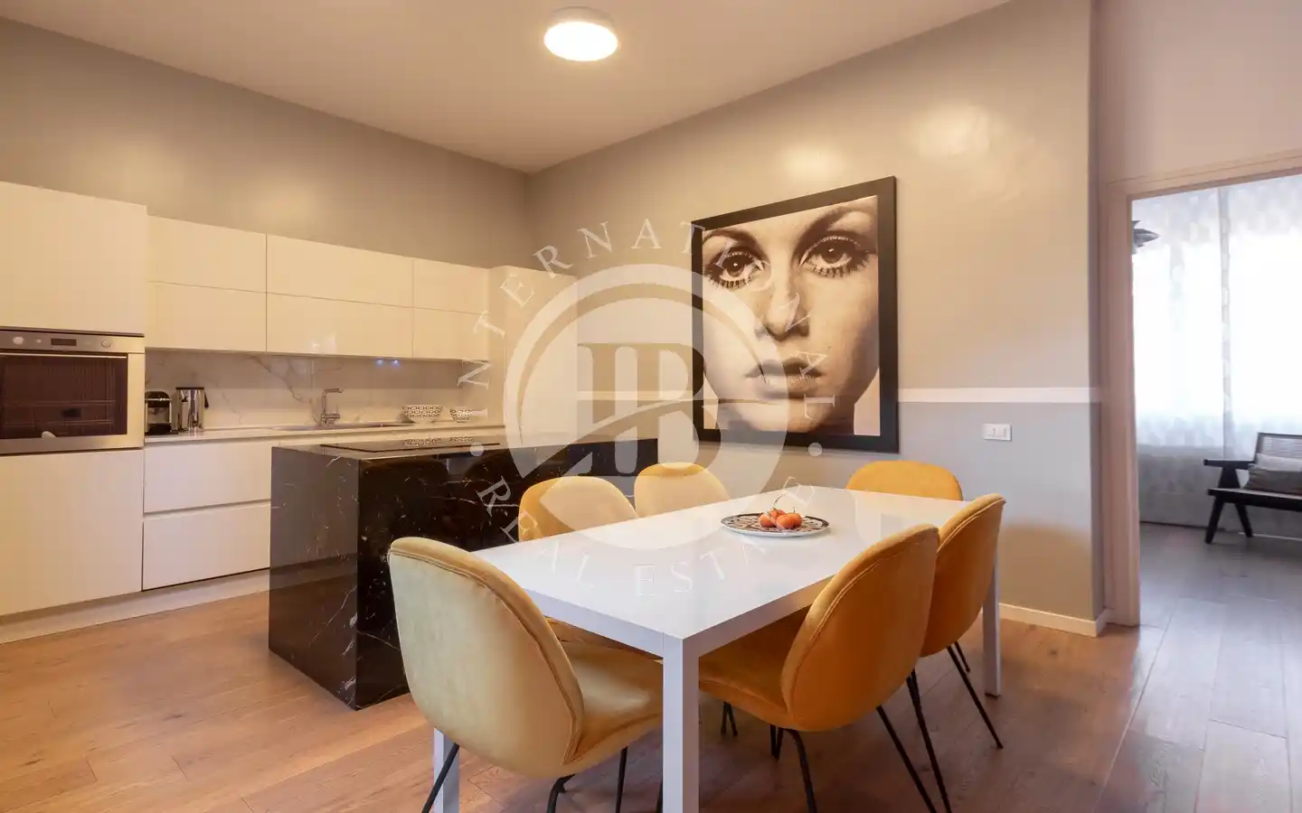 La cucina di design, integrata con una zona pranzo, è perfetta per ospitare momenti conviviali.