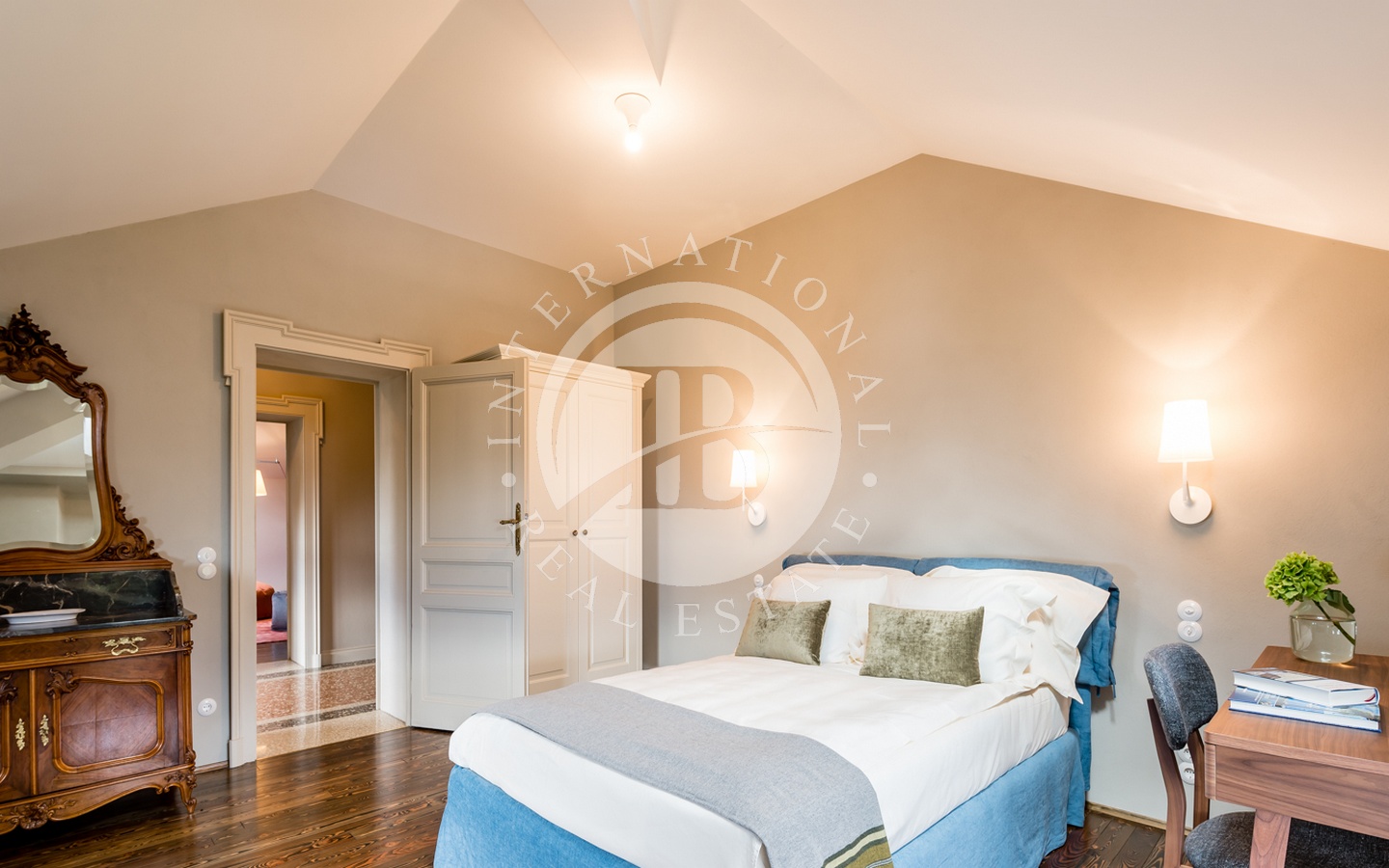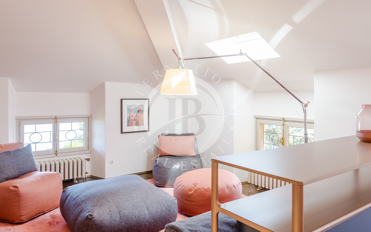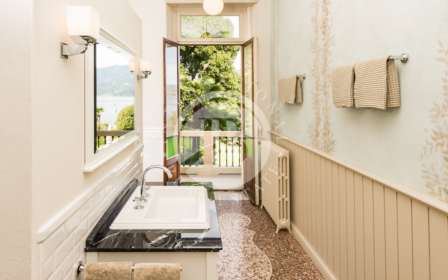 Al piano terra si trovano una cucina spaziosa, completamente accessoriata, che si apre su una luminosa zona pranzo con vista lago, un ampio soggiorno impreziosito da una vetrata d’epoca dai colori vivaci, un salotto intimo e un bagno di cortesia.