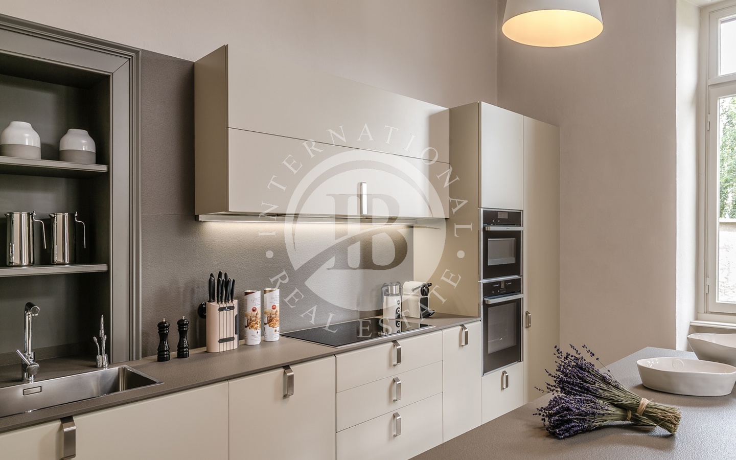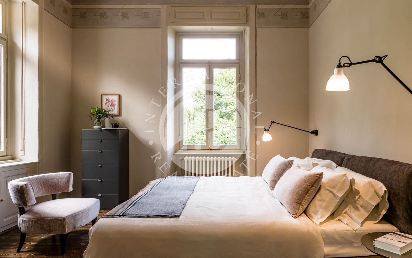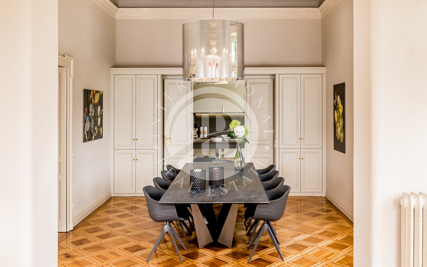Al piano terra si trovano una cucina spaziosa, completamente accessoriata, che si apre su una luminosa zona pranzo con vista lago, un ampio soggiorno impreziosito da una vetrata d’epoca dai colori vivaci, un salotto intimo e un bagno di cortesia.
