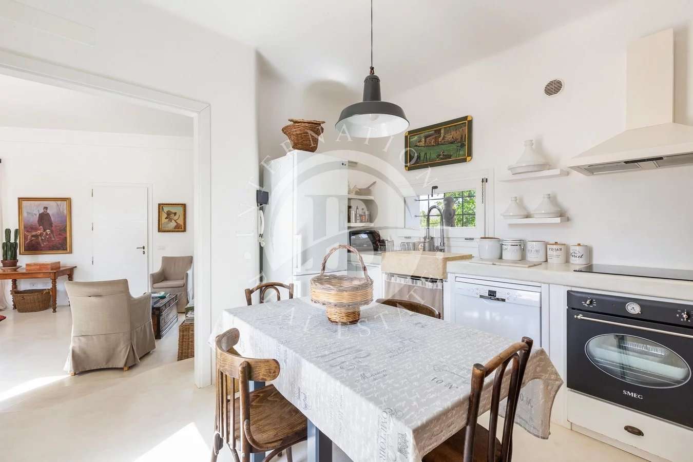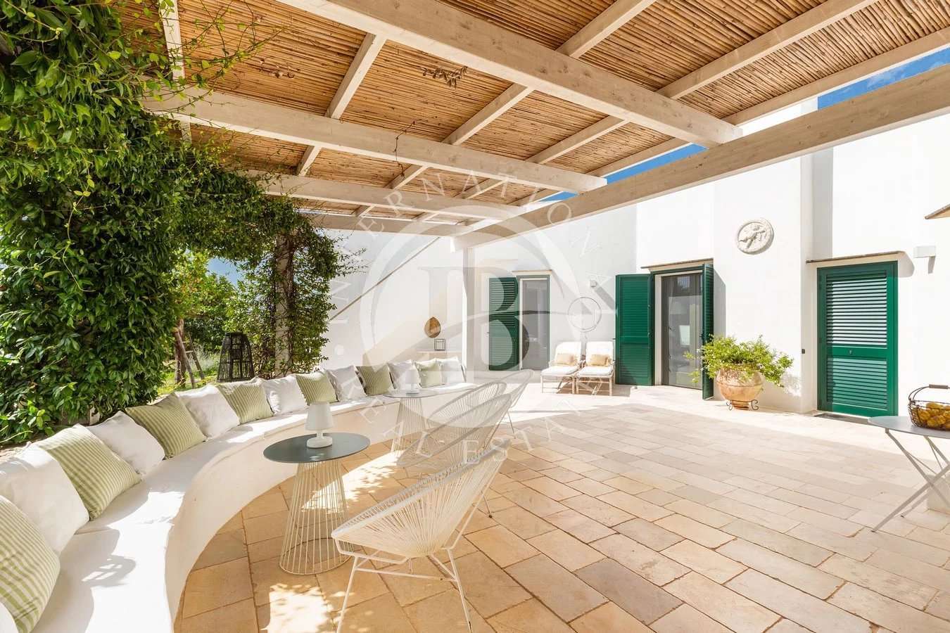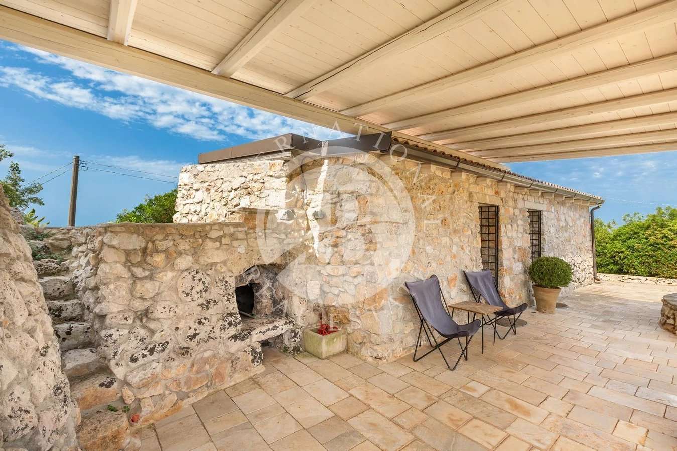 Anche questa zona della Villa Vista Mare è organizzata con un Meraviglioso Porticato Antistante, sistemato con arredi da esterni e impreziosito da un Antico Forno in Pietra.