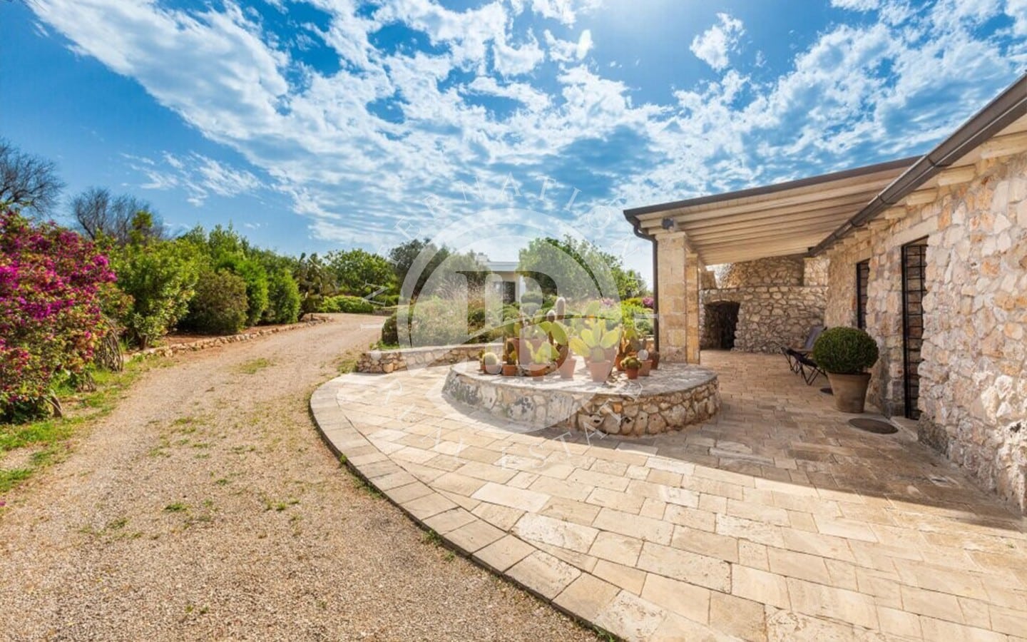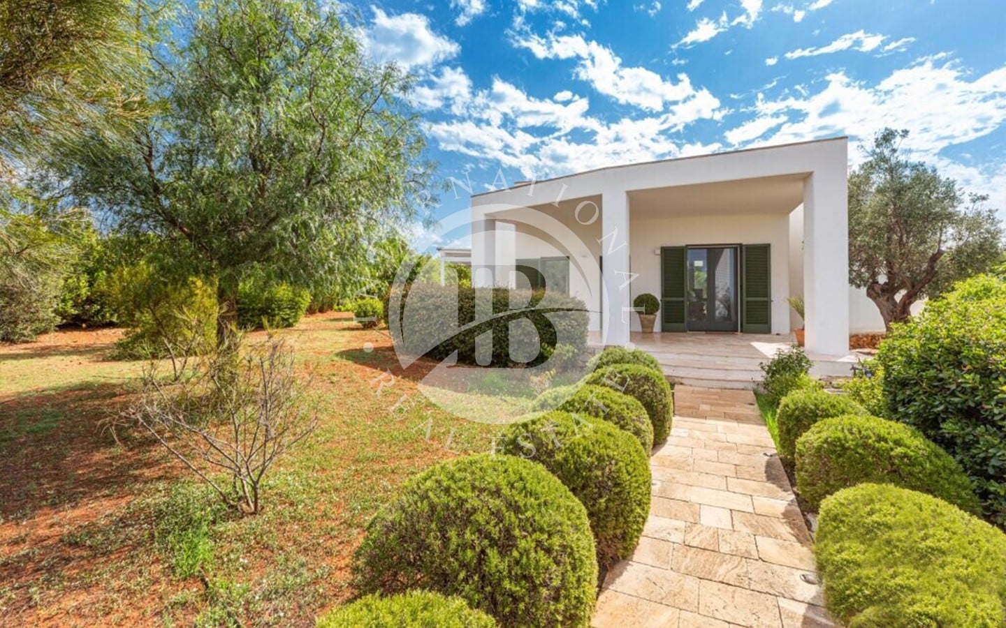pedonale ben sistemato, permette l'accesso alla Lussuosa Villa che, frontalmente, ospita una Confortevole Terrazza.