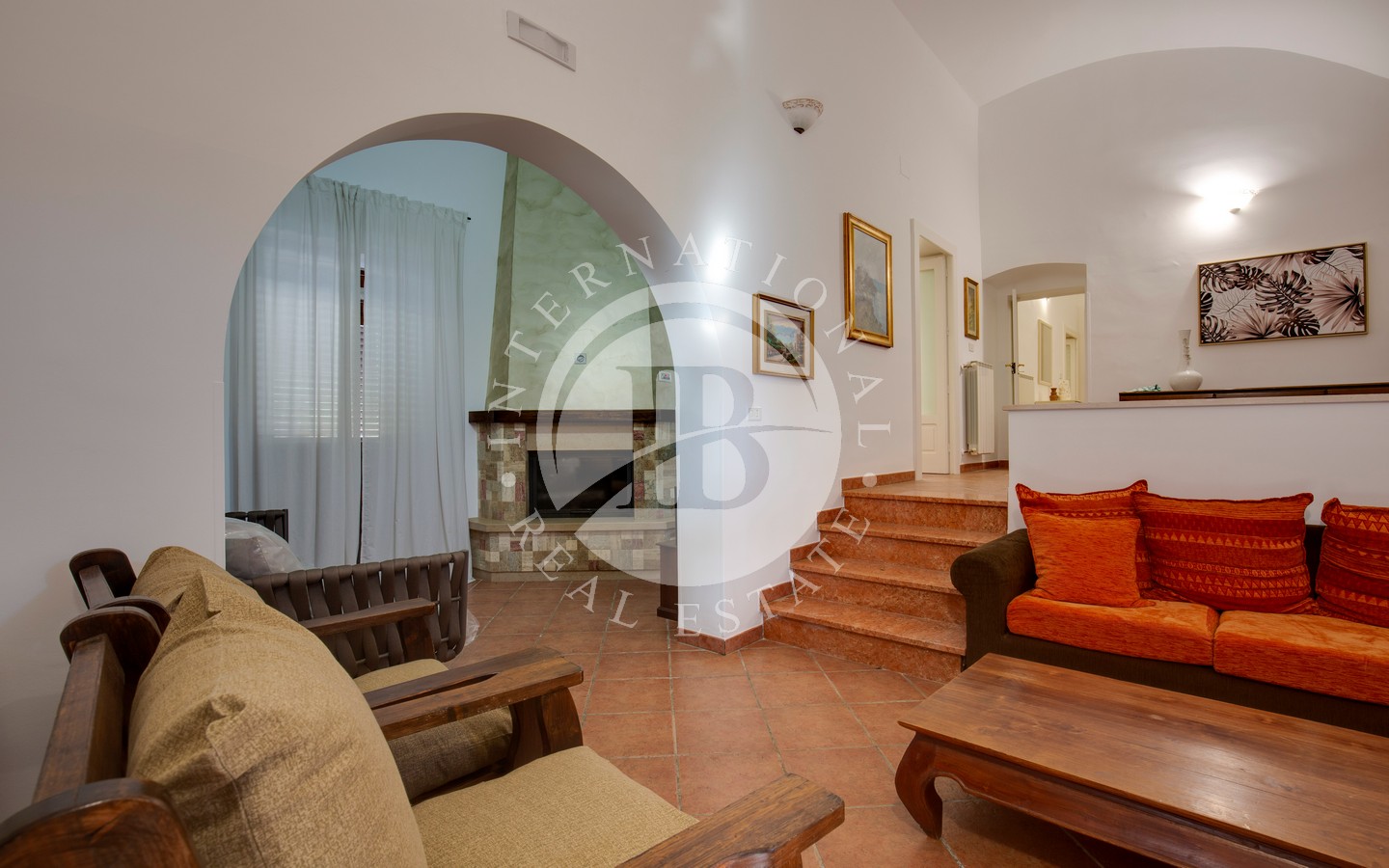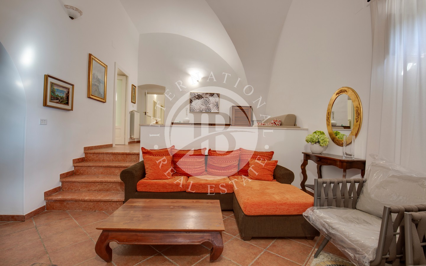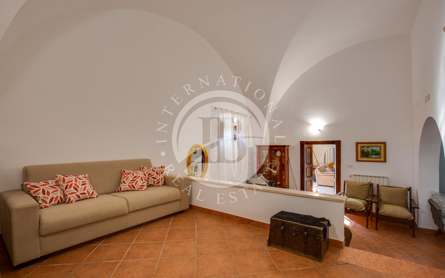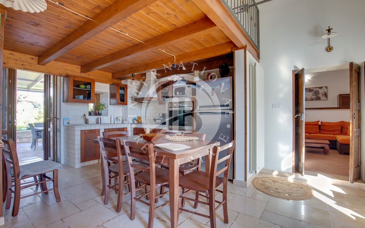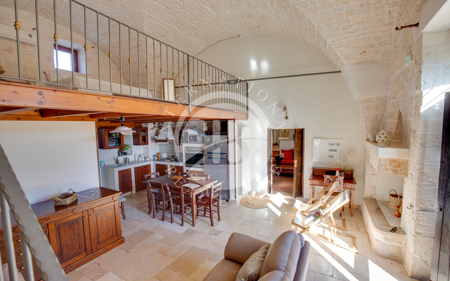 All’interno, la zona living è luminosa e accogliente, arricchita da alte volte in pietra, camino, angolo cottura, bagno e un ampio soppalco con finestra, perfetto come spazio aggiuntivo multifunzionale.
