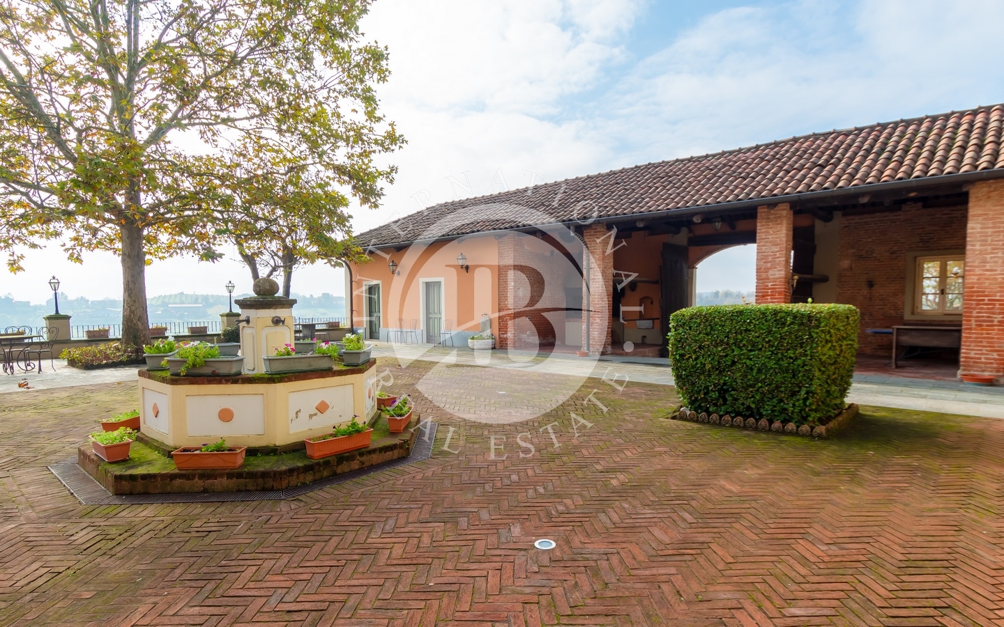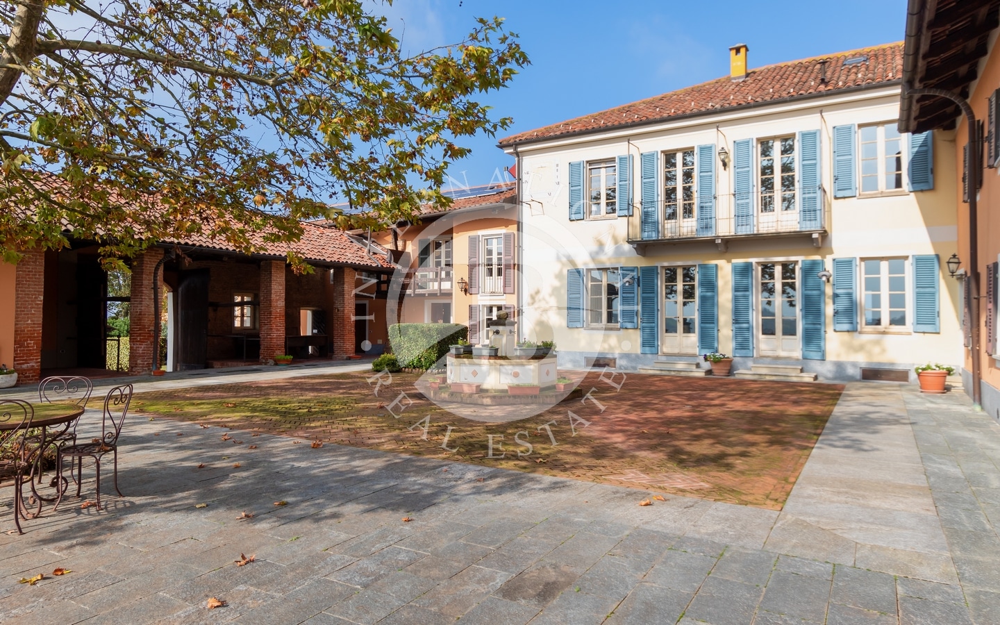 Il portico a colonnato offre una vista incantevole sui vigneti, mentre il cortile interno, impreziosito da una fontana in pietra, evoca atmosfere di altri tempi.