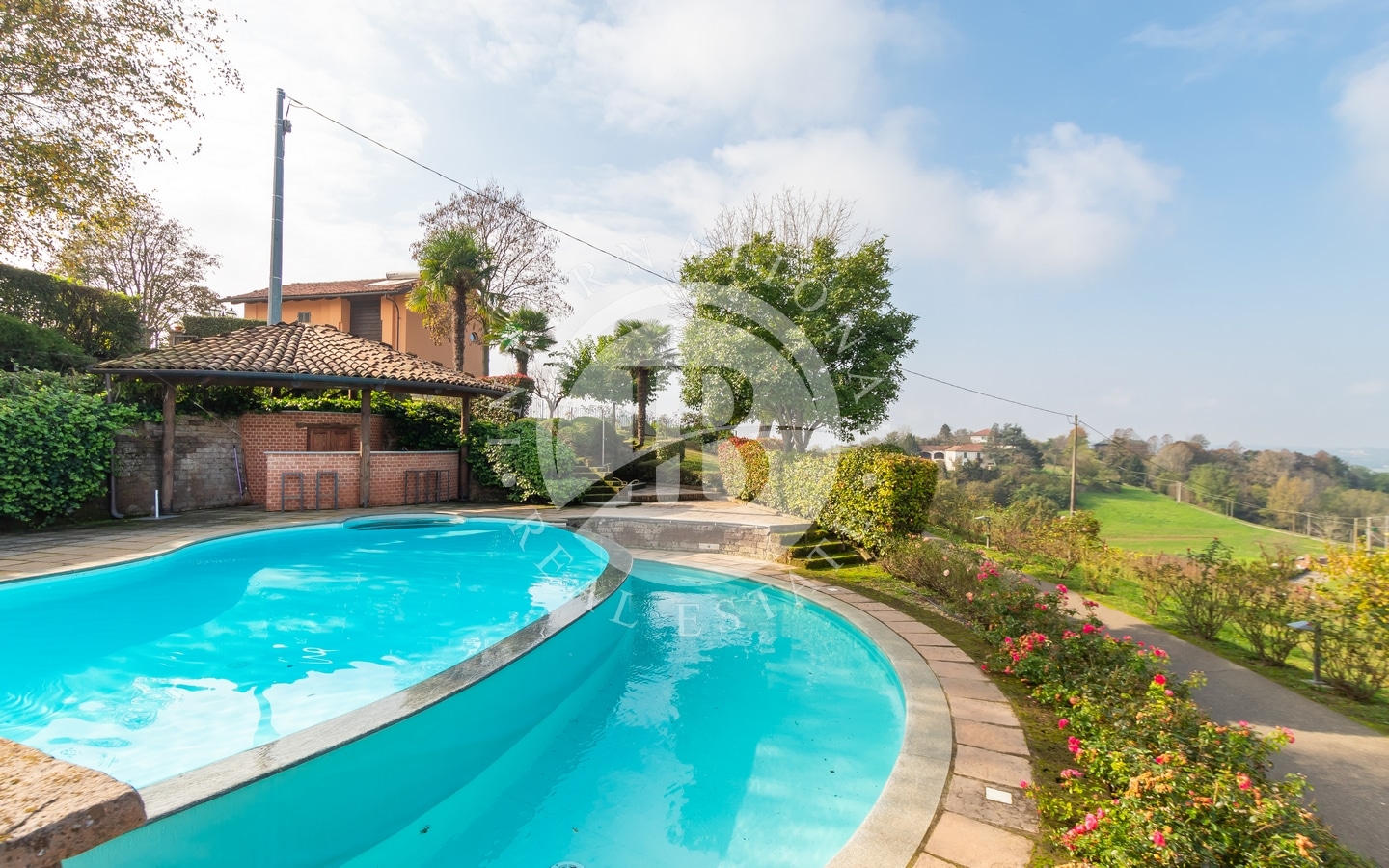 La piscina, di forma ovale e su più livelli, include una zona bar, rendendola perfetta per momenti di relax.