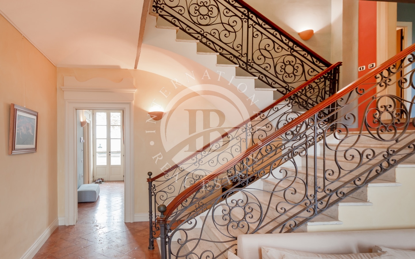 residenza nobiliare. La facciata principale della villa colpisce per la sua eleganza, con una doppia scalinata centrale e tre balconi al piano nobile arricchiti da splendidi dettagli in ferro battuto.