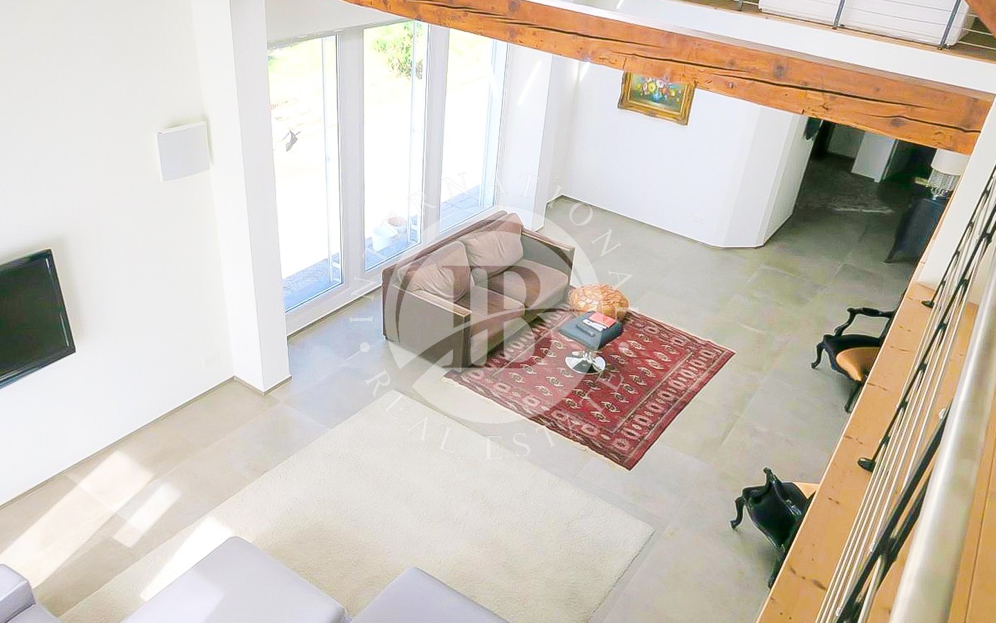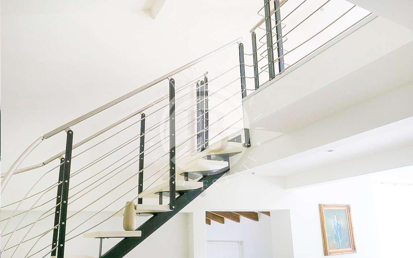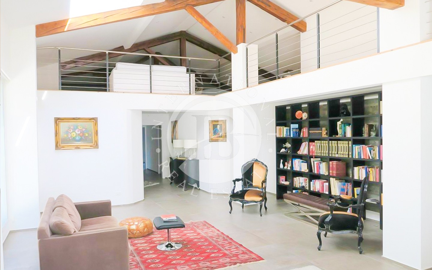 Il primo piano, di circa 120 mq, ospita un grande spazio mansardato open space, ideale come studio, area relax o zona hobby, con affaccio a soppalco sul salone centrale che conferisce grande respiro e luminosità agli ambienti sottostanti.