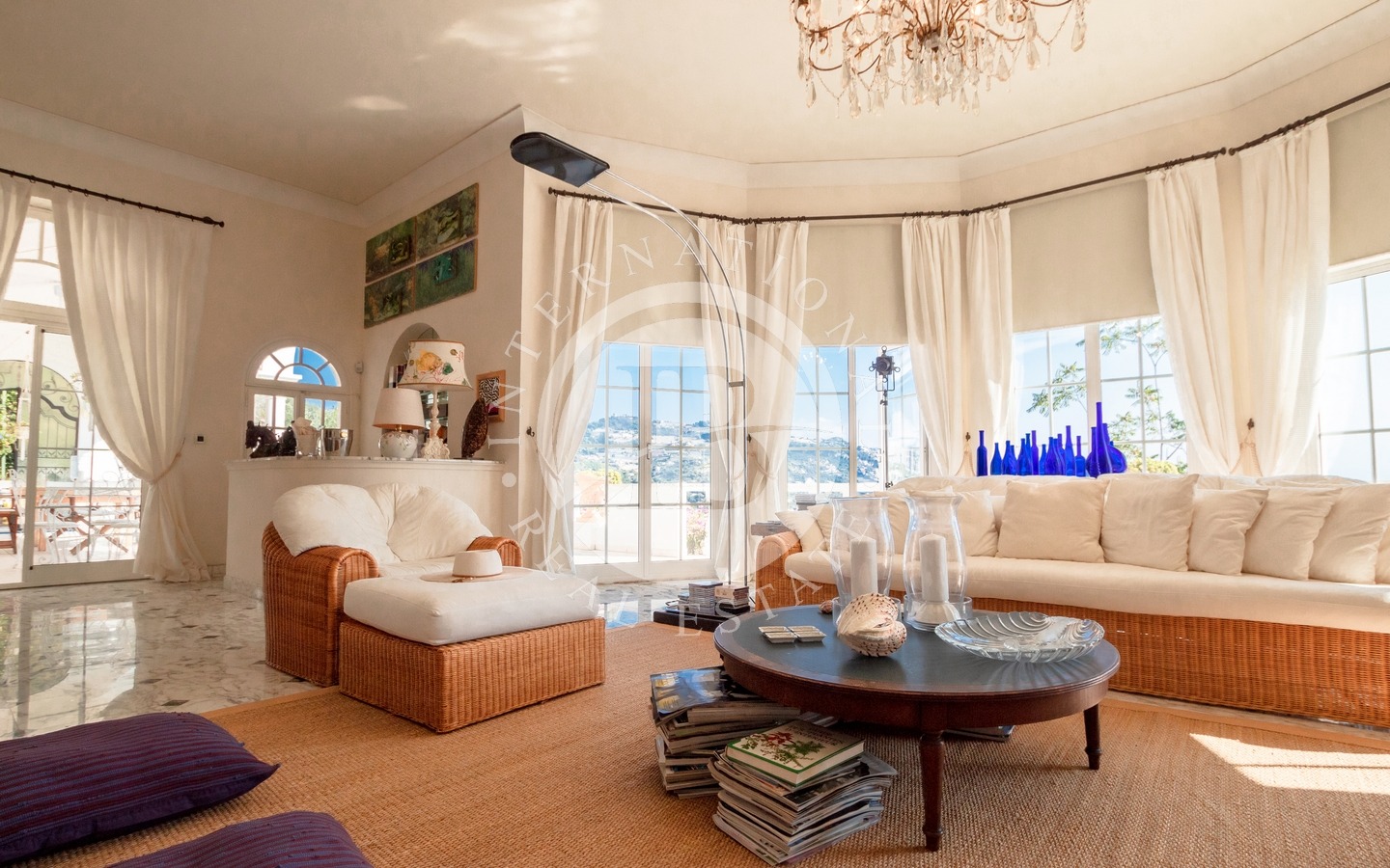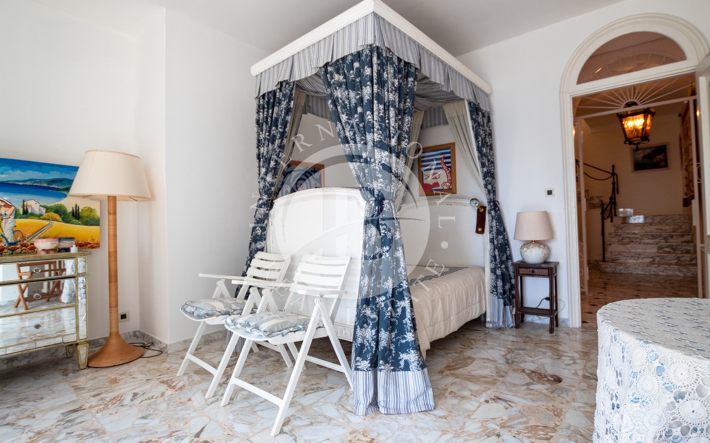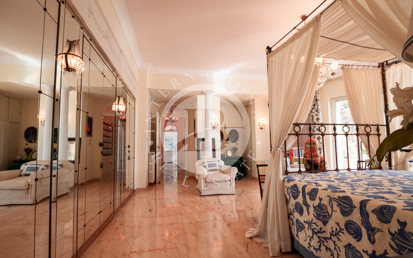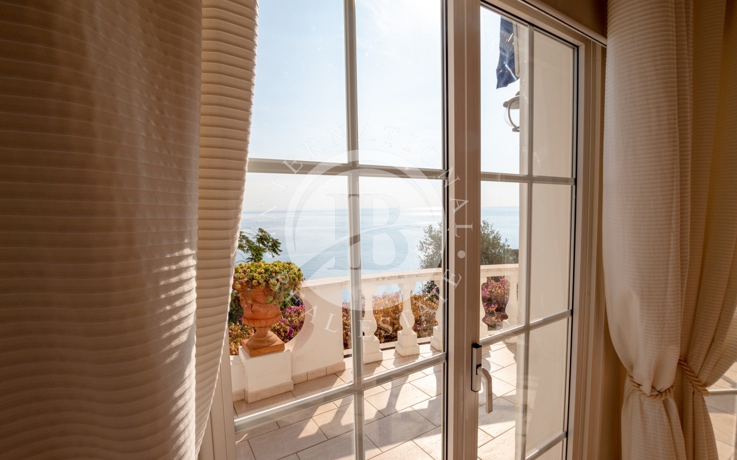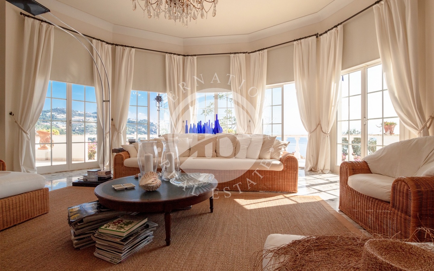 La villa si sviluppa su due spaziosi livelli per un totale di 450 mq, entrambi con grandi terrazze che offrono una vista spettacolare sul mare e creano un legame armonioso tra gli spazi interni ed esterni. Il primo piano ospita la luminosa zona giorno, caratterizzata da pavimenti in marmo, un accogliente camino e ampie vetrate che si aprono sul terrazzo. Vi è lo studio, una zona lavanderia e un bagno per gli ospiti.