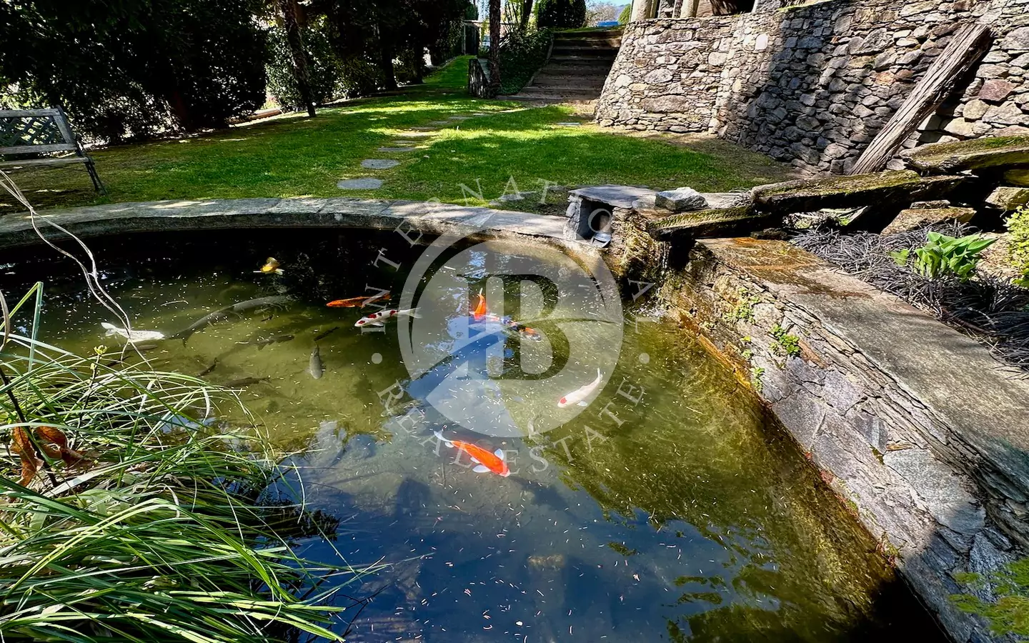 auto coperti e una spaziosa autorimessa doppia con portone automatizzato. Particolare fascino è conferito dal laghetto naturalizzato alimentato da acqua sorgiva, popolato da rari esemplari di carpe giapponesi, e incorniciato da vegetazione ad alto fusto.