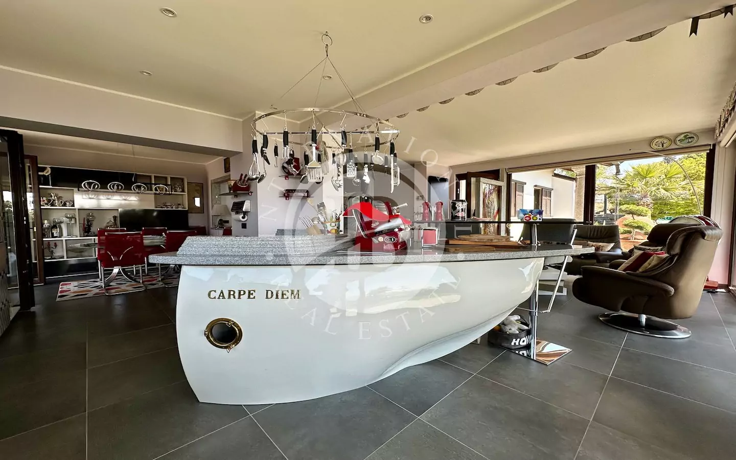 Particolarmente suggestivo è il porticato con vista lago, attrezzato con barbecue, forno per la pizza e tavolo da pranzo, perfetto per momenti conviviali all’aperto.