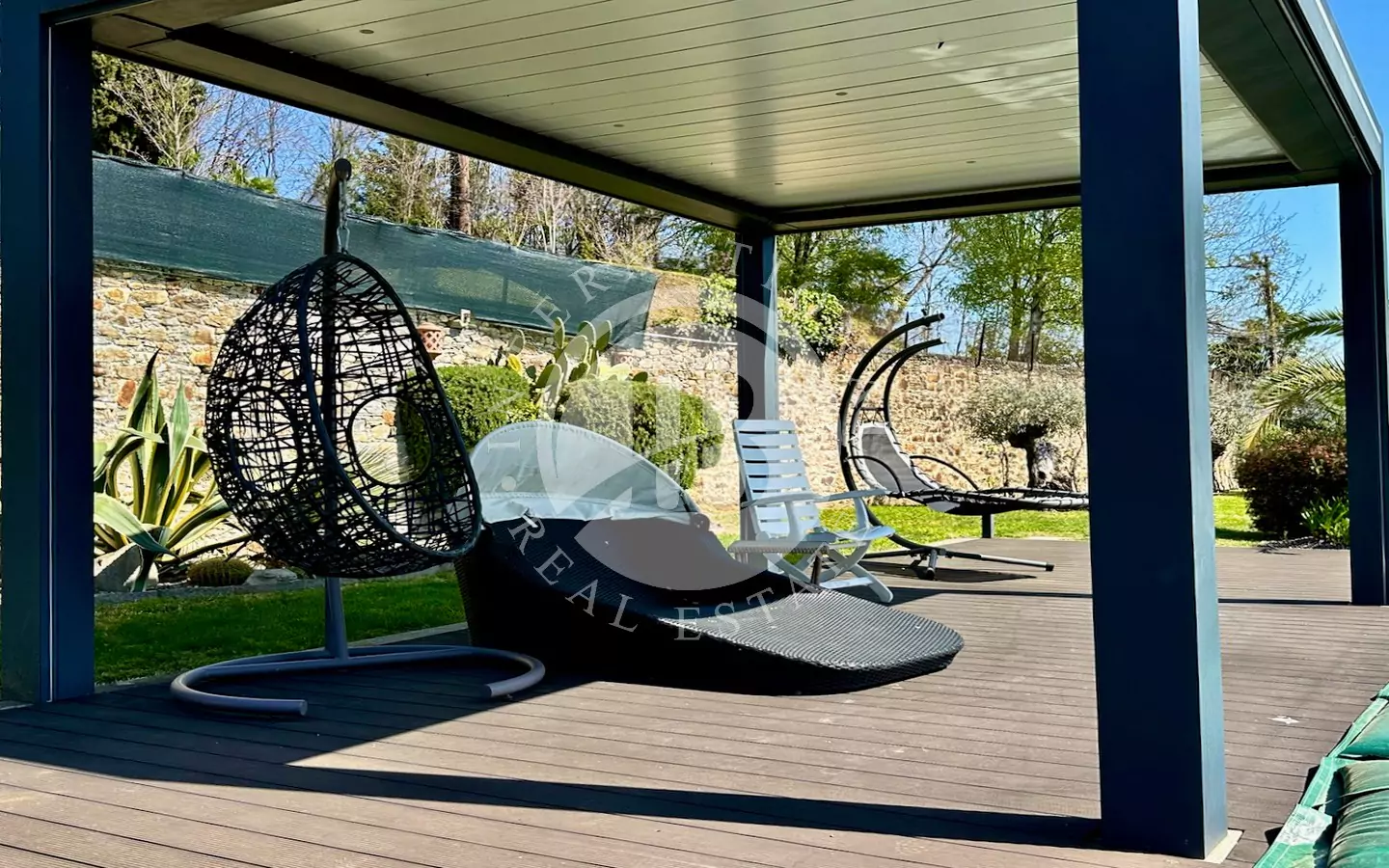 All’esterno la proprietà vanta una piscina a sfioro riscaldata, rivestita in pietra naturale e affiancata da una zona solarium. A completamento, un fabbricato indipendente adibito a deposito attrezzi, un campo da bocce e un impianto di irrigazione alimentato da cisterna da 10.000 litri con acqua sorgiva.
