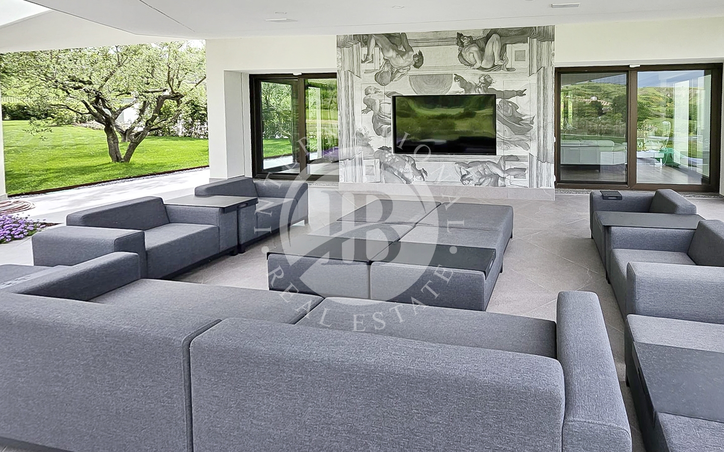 Gli interni sono luminosi, grazie alle ampie vetrate panoramiche che eliminano il confine tra spazi interni ed esterni, garantendo una perfetta fusione con la natura. Il soggiorno principale di 100 mq, la zona home theatre, la sala da pranzo, la cucina, gli studi e le camere da letto (tutte con bagno en suite), sono stati progettati per essere spazi flessibili e multifunzionali, adattabili a esigenze diverse.