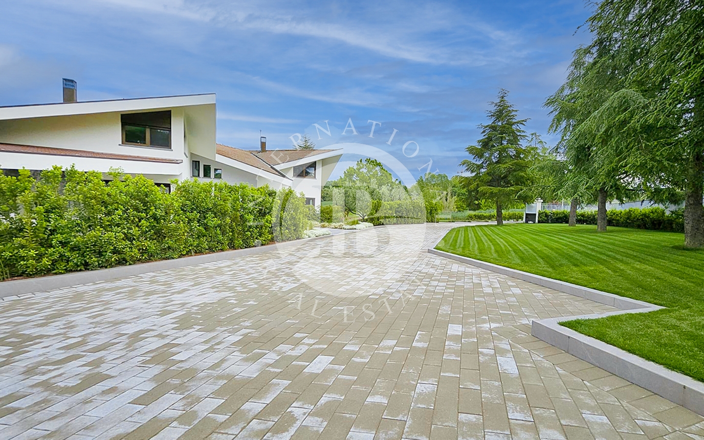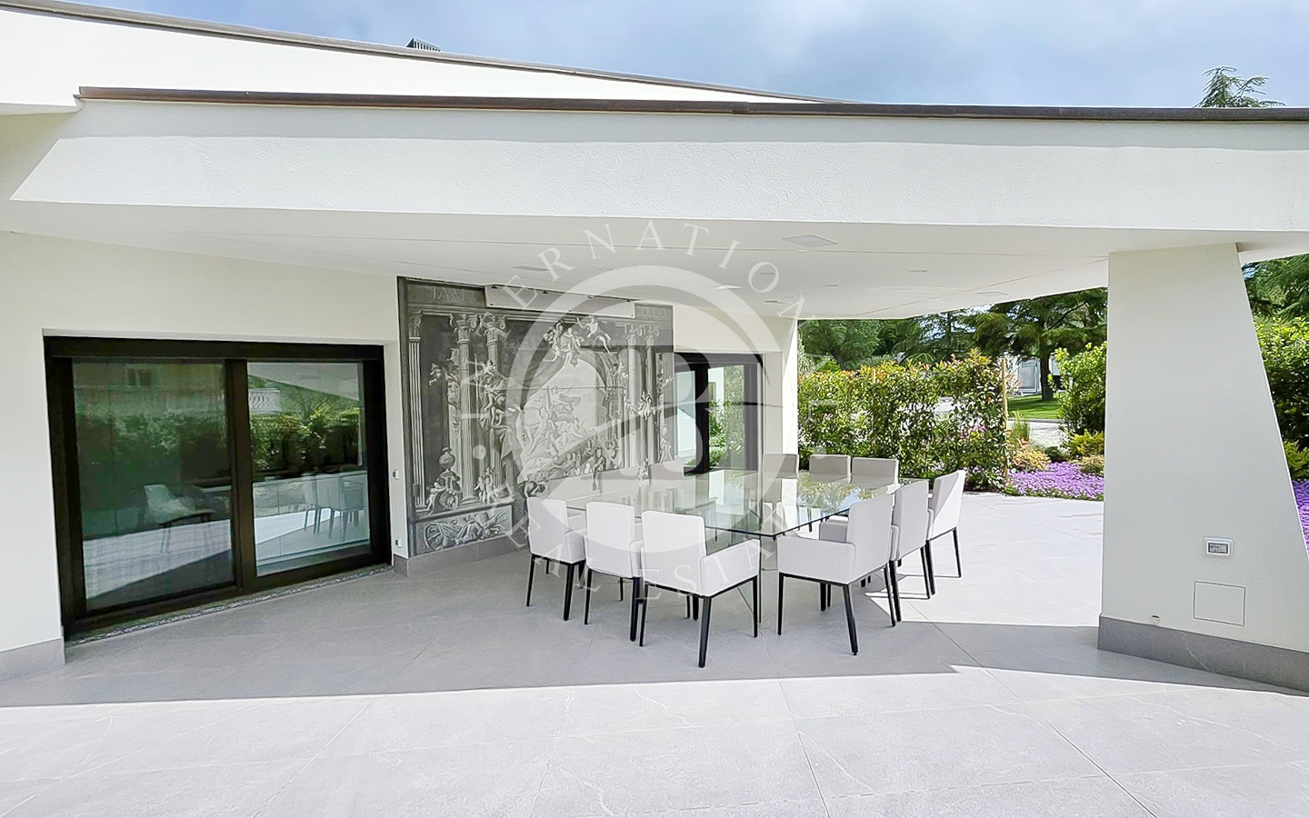 La villa si sviluppa su tre livelli, oltre a una dépendance, per una superficie complessiva di circa 750 mq. Completano la proprietà 5.000 mq di terreno, di cui 3.800 mq a giardino curato in stile mediterraneo, 200 mq riservati a una piscina a sfioro riscaldata e 500 mq ancora edificabili a uso abitativo, più 90 mq per porticati. Il cuore della proprietà è proprio l'imponente piscina salata, con fontana coreografica da 16 getti d’acqua alti fino a 10 metri, che funge da epicentro visivo e funzionale dell’intero complesso.