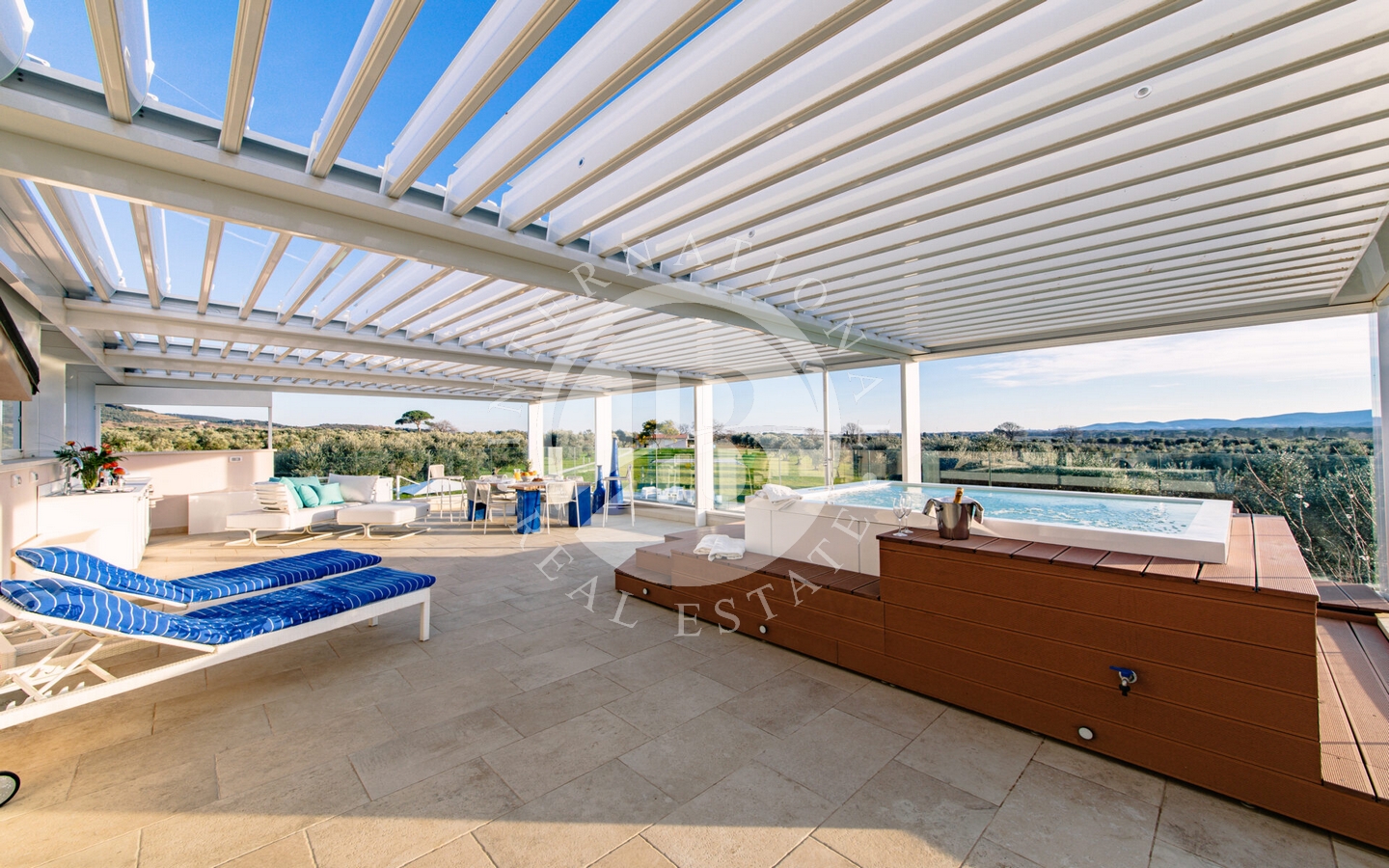Concediti momenti di puro relax nella spettacolare piscina moderna di 15x6 metri, circondata da un lussureggiante giardino di 150000 metri quadrati. Il solarium e la pergola bioclimatica offrono aree di relax all'ombra e al sole, ideali per godere delle splendide giornate mediterranee. L'ottima esposizione garantisce una luminosità naturale in ogni angolo della proprietà, mentre la tranquillità e la privacy sono garantite dalla posizione privilegiata.