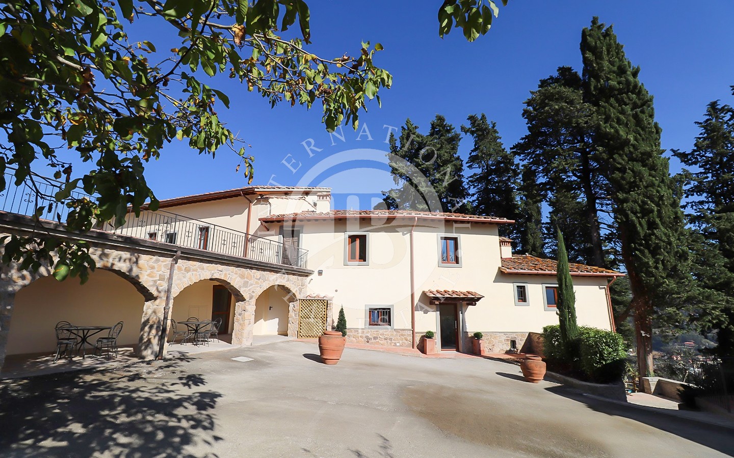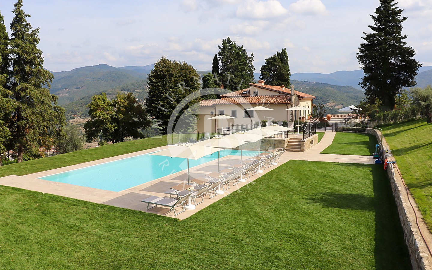 Gli esterni della villa sono altrettanto affascinanti, con una piscina di acqua salata circondata da un ampio solarium e zone relax. Il terreno di 4 ettari comprende uliveti per la produzione propria di olio, giardini curati e spazi aperti che garantiscono massima privacy. I due accessi alla proprietà assicurano indipendenza e facilità di accesso. Ogni angolo degli esterni è pensato per offrire un’esperienza unica, con aree verdi e viste panoramiche sulla campagna toscana.