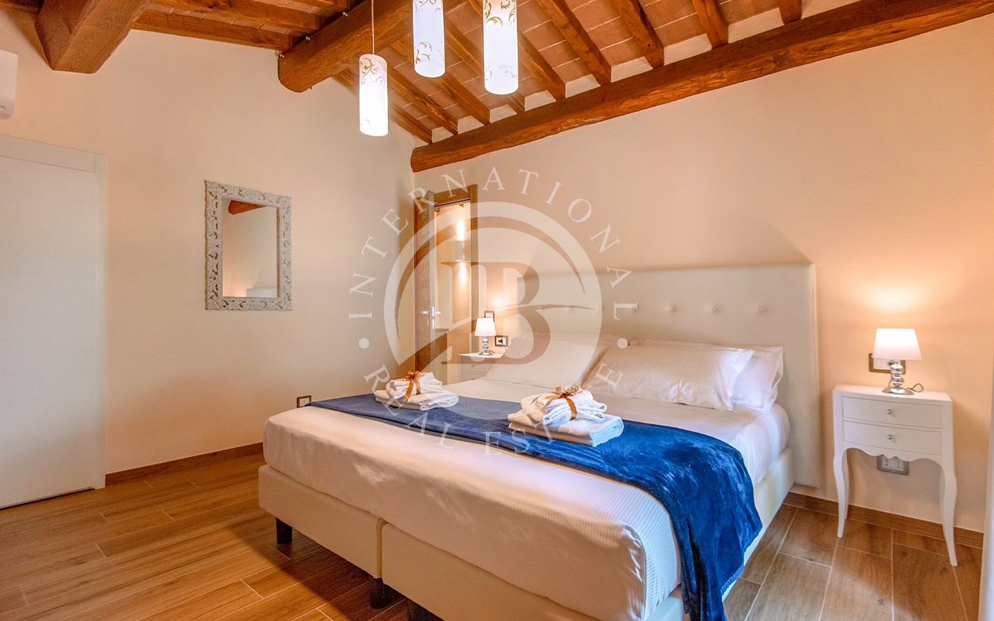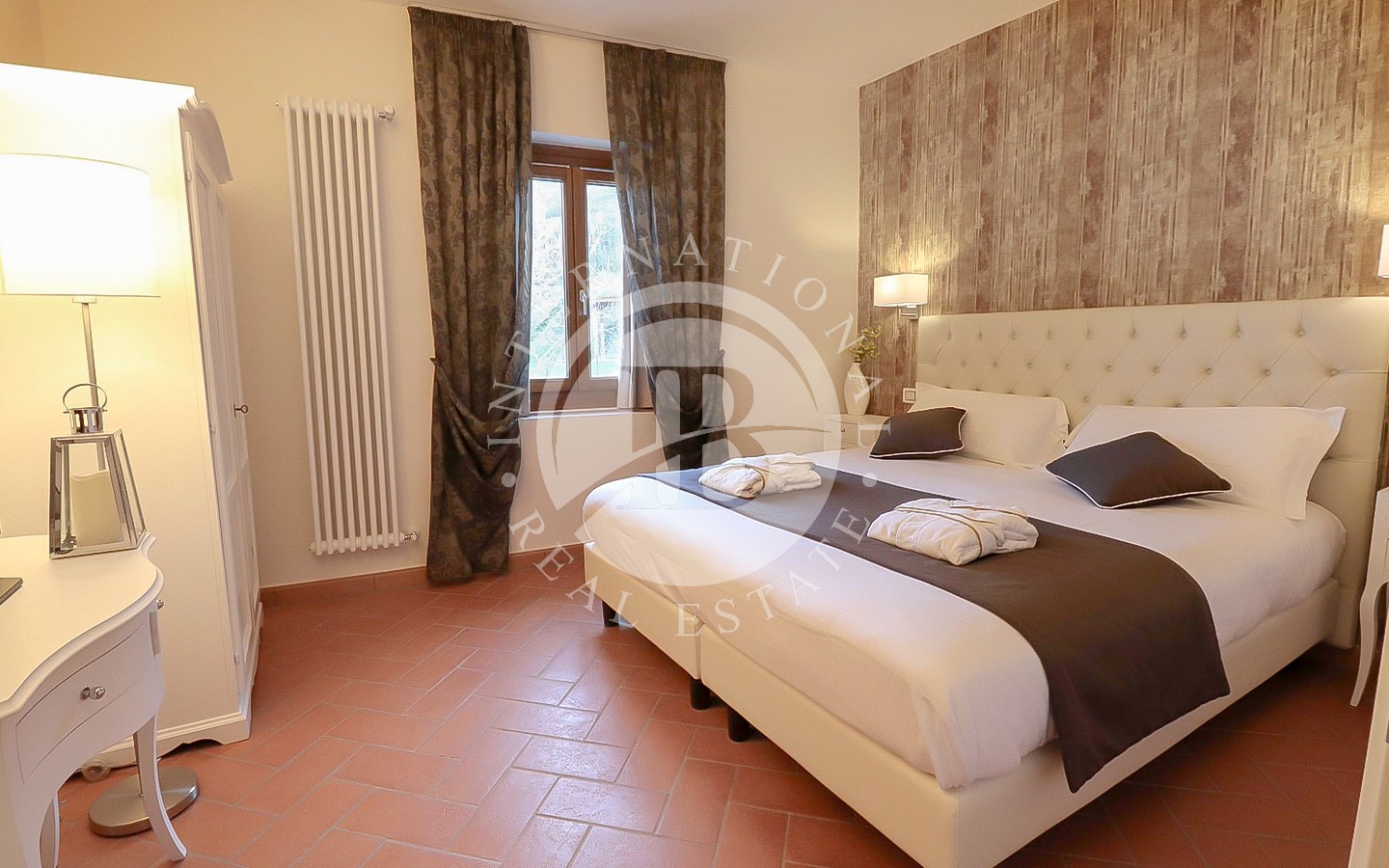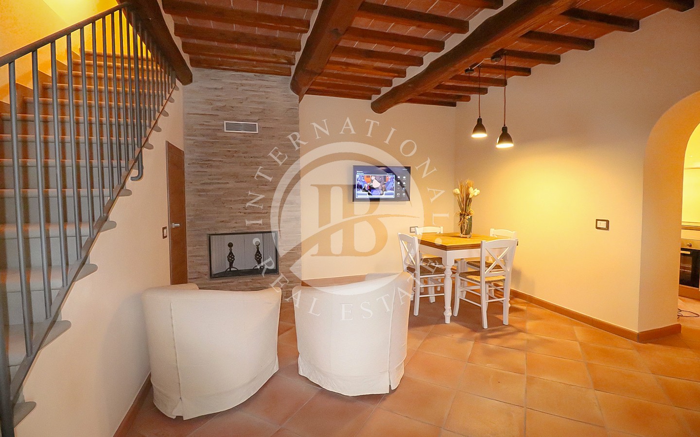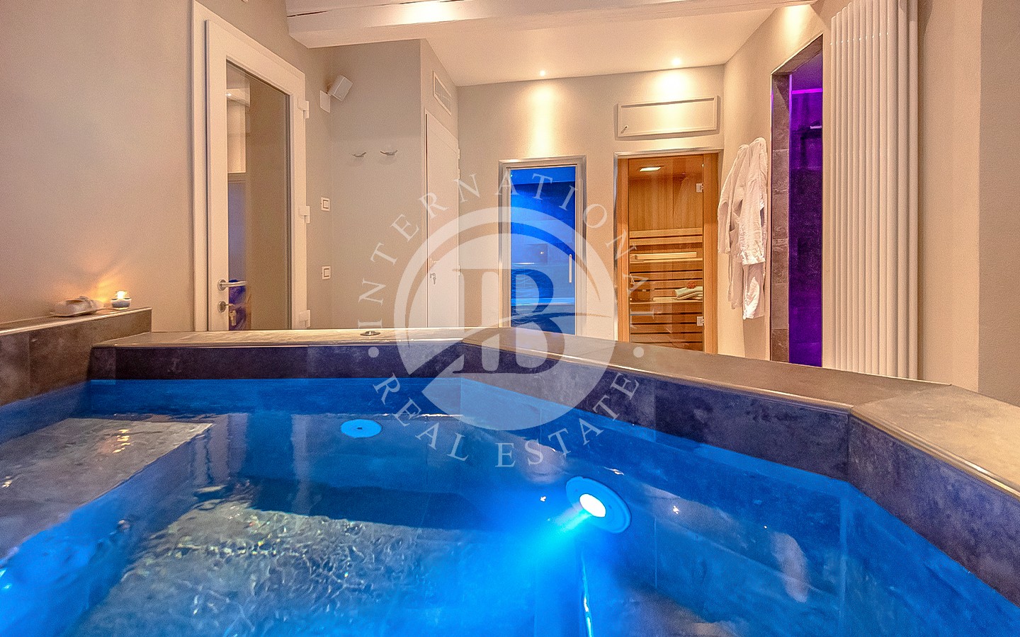 li raffinati, soffitti con travi a vista e pavimenti in cotto. I 13 bagni offrono finiture di alta qualità, combinando elementi tradizionali con moderne comodità. La villa ospita anche una spa con sauna e bagno turco, perfetta per momenti di relax. L'area ristorante e le ampie aree comuni sono ideali per eventi e ricevimenti, offrendo un ambiente accogliente e sofisticato.