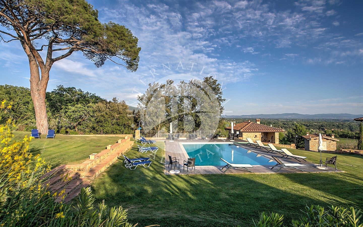 Il casale è circondato da un ampio terreno di sette ettari, suddiviso tra uliveti e un rigoglioso bosco. Una splendida piscina con solarium offre una vista mozzafiato sulle colline circostanti, rendendo l’ambiente esterno perfetto per trascorrere momenti di relax in totale privacy. I diversi spazi all'aperto, come i giardini curati e l'area barbecue, aggiungono ulteriori opportunità per vivere l’outdoor in ogni stagione. Garage e parcheggi, sia coperti che scoperti, completano l'offerta.