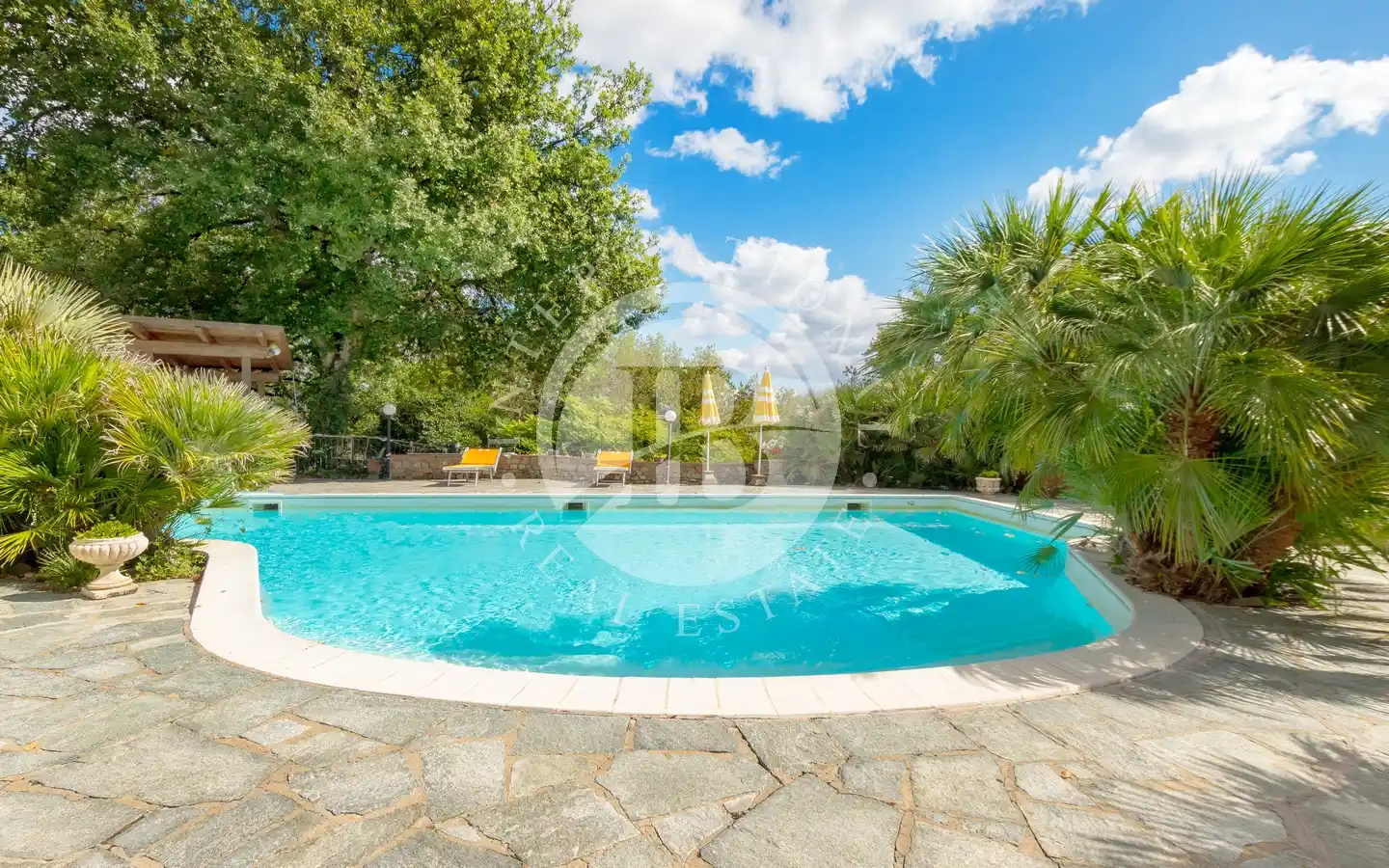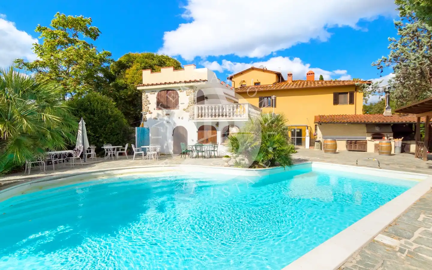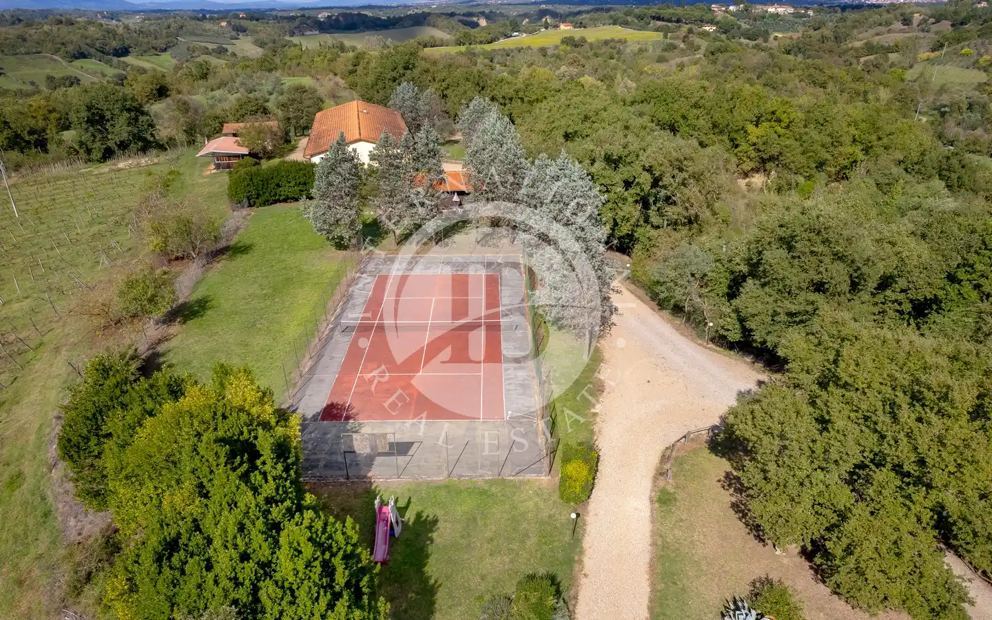 Gli spazi esterni offrono aree dedicate al relax e al tempo libero: giardini e parchi, piscina coperta con idromassaggio, piscina all’aperto, campo da tennis, aree attrezzate con barbecue e forno a legna, pergole ombreggiate e angoli per pranzi conviviali. Il terreno comprende uliveti, vigneti, bosco e seminativi, creando un perfetto equilibrio tra natura, produttività e bellezza paesaggistica. Una cantina è già pronta per la conservazione dei vini prodotti in loco, ideale per gli amanti dell’enologia.