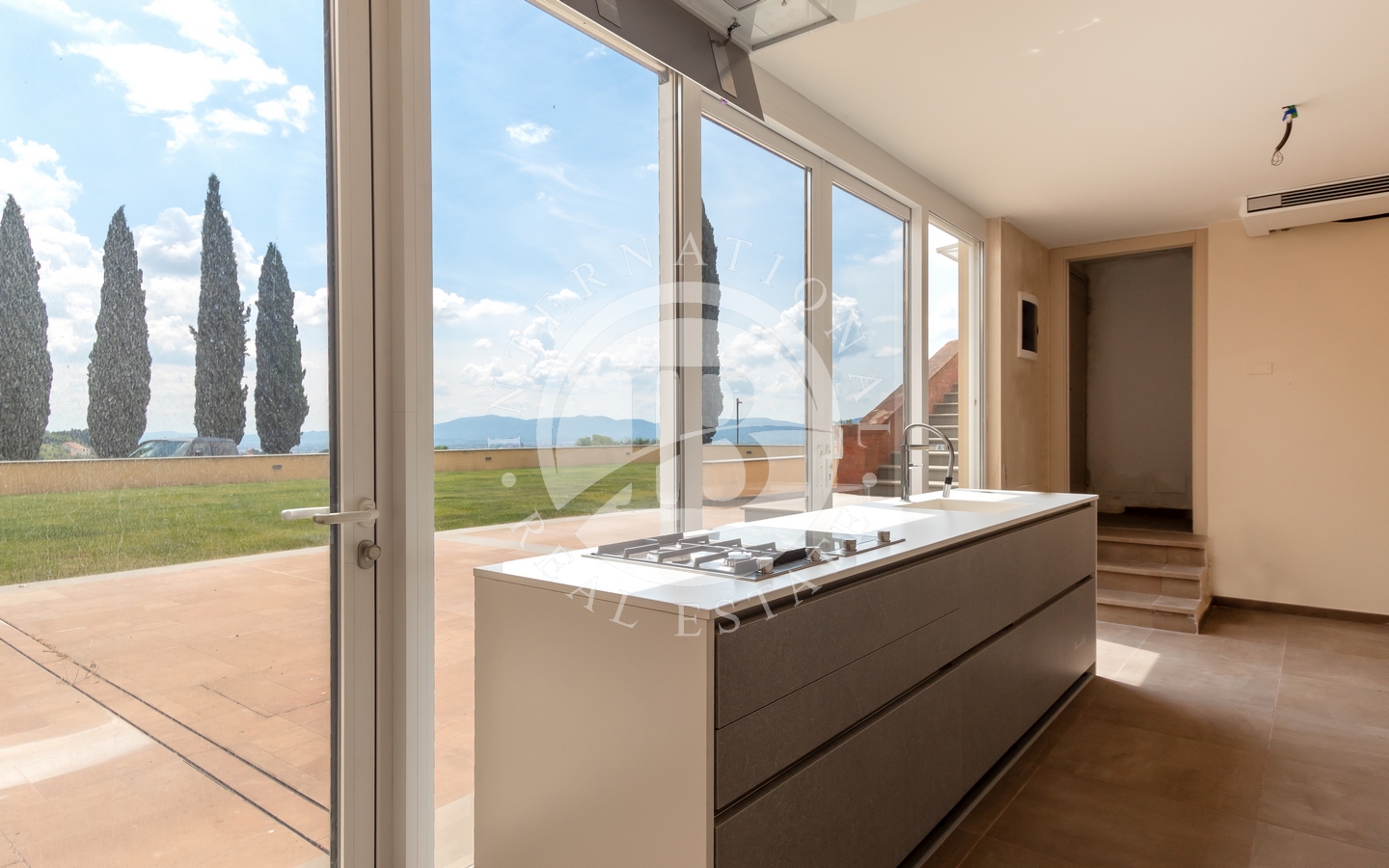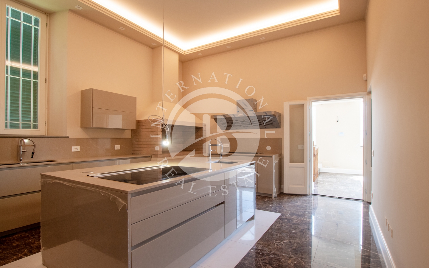 All'ingresso, attraversando una terrazza decorata con una preziosa fontana, si accede all'ampia zona giorno caratterizzata da imponenti altezze, ampie vetrate e una cucina moderna.