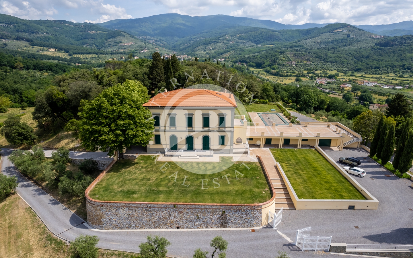 Immersa nella tranquillità delle colline pistoiesi, questa tenuta storica offre una superficie di circa 1.800 mq, completamente ristrutturata nel 2021. Circondata da un vasto terreno di 22 ettari ricco di uliveti e alberi da frutto, la proprietà comprende una villa principale, due appartamenti con giardino, la casa del custode e un cascinale, oltre a una piscina panoramica che domina il paesaggio circostante. La tenuta gode di una vista a 360 gradi che spazia fino a Pistoia. La villa principale, con una superficie di 995 mq su tre liv…
