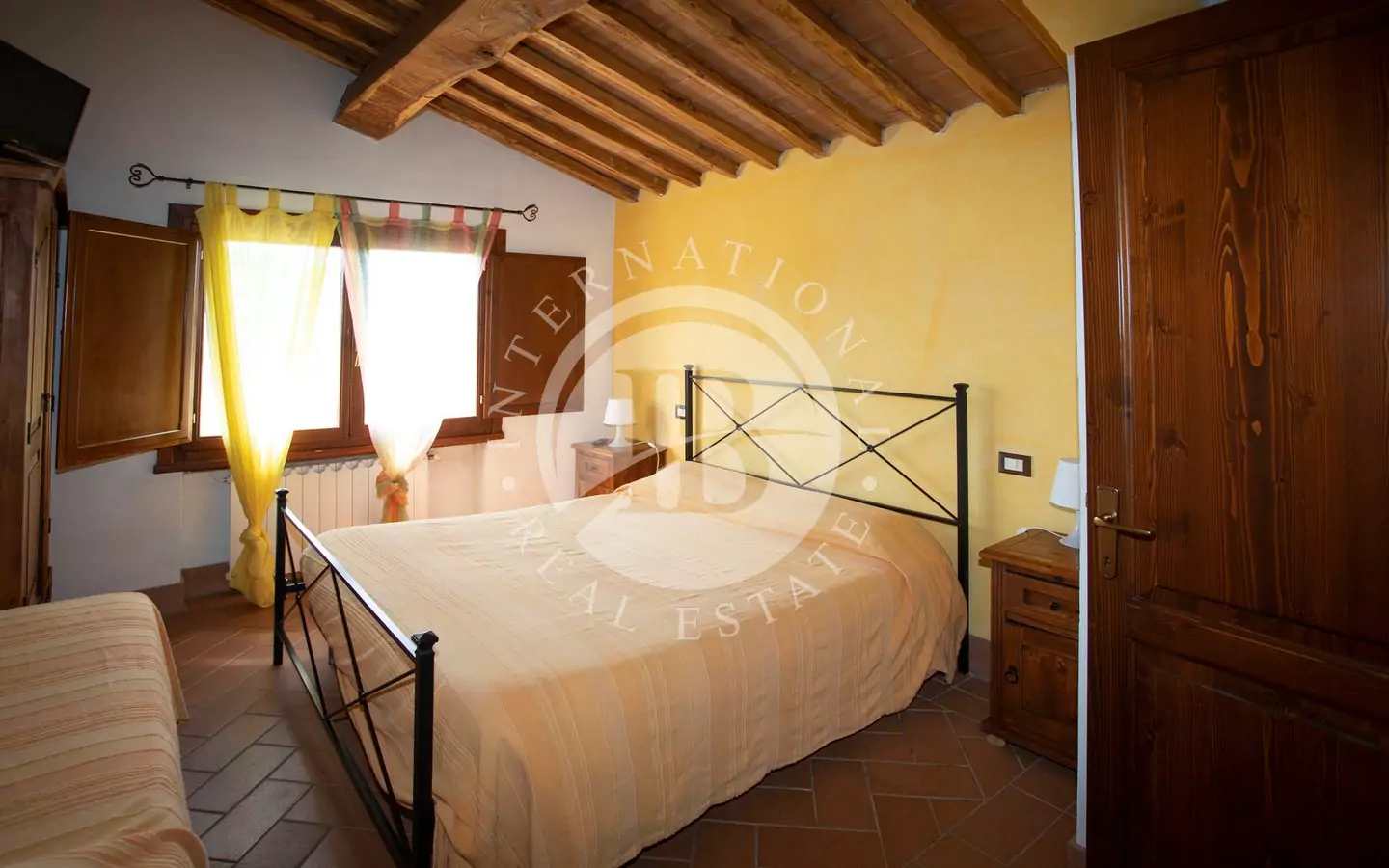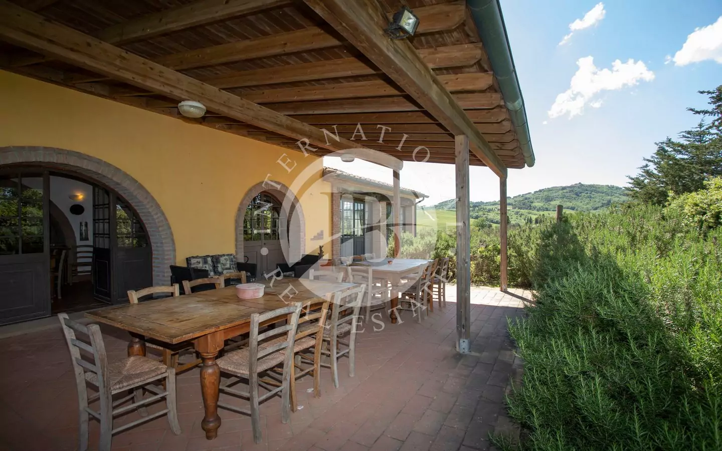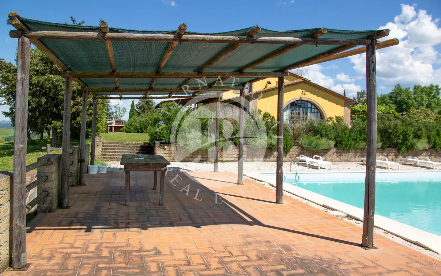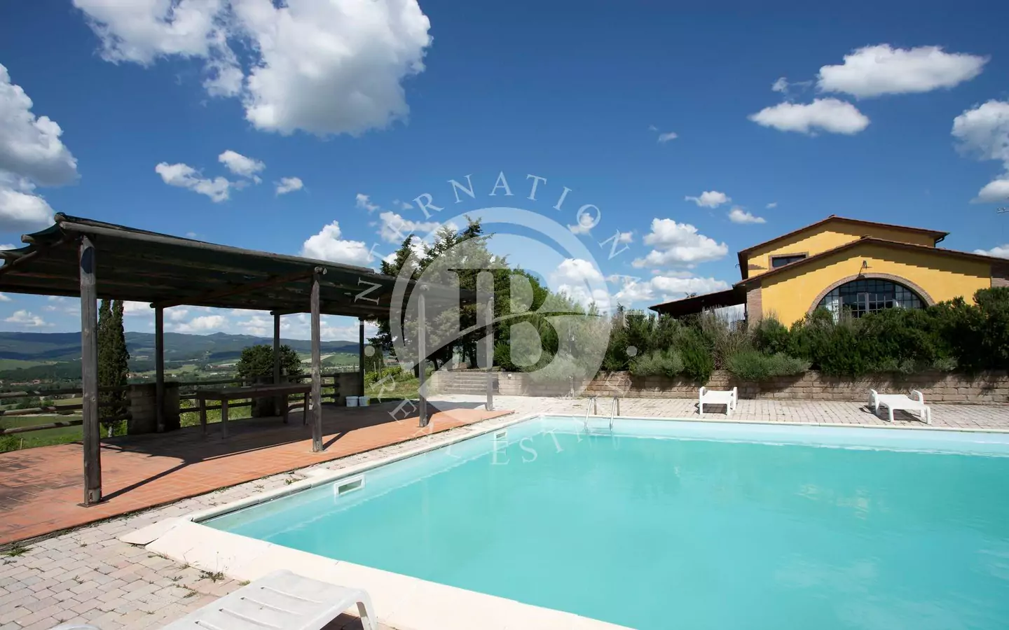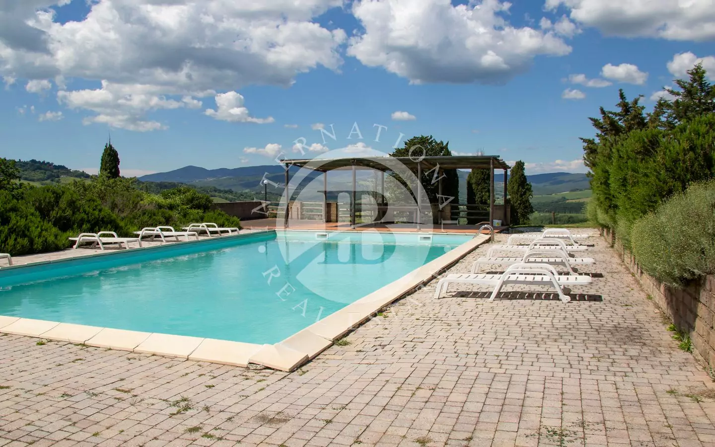 odere di una vista panoramica sulla vallata e sui paesi di Volterra,Querceto e Casaglia,cucina abitabile attrezzata con elettrodomestici di ultima generazione, e due servizi igienici; al piano superiore troviamo quattro camere matrimoniali e bagno.La proprietà è circondata da 5.000mq di terreno piantumato parte ad oliveta e parte a vigna e comprende un locale tecnico, due carraie, una piscina di ml. 7,2 x 14,40 con solarium e relativo locale tecnico seminterrato di circa 65mq.