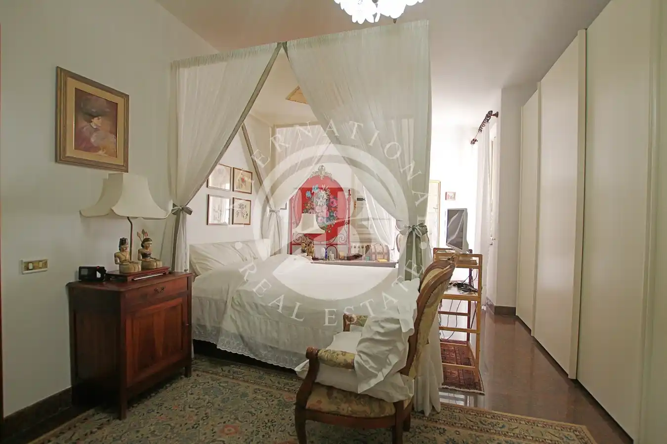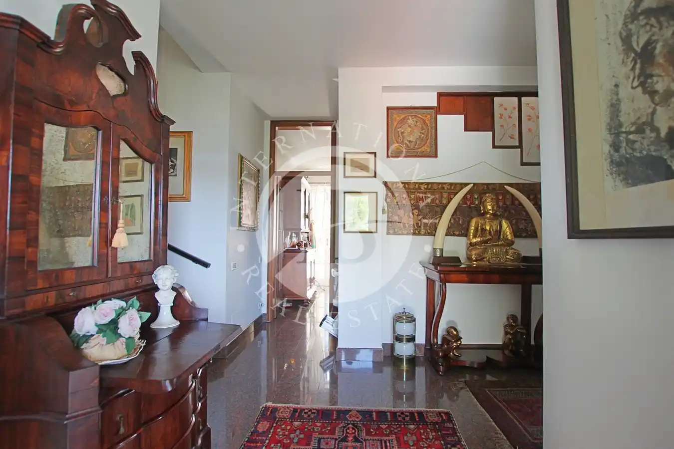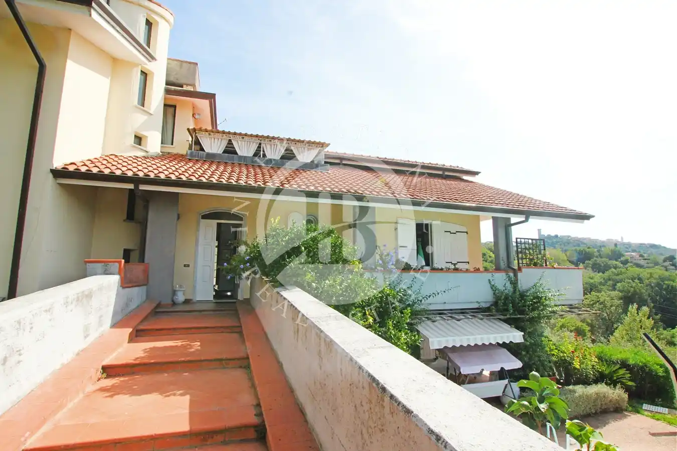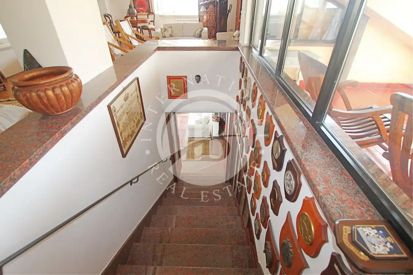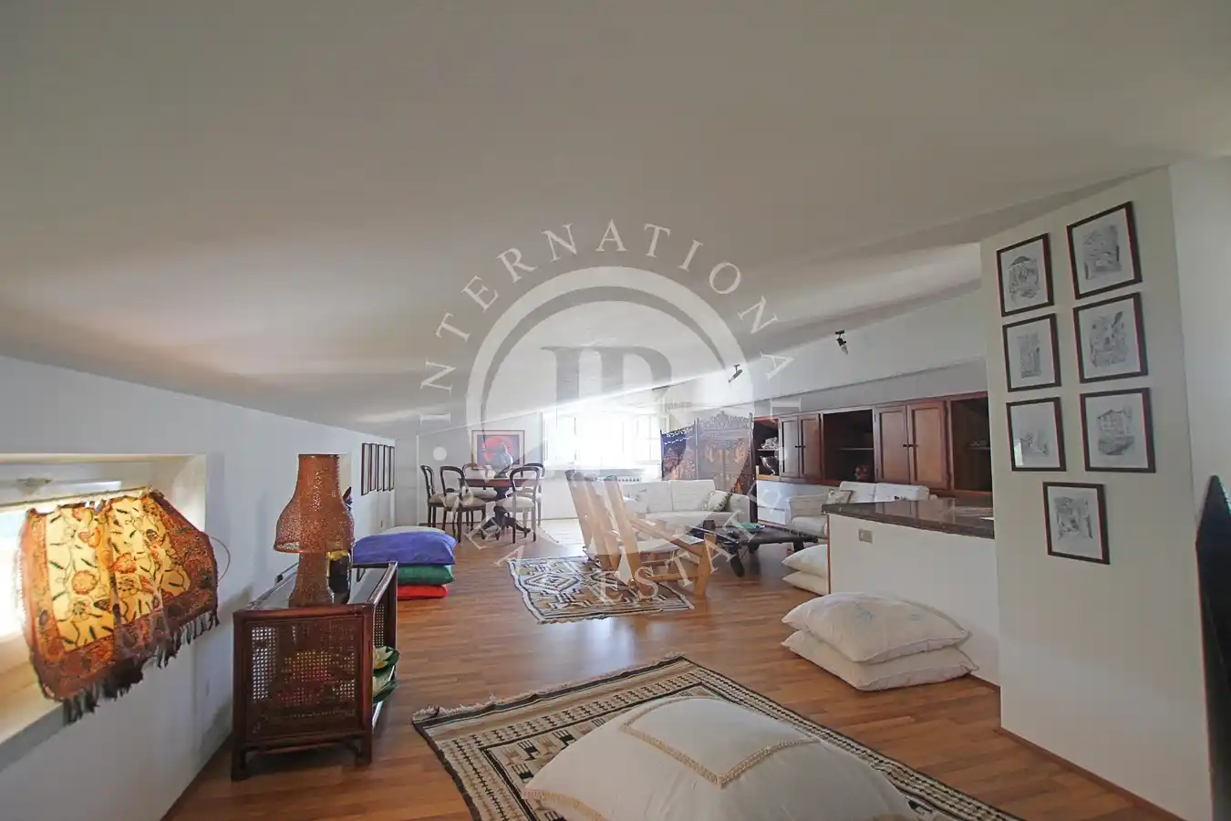 Il secondo ingresso, quello principale, accede al piano terra composto da grande zona living arredata con mobili di pregio, una cucina, un bagno di servizio, una camera matrimoniale con bagno en-suite, due camere e un bagno. Dal soggiorno si accede, poi, al primo piano mansardato dove si trova un soggiorno, una cucina abitabile, un bagno e una camera matrimoniale. A completare il piano una terrazza a tasca e una terrazza a tetto panoramica, accessibile grazie ad una scala a chiocciola in muratura.