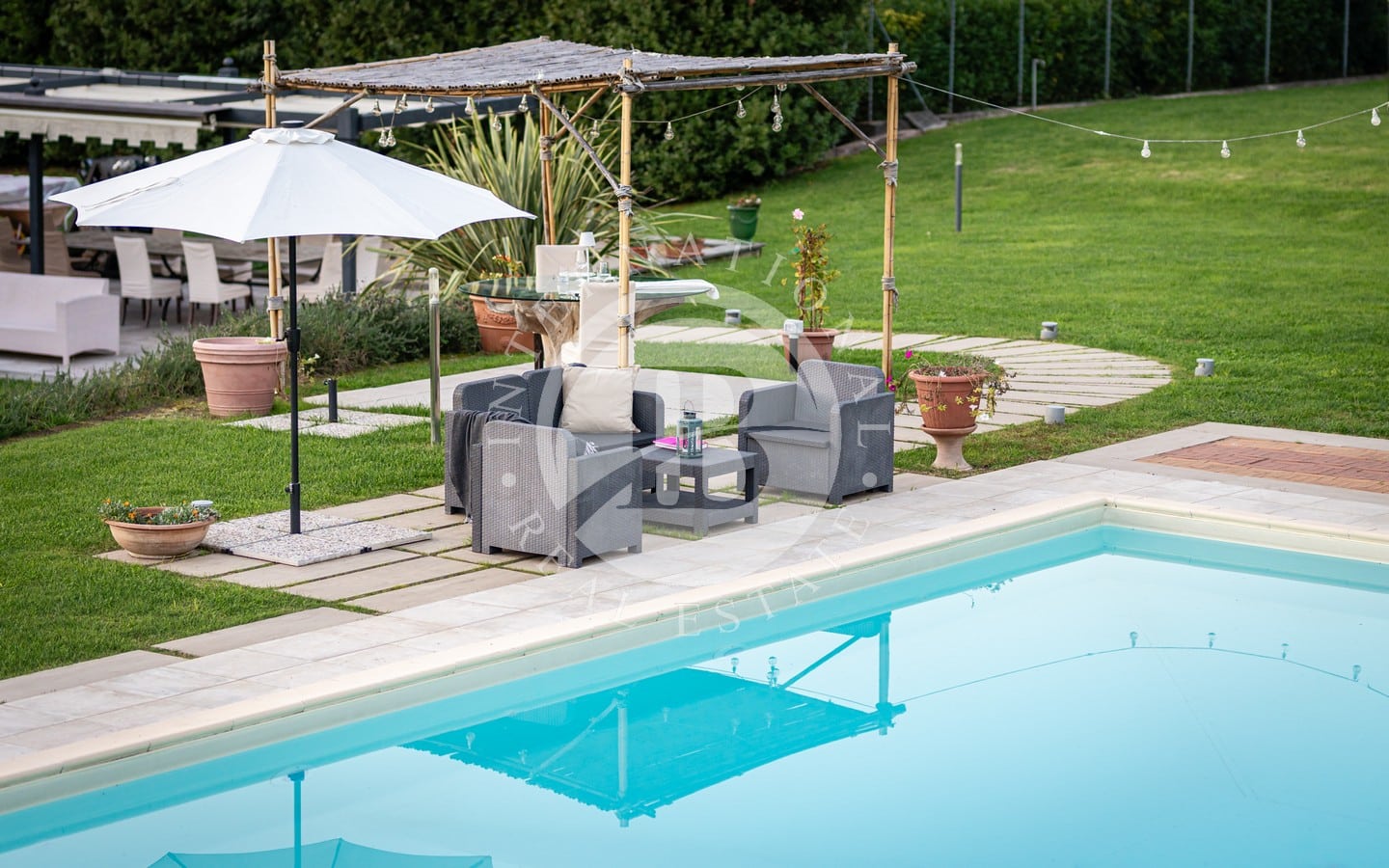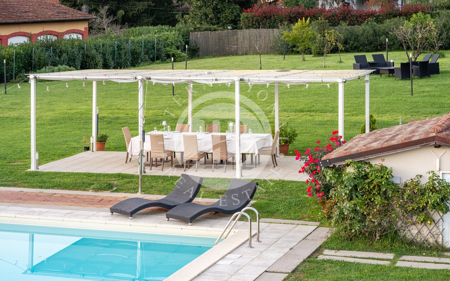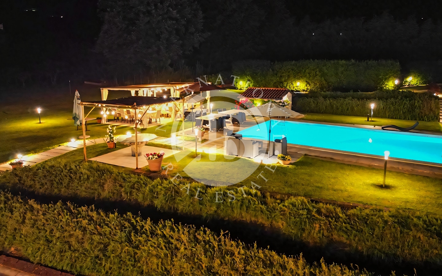 Circondata da un giardino di 5000 mq, la villa offre un ambiente esterno incantevole. La grande piscina è il cuore della zona outdoor, perfettamente integrata con lo spogliatoio adiacente e una veranda con pergolato e forno a legna, ideali per cene all'aperto. Il giardino, con i suoi ampi spazi verdi e alberi da frutto, è impreziosito da un sistema di illuminazione esterna che crea un’atmosfera magica nelle serate estive. La dependance offre totale privacy agli ospiti, mentre i numerosi posti auto esterni garantiscono praticità.