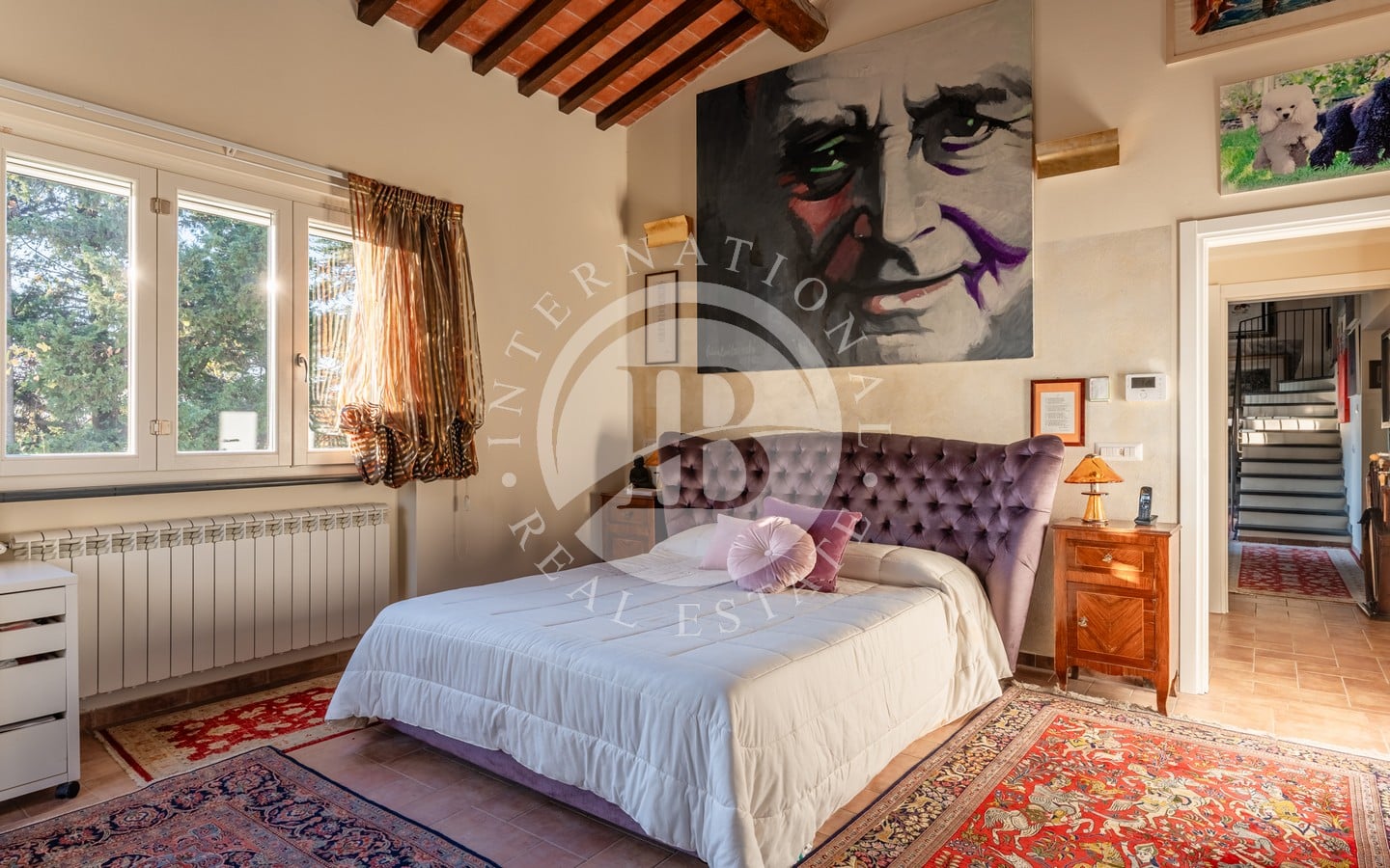 a pranzo e un doppio soggiorno luminoso, arricchito da vetrate panoramiche che si affacciano sulla veranda. La camera padronale, situata al piano terra, è un rifugio di lusso con accesso diretto all'esterno e bagno privato. Al primo piano, due camere da letto con relativi bagni si aprono su una terrazza coperta di 45 mq, ideale come spazio per il relax o per un ufficio privato con vista mozzafiato sulle colline toscane. Un ampio seminterrato offre ulteriore spazio versatile, perfetto per una palestra, sala giochi o alloggio per il personale.