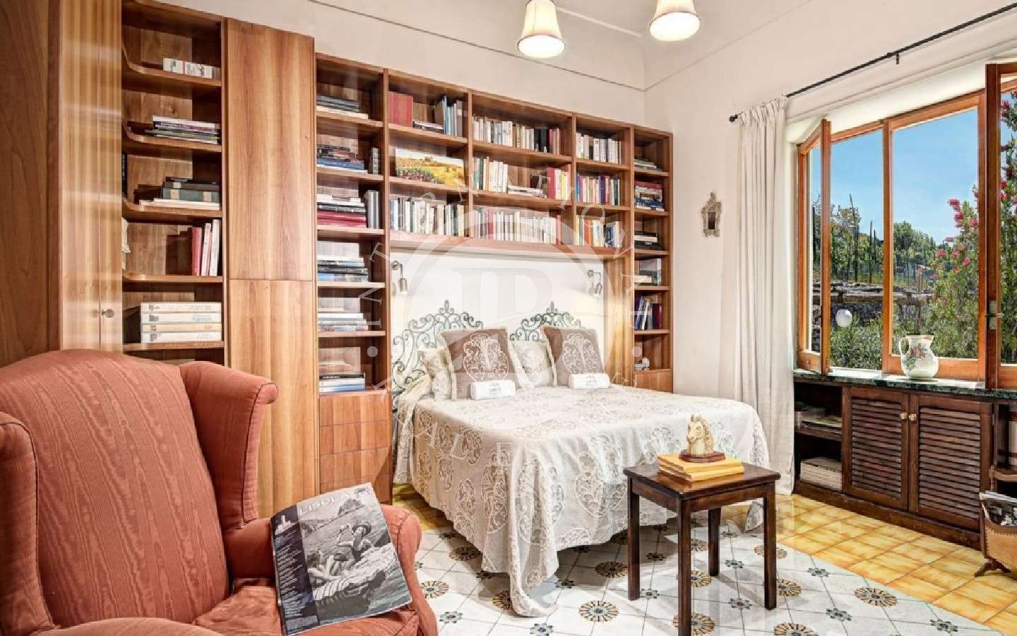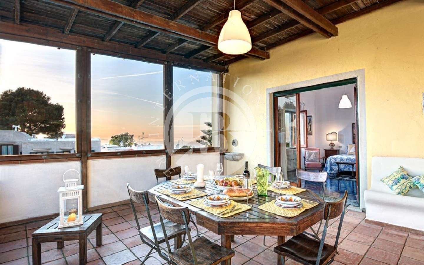 erosa con zona pranzo, due camere da letto e due bagni. Salendo la scala interna, che offre una vista mozzafiato sulla piscina, si raggiunge il primo piano. Qui, quattro camere da letto, tre bagni e una vasta terrazza coperta con pergolato offrono una vista mozzafiato sul mare e sull'Isola d'Ischia.