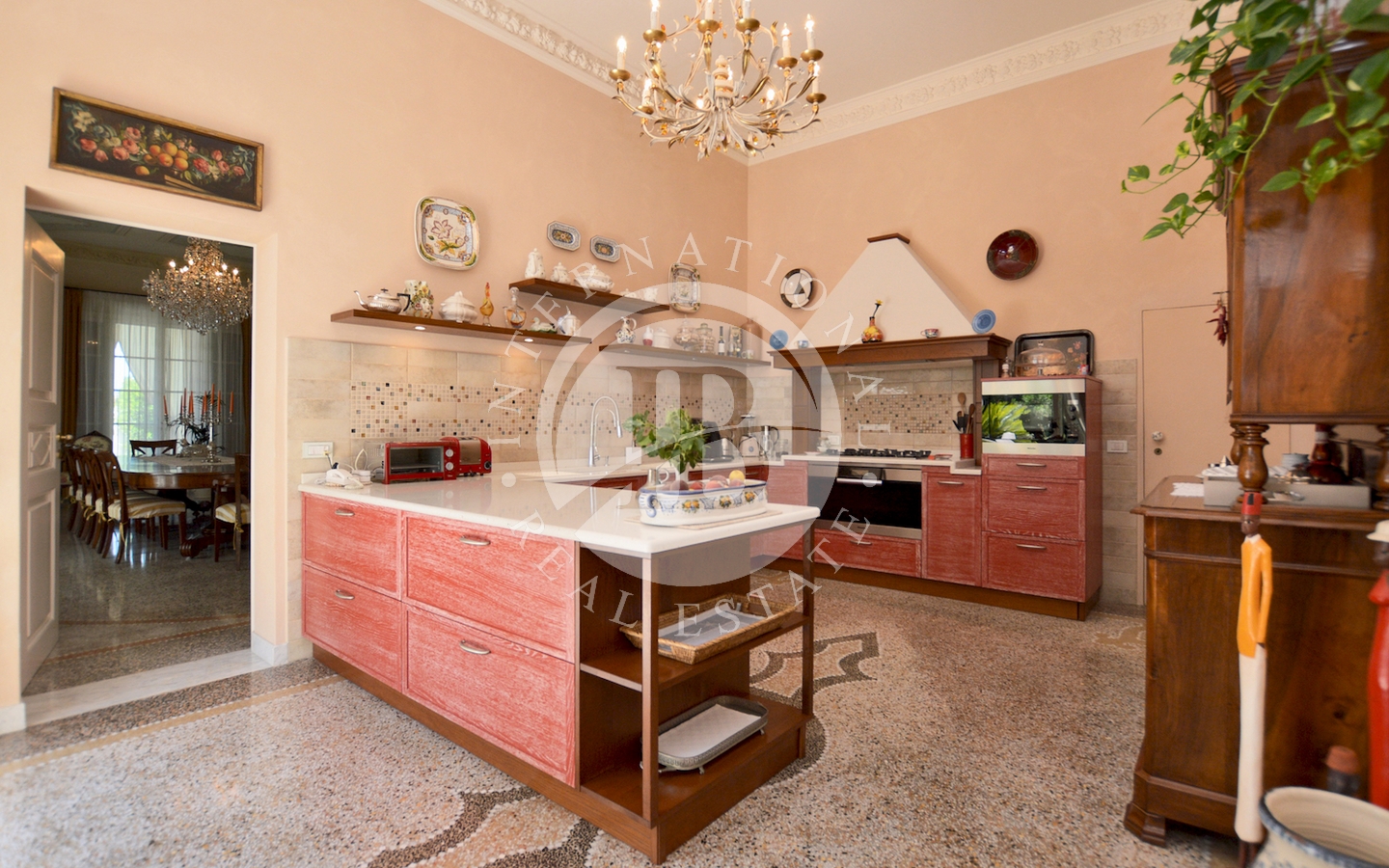 Al piano rialzato di circa 330 mq, di questa lussuosa proprietà in vendita, trovano collocazione il signorile atrio di ingresso con la magnifica scala in marmo bianco, il doppio salone a giorno, la sala da pranzo con camino d’epoca e l’ampia cucina, collegati esternamente al loggiato ed alle terrazze, tramite le grandi porte finestre.