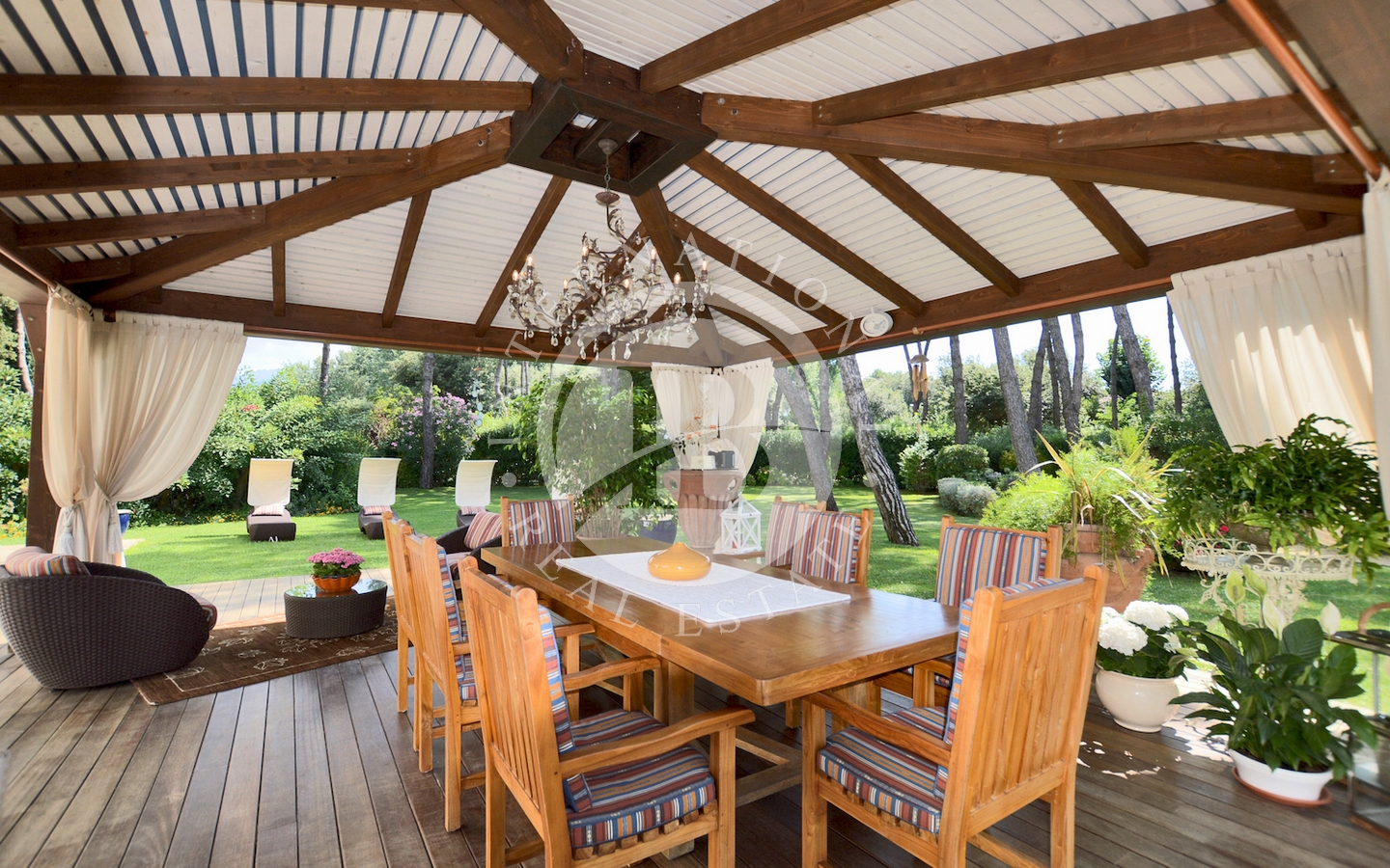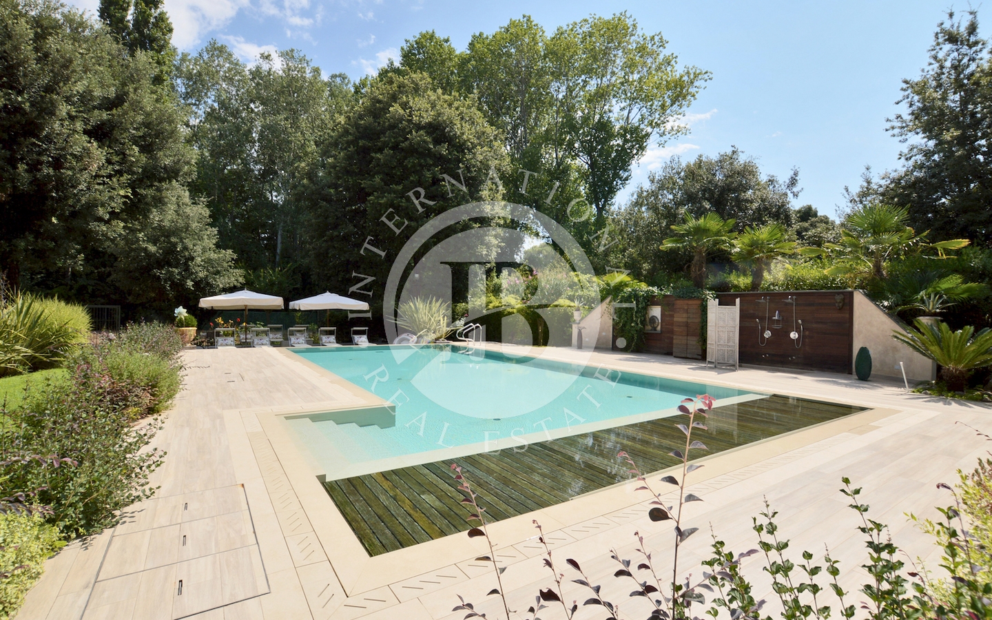 Esternamente, nel curato parco di 1 ettaro, con doppio accesso carraio, troviamo una funzionale area per il parcheggio al coperto di 8 autovetture, un grazioso gazebo limitrofo alla zona pranzo e cucina, un campo da tennis di dimensioni regolari da ripristinare, una grande casetta in legno di circa 15 mq, per il ricovero di arredi a attrezzature da giardino con annesso spogliatoio e bagno con doccia a servizio della splendida piscina di mt 12 x 6 con relative e appartate aree prendisole.