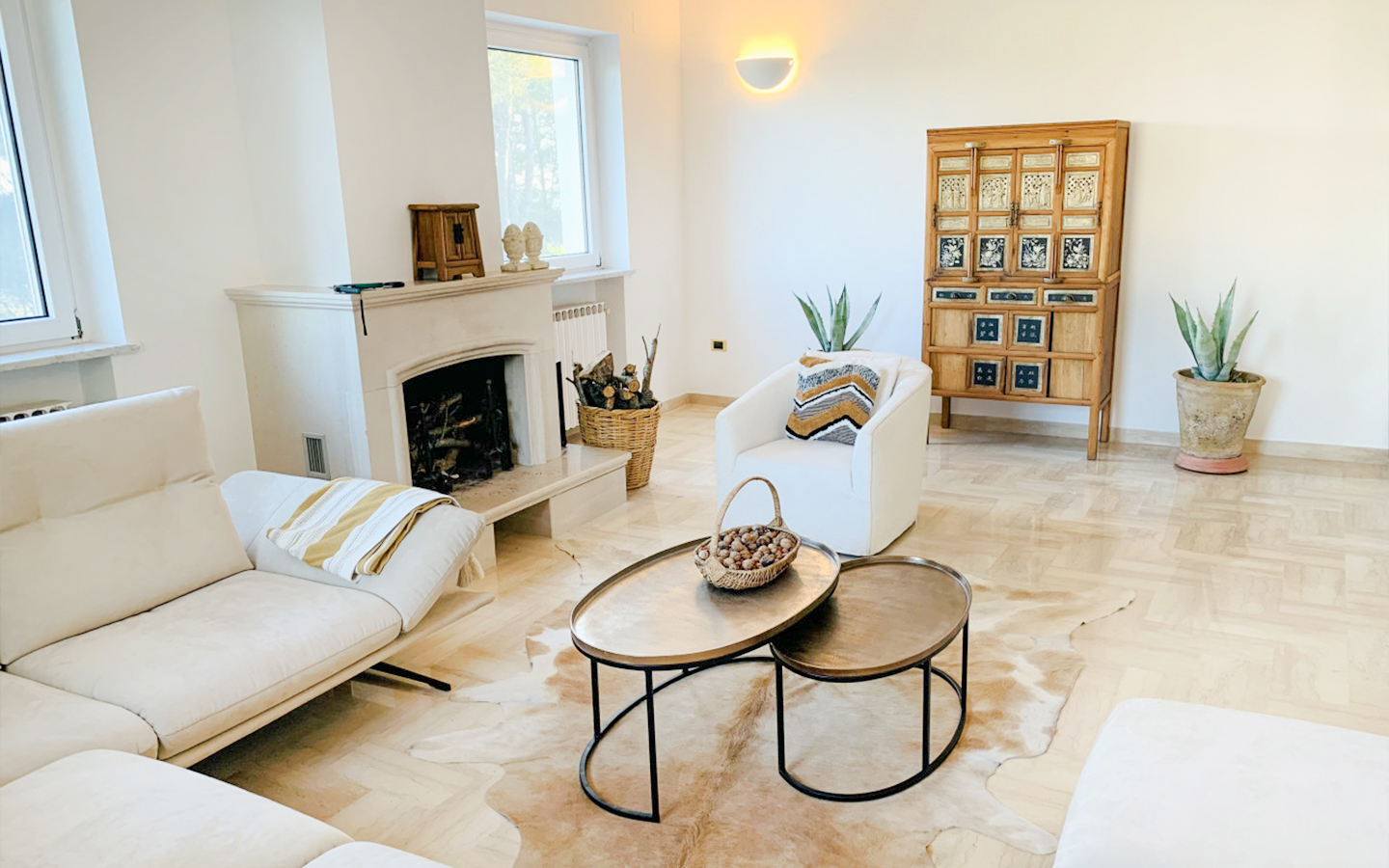 osità degli spazi e la luminosità diffusa. L’area living si compone di due soggiorni con camino che offrono un’atmosfera calda e accogliente, mentre l’ampia terrazza coperta invita a godere della quiete dell’ambiente circostante. La cucina semi-aperta, recentemente rinnovata e completa di forno tradizionale per pizza, si presta a momenti conviviali di grande qualità. La zona notte include tre camere da letto ben dimensionate e due bagni moderni, oltre a un ulteriore servizio per gli ospiti.