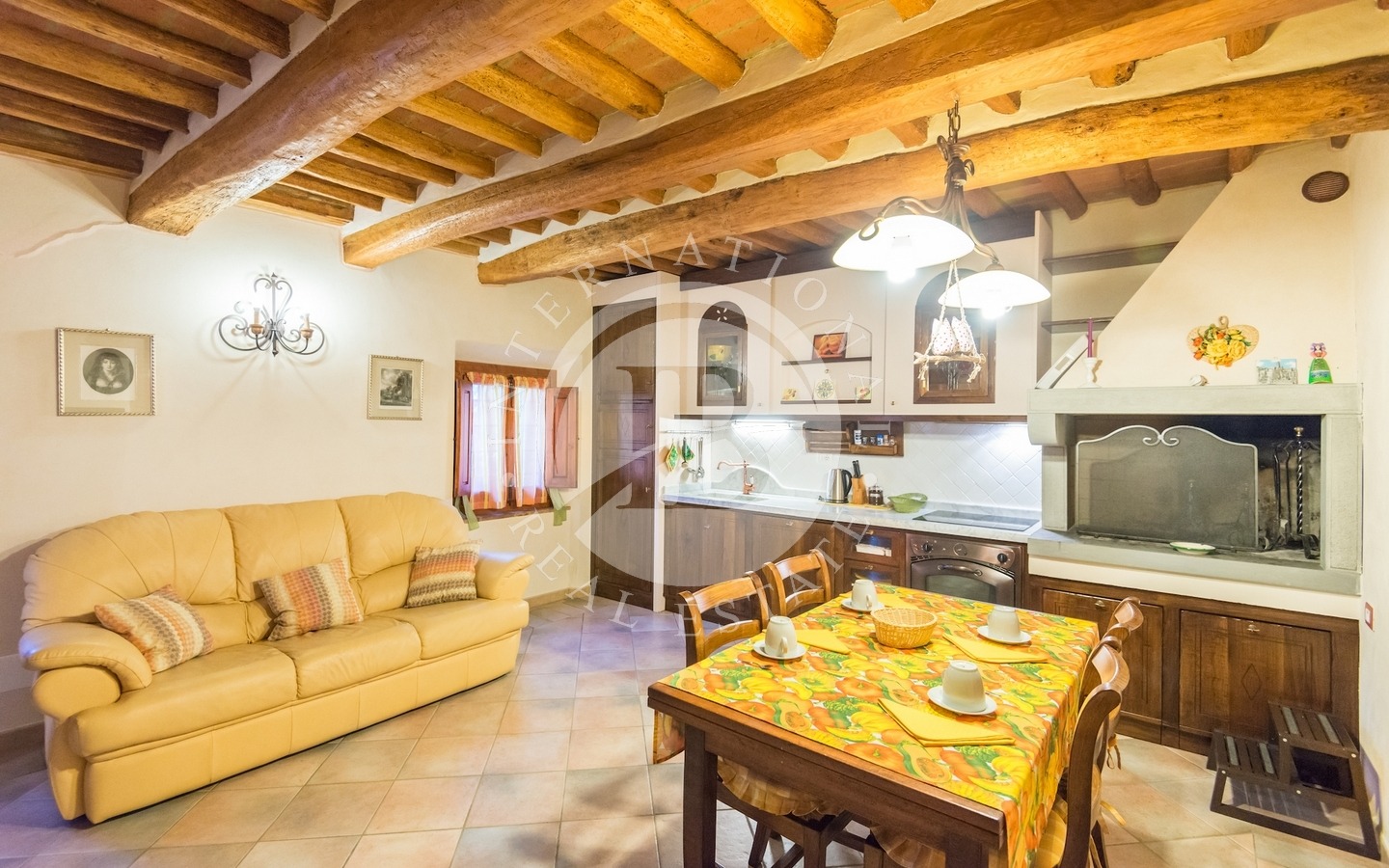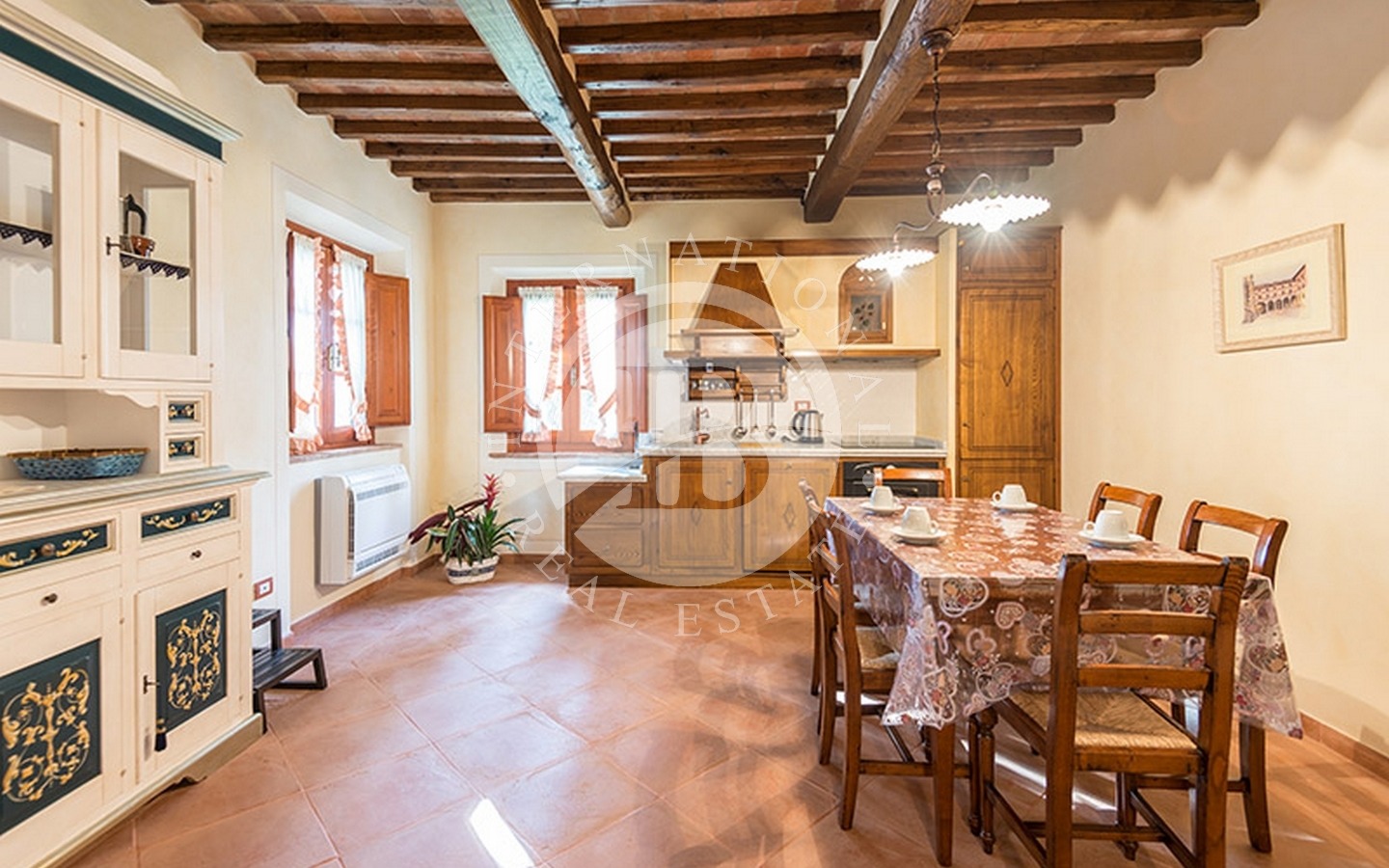In linea con lo stile rustico Toscano, ogni appartamento di questa villa è stato ristrutturato con materiali di pregio come i pavimenti in cotto fatto a mano dell’Impruneta, raffinati mobili in legno artigianali e soffitti con travi in legno del XIX secolo sapientemente rinnovati.
