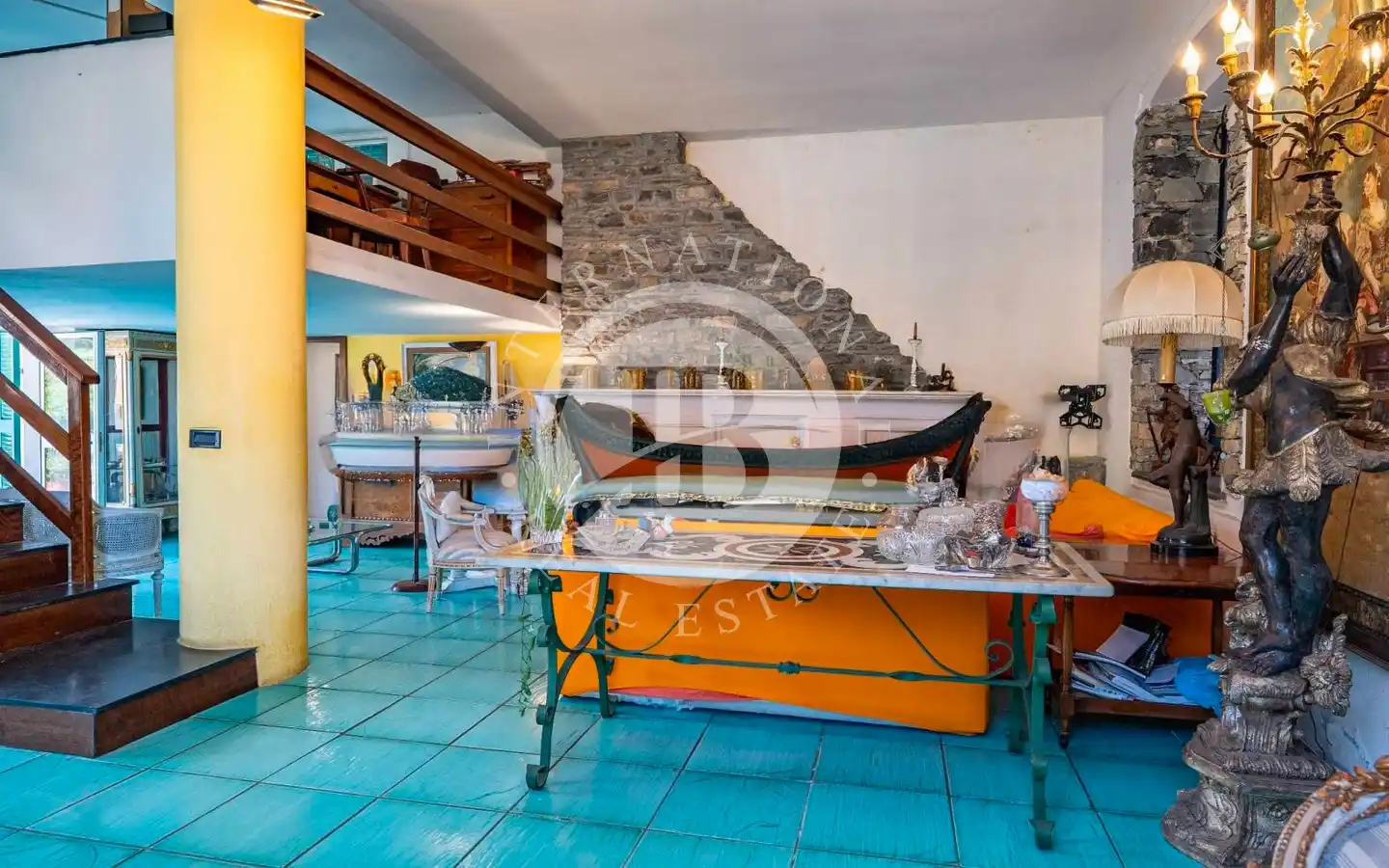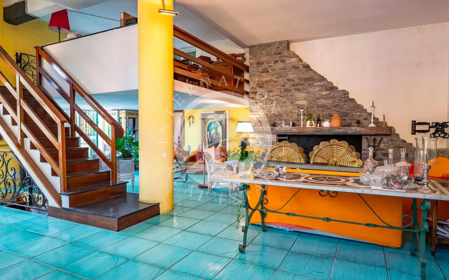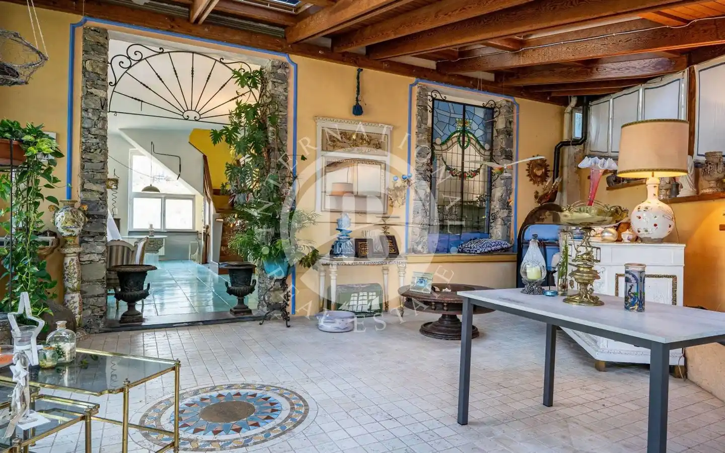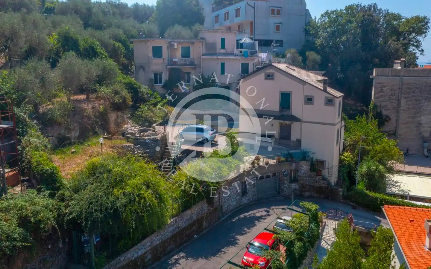 e da strada privata con cancello elettrico e videosorveglianza, mentre un secondo ingresso pedonale conduce da Salita Sant’Anna. Completa la parte esterna un ampio box auto di circa 70 mq, collegato direttamente alla casa e dotato di riscaldamento e acqua, in passato utilizzato come taverna, che offre quindi molteplici possibilità di impiego.