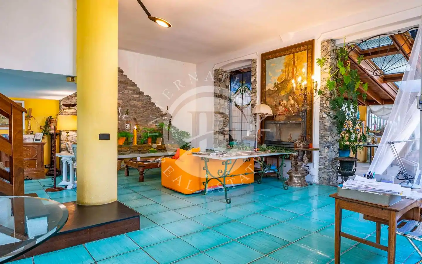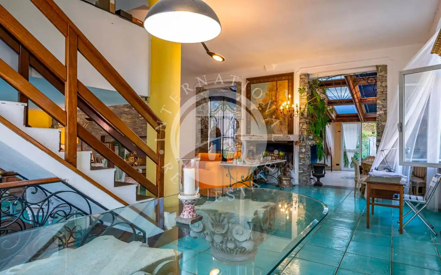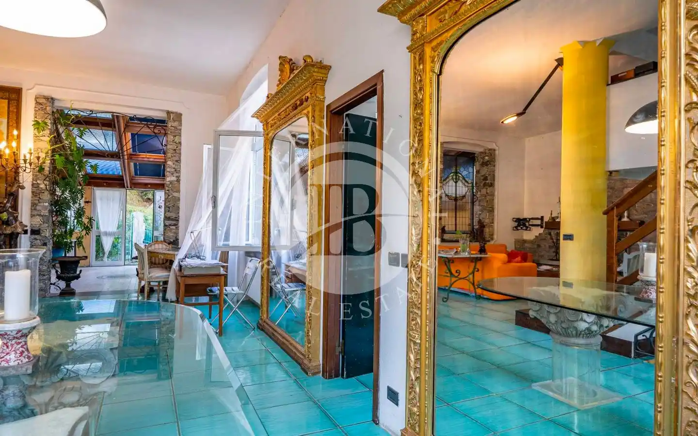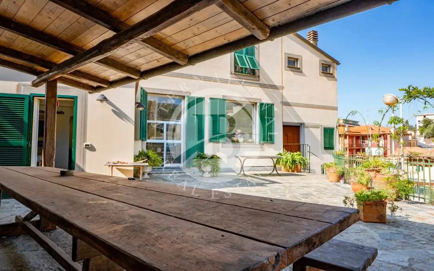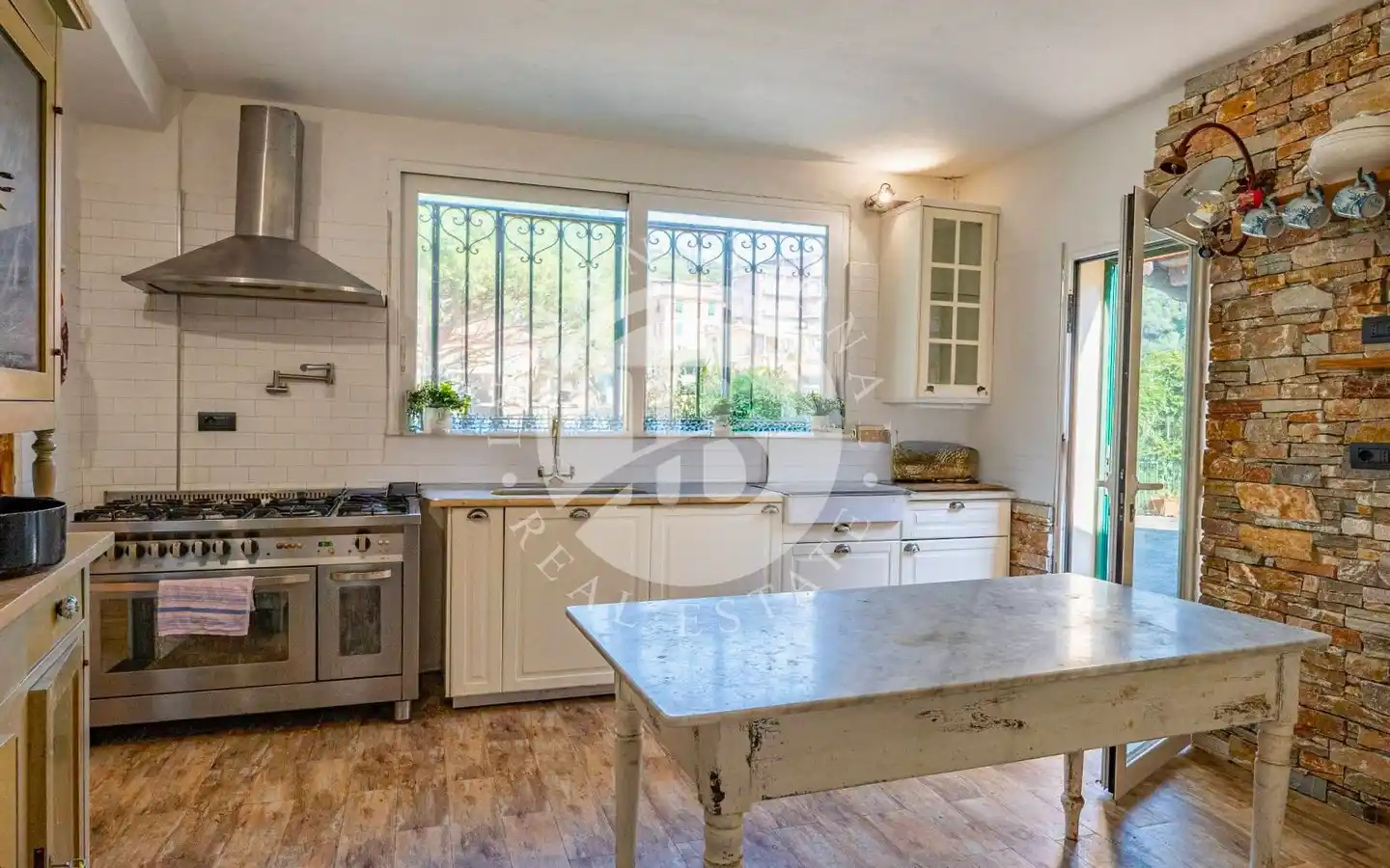 e da strada privata con cancello elettrico e videosorveglianza, mentre un secondo ingresso pedonale conduce da Salita Sant’Anna. Completa la parte esterna un ampio box auto di circa 70 mq, collegato direttamente alla casa e dotato di riscaldamento e acqua, in passato utilizzato come taverna, che offre quindi molteplici possibilità di impiego.