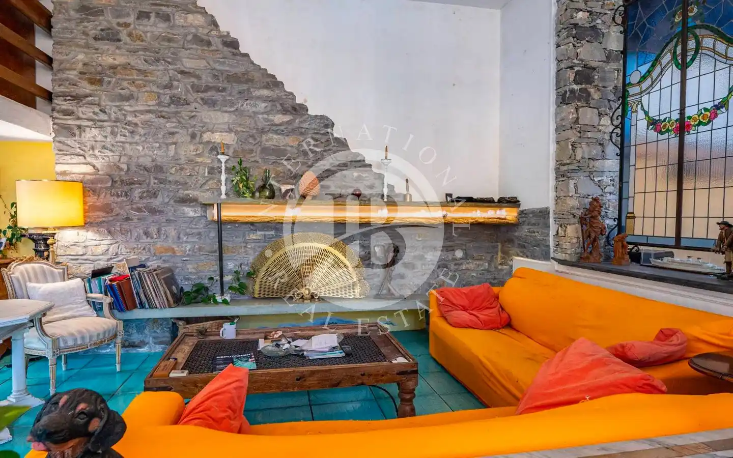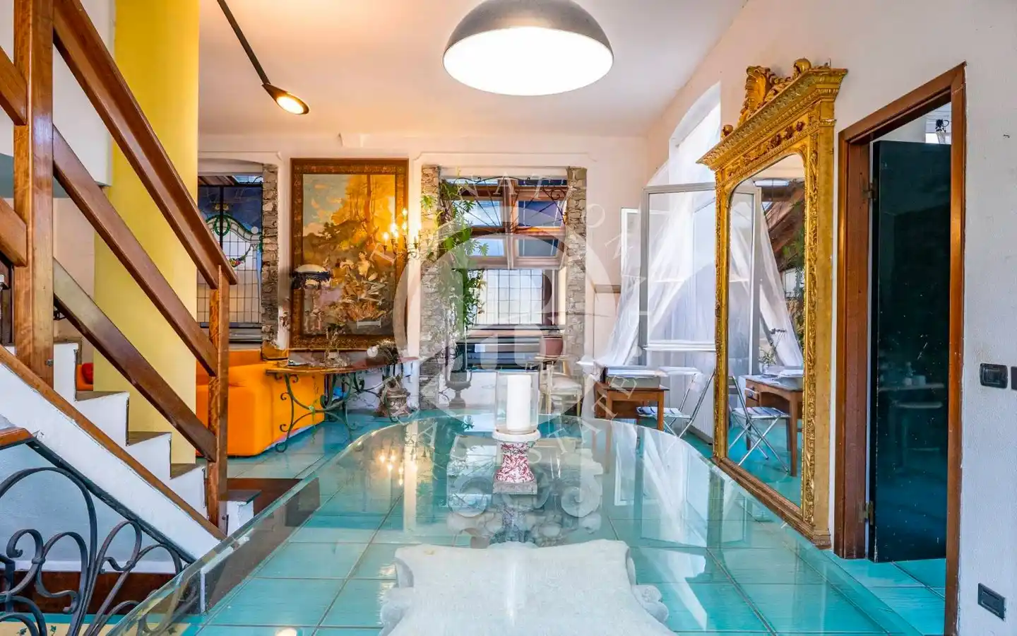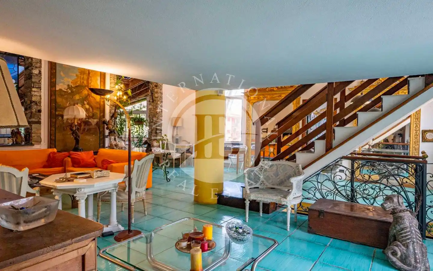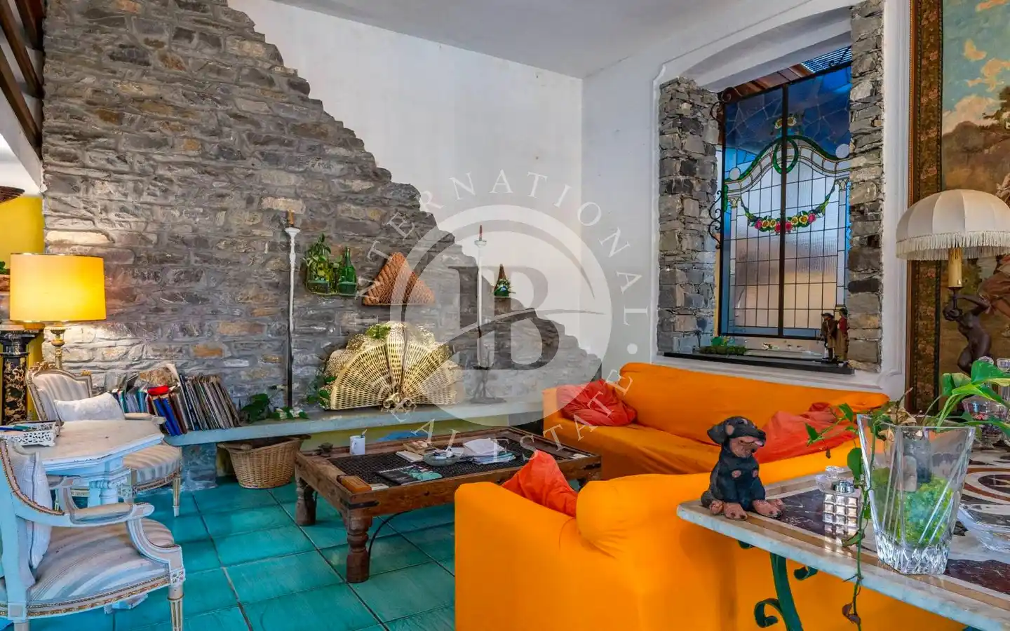 e da strada privata con cancello elettrico e videosorveglianza, mentre un secondo ingresso pedonale conduce da Salita Sant’Anna. Completa la parte esterna un ampio box auto di circa 70 mq, collegato direttamente alla casa e dotato di riscaldamento e acqua, in passato utilizzato come taverna, che offre quindi molteplici possibilità di impiego.