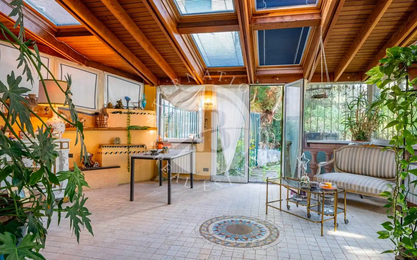 Gli interni sono organizzati in maniera funzionale. Al piano terra si trovano una spaziosa cucina abitabile con locale dispensa, un bagno di servizio e una zona armadi. L’ampio salone, con soffitti alti quattro metri e camino a legna, rappresenta il cuore della casa ed è arricchito da un soppalco utilizzato come ufficio. Una veranda chiusa con ampie vetrate, tetto in legno e finestre Velux regala luminosità e continuità tra interno ed esterno, mentre un ulteriore ambiente, oggi adibito a studio di pittura, può essere facilmente trasformato in camera o sala hobby. Sempre al piano terra si trova anche il locale caldaia con accesso dall’esterno.