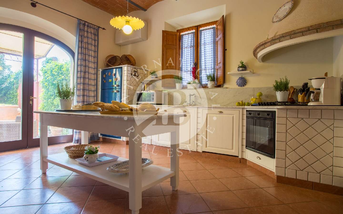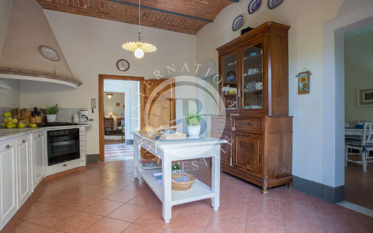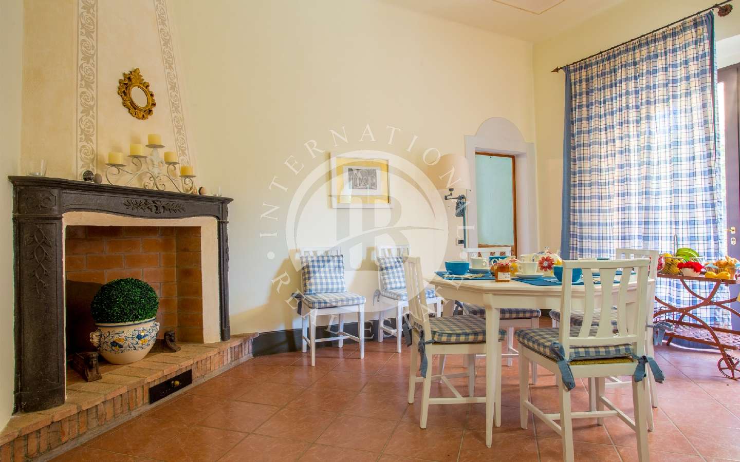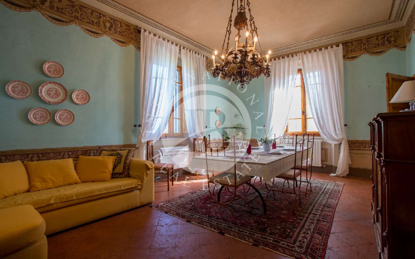 ettrodomestici, un ripostiglio, un soggiorno impreziosito da un elegante camino a legna in pietra lavica, circondato da divani, poltrone e TV satellitare. Troviamo anche una spaziosa sala affrescata con comodi divani, una sala da pranzo con un grande tavolo in cristallo e un'originale libreria, una camera doppia (con possibilità di trasformazione in matrimoniale) e un bagno completo di doccia.