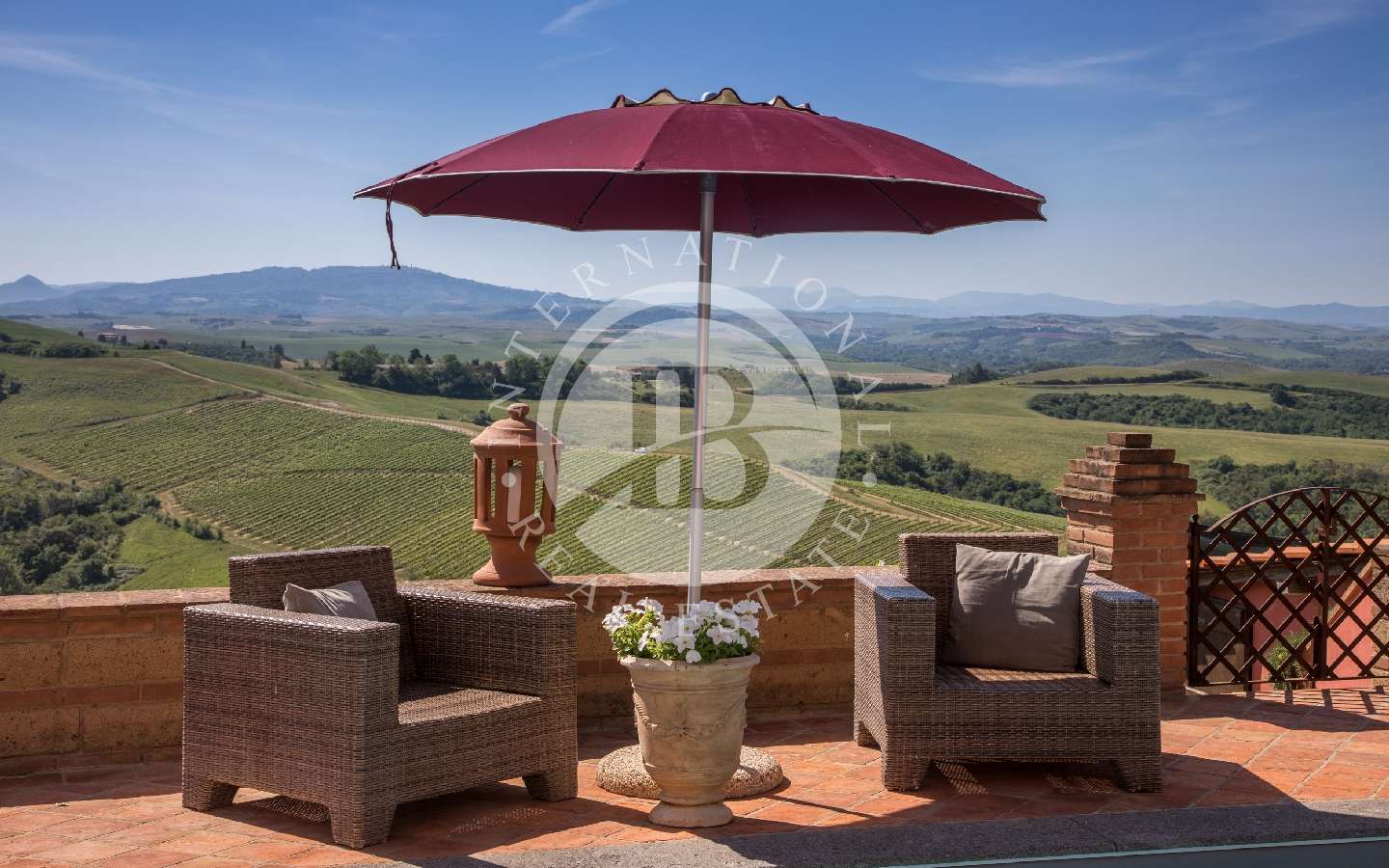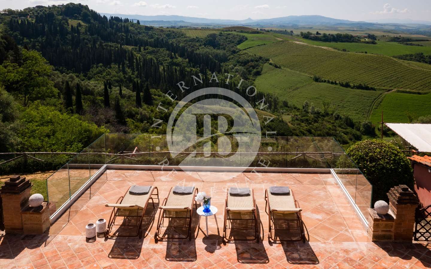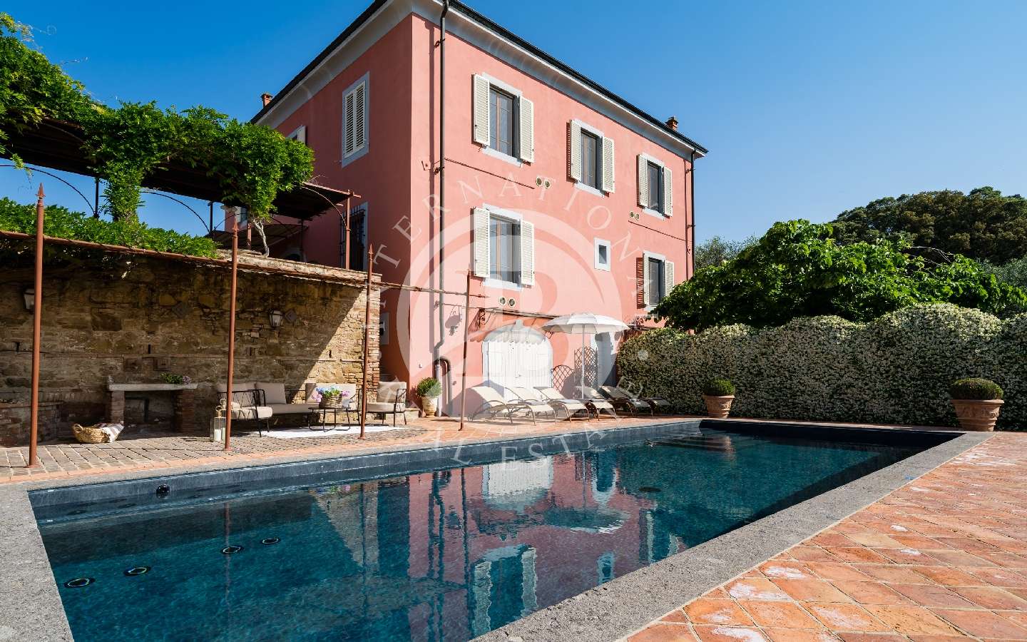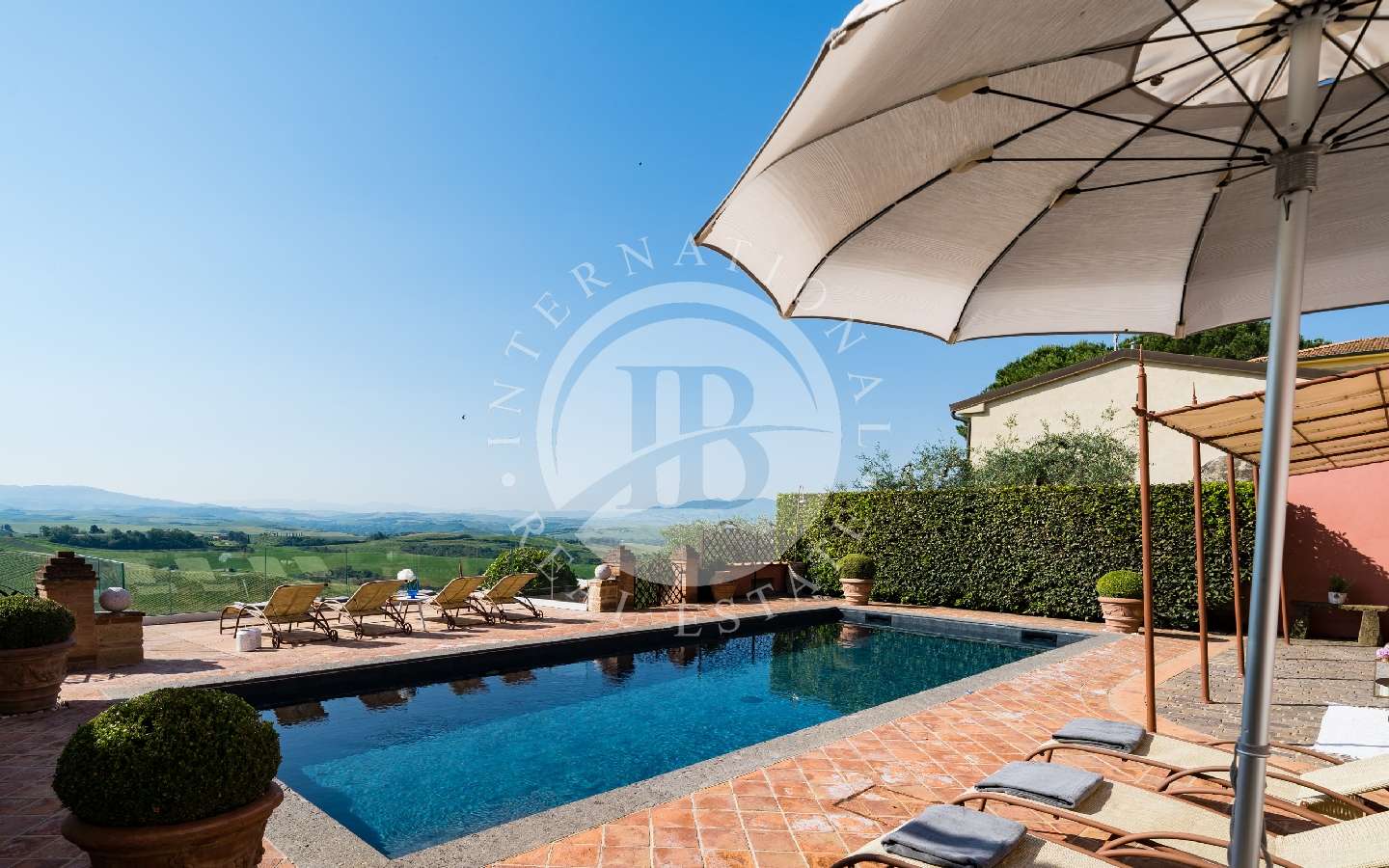 Da questo luogo, è possibile ammirare uno spettacolare scenario ricco di vigneti e colline che si estendono fino alla meravigliosa città di Volterra. Utilizzando una piccola scala in mattoni, si scende al sottostante giardino, caratterizzato da un maestoso tiglio. Al di là di questo giardino, protetta da un muro in tufo che garantisce assoluta privacy, si erge la piscina in posizione dominante, con acqua salata (dimensioni 12 x 4 x 1,30 metri con zona relax ad idromassaggio). La piscina è attrezzata con lettini, ombrelloni, e altro. Il terreno incluso nella vendita misura circa 6 ettari.