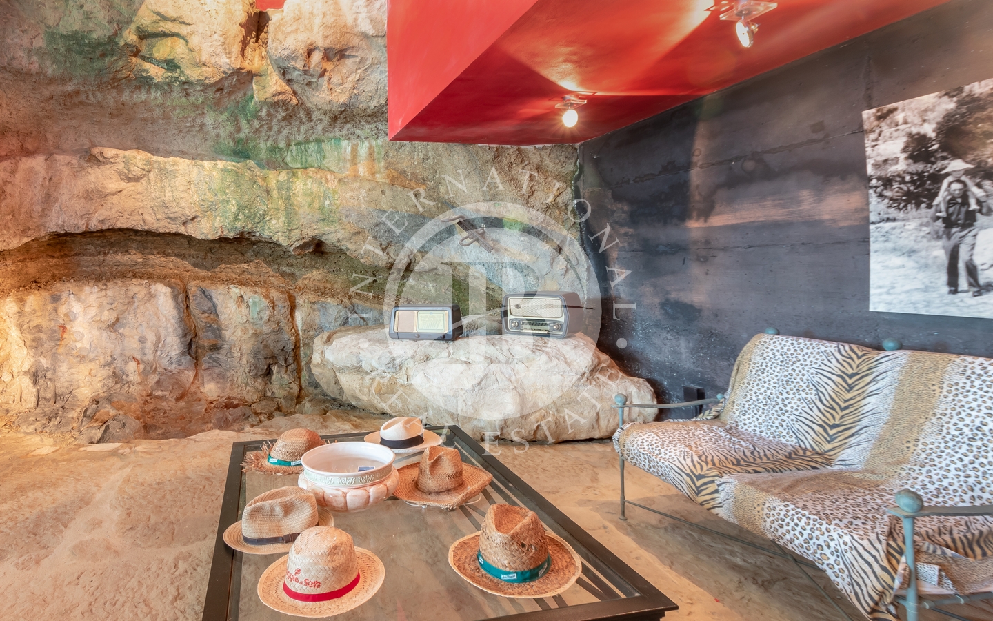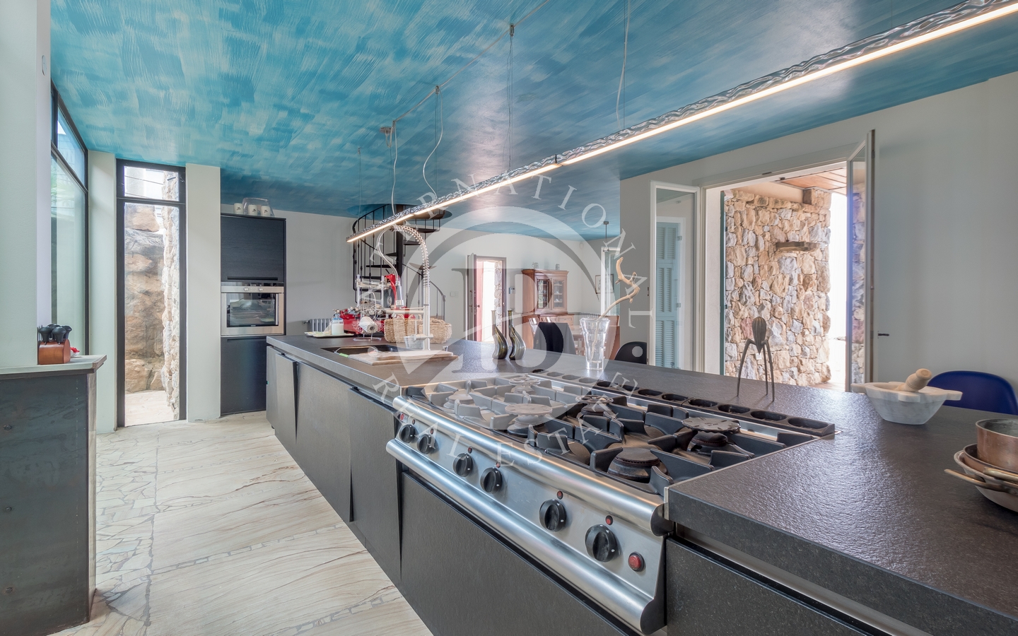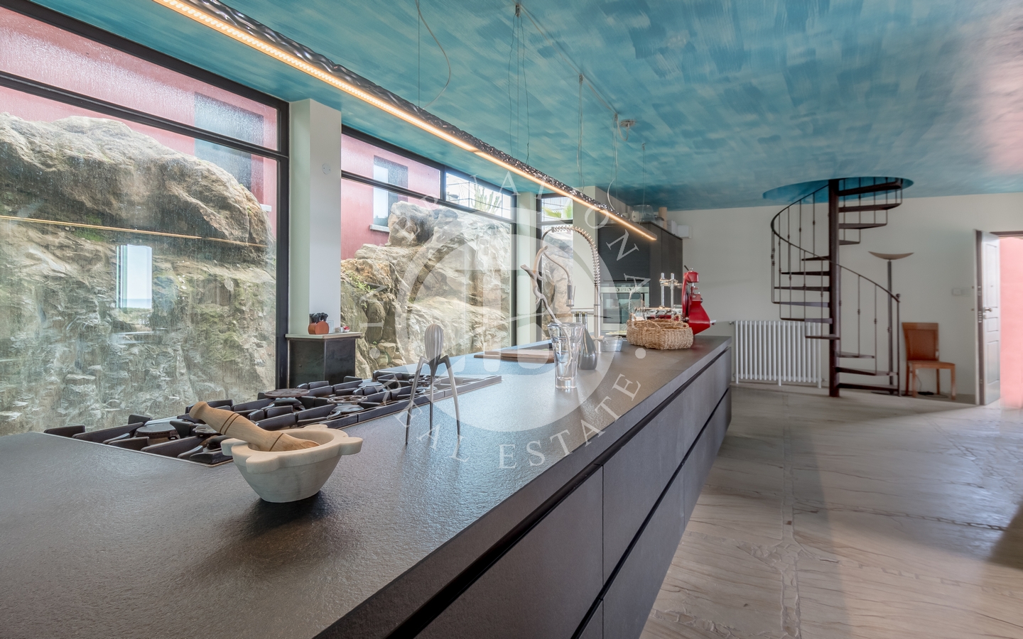 Gli spazi esterni includono una piscina a sfioro e una jacuzzi, entrambe affacciate sul golfo, oltre a un’area barbecue. La proprietà comprende inoltre una grotta in pietra naturale, valorizzata da un sistema di illuminazione studiato per esaltarne il carattere distintivo.